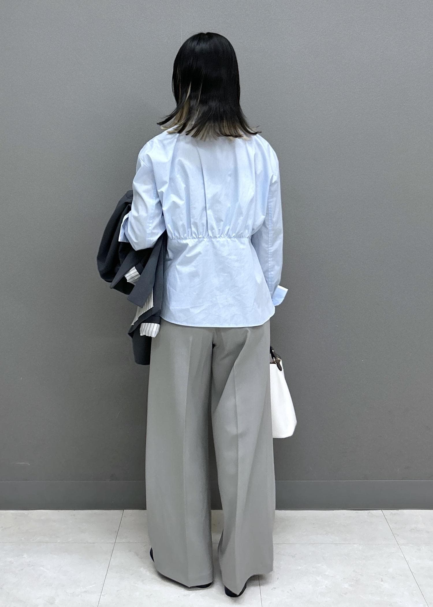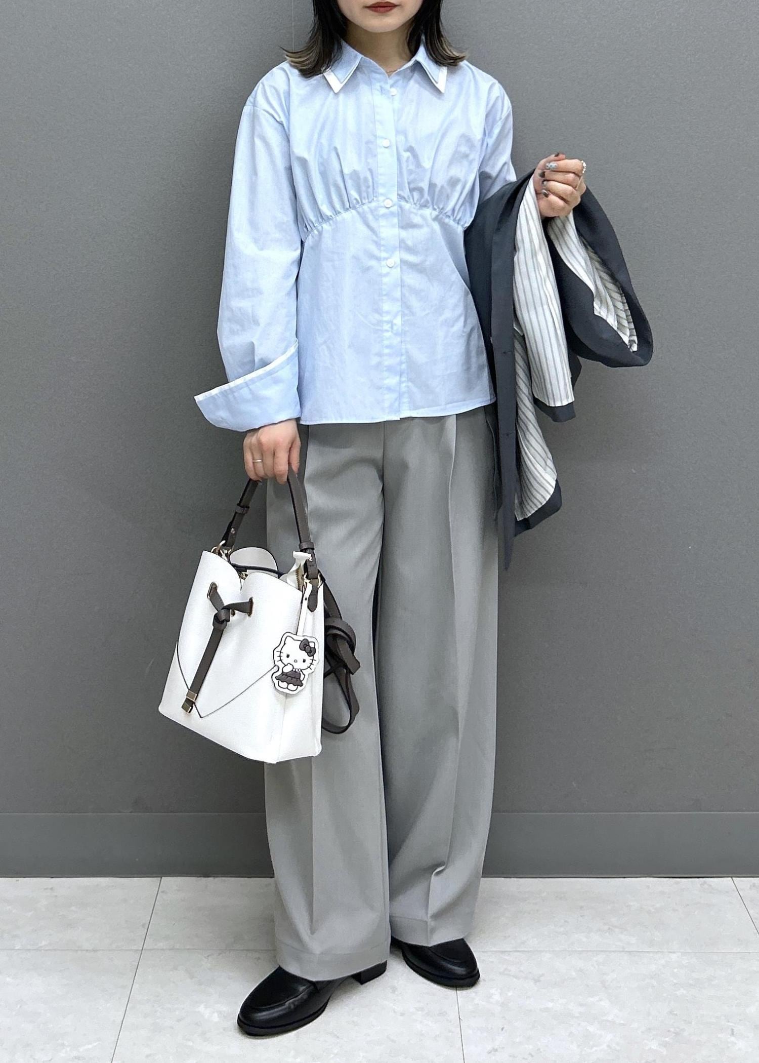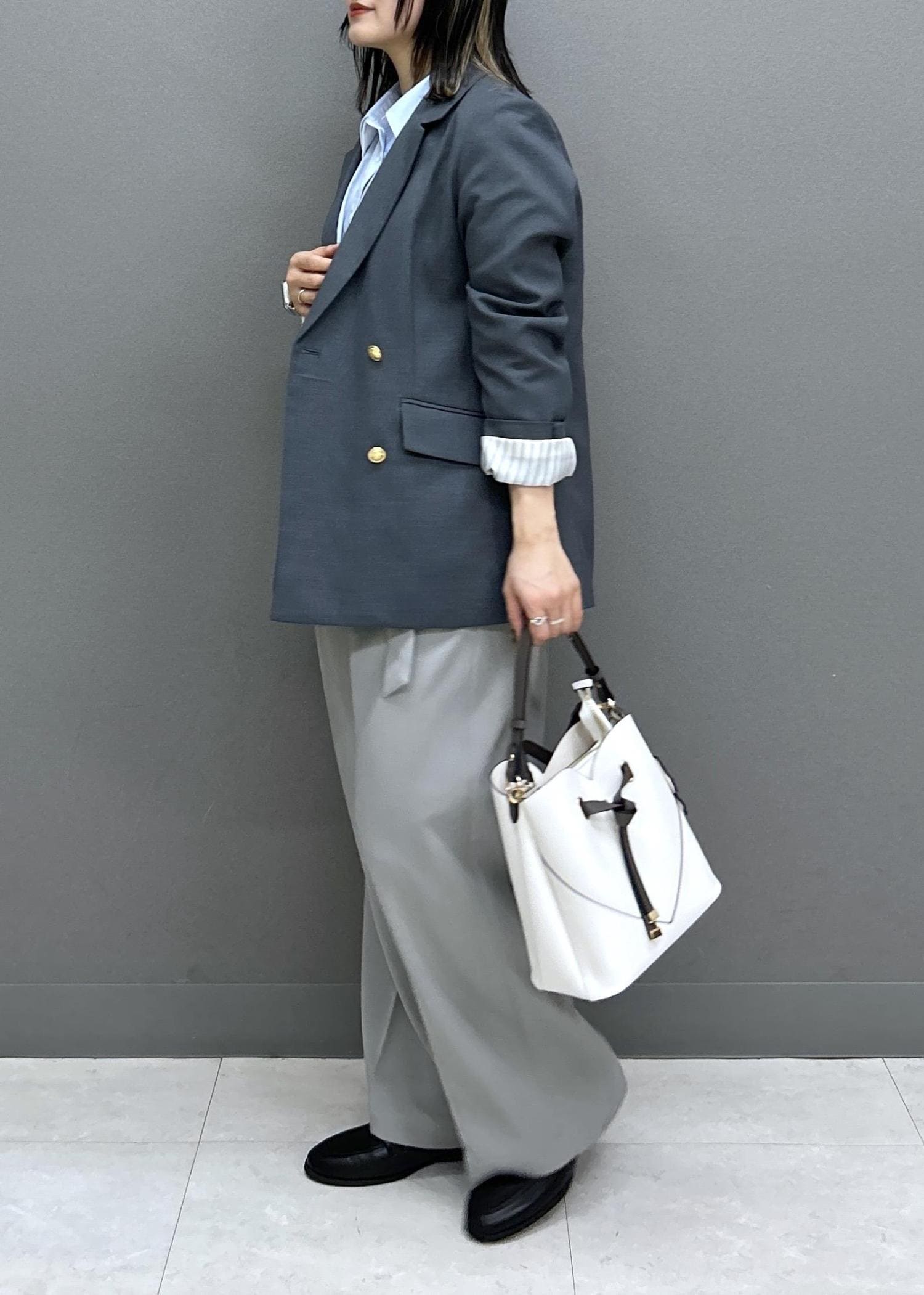 グレーとサックスブルーで爽やかなONコーデです。