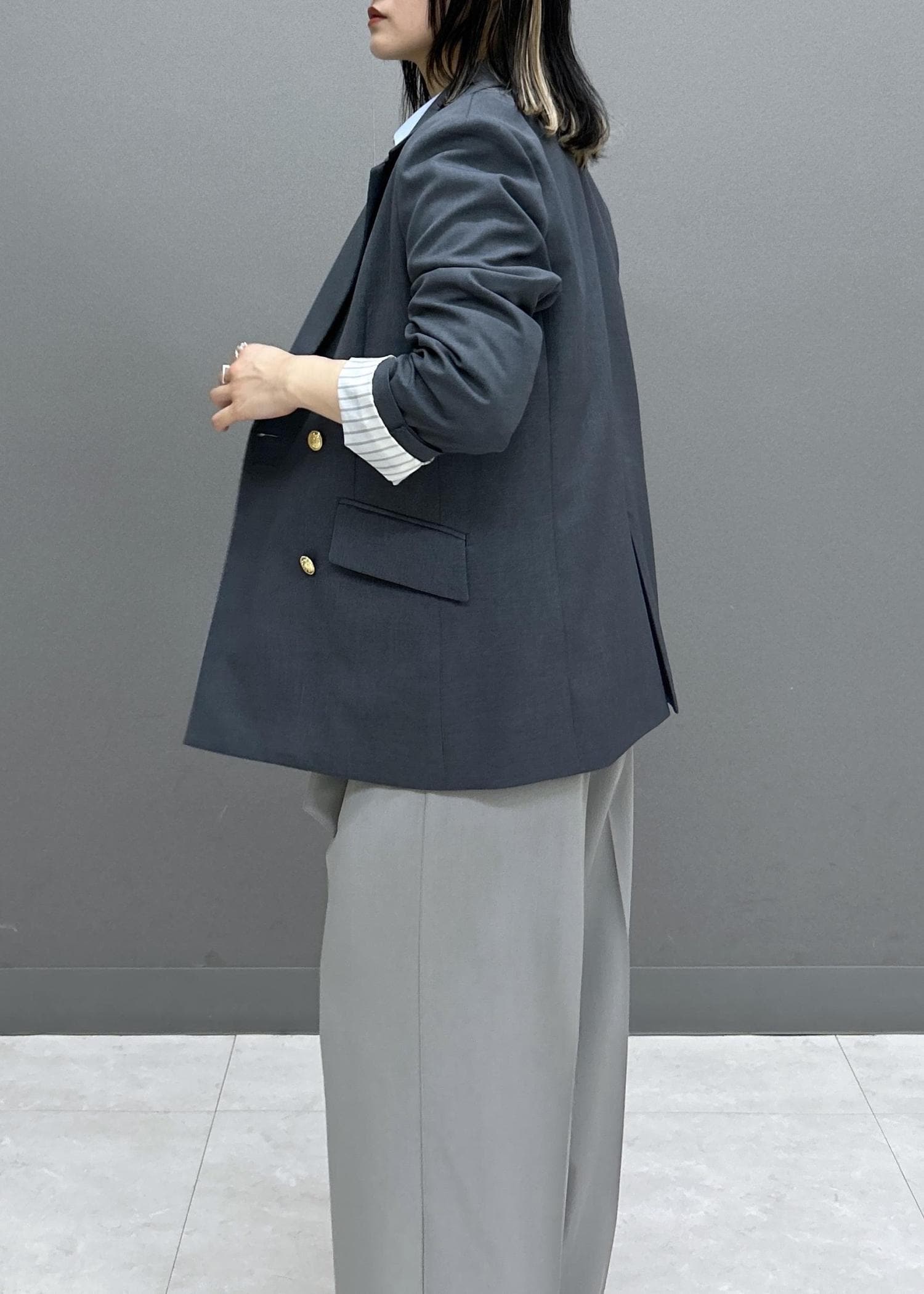 袖丈は親指の第一関節にかかるくらいで、2回捲るとストライプの裏地がチラッと見えてカワイイです♡!