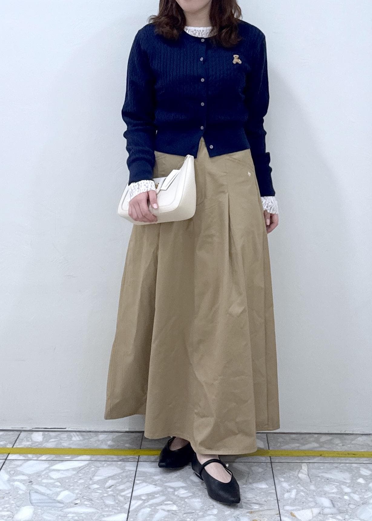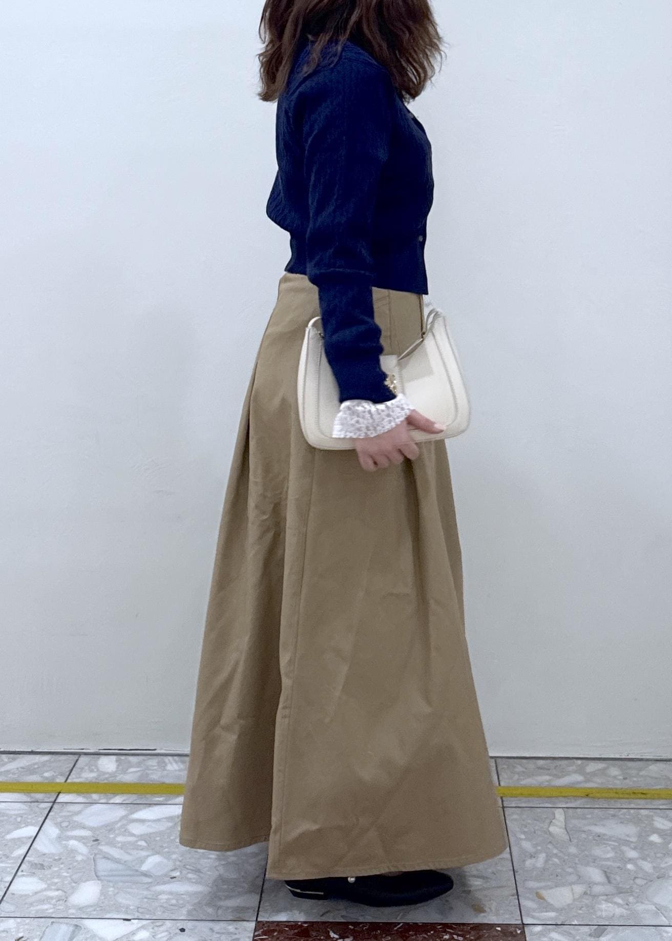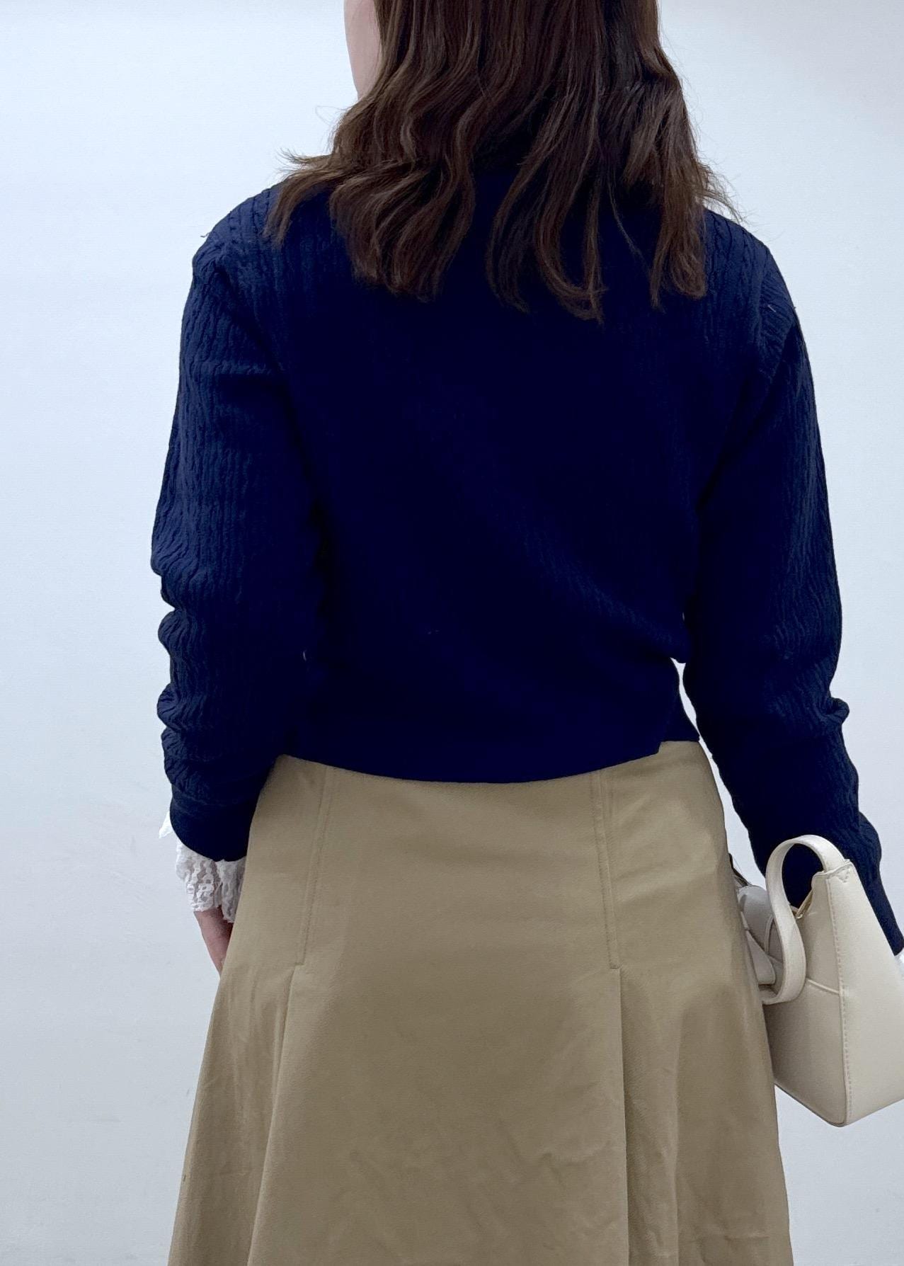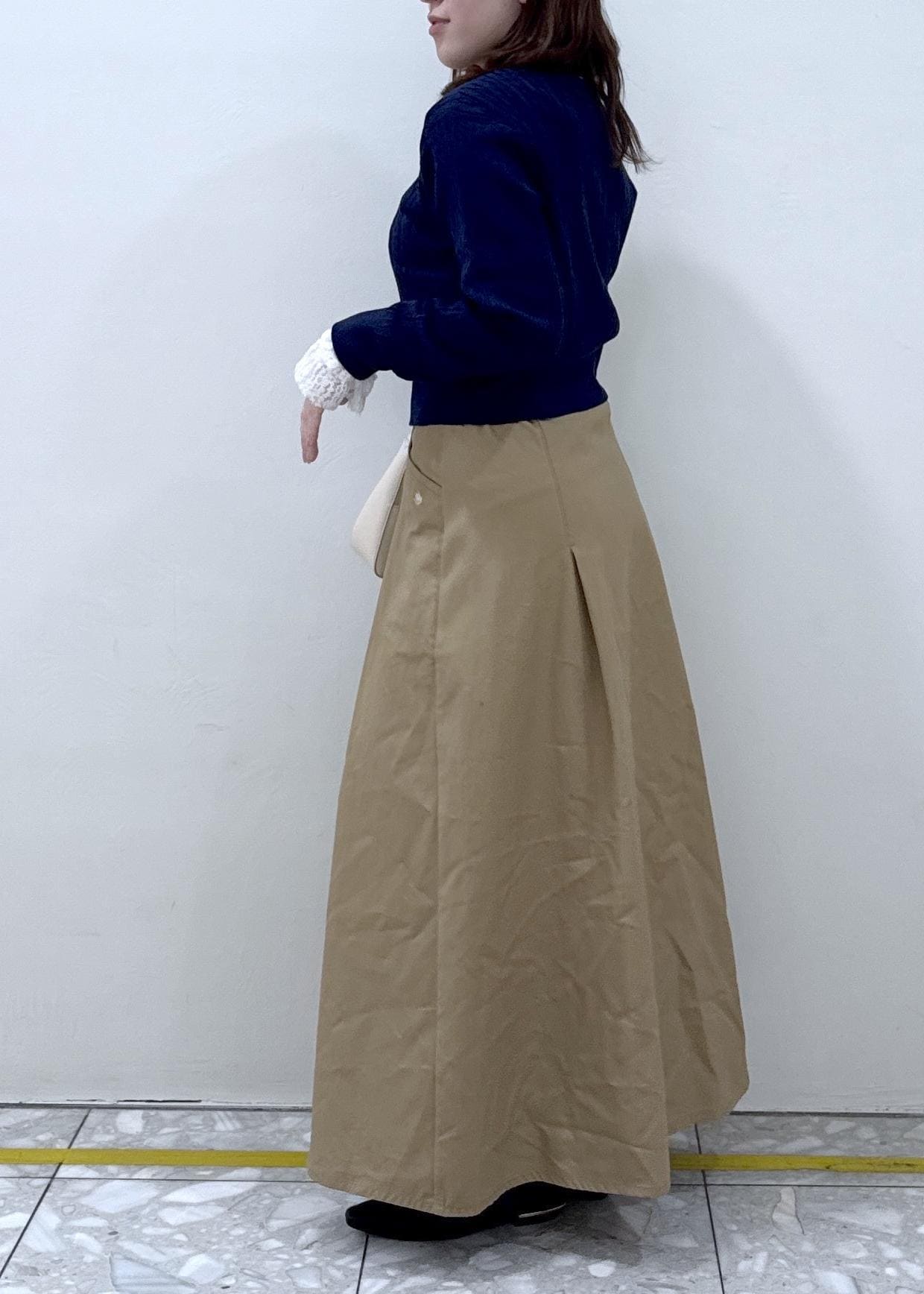 Aラインのシルエットですが、ウエストの部分にタックが入っているので、広がりすぎず着膨れしないです! -