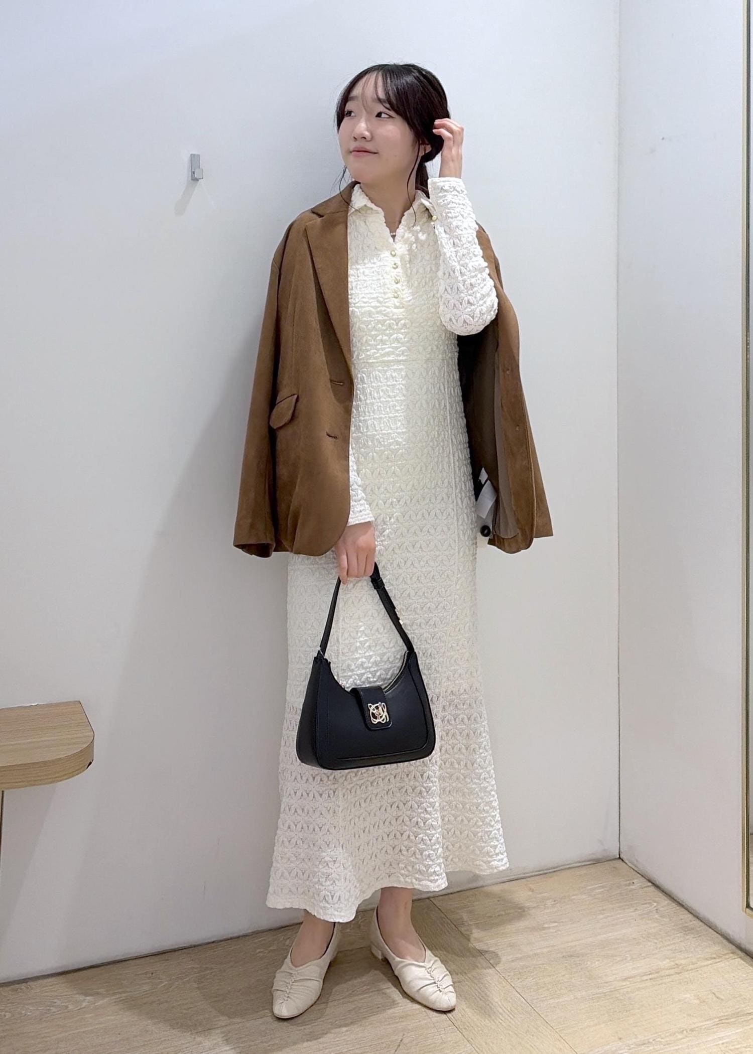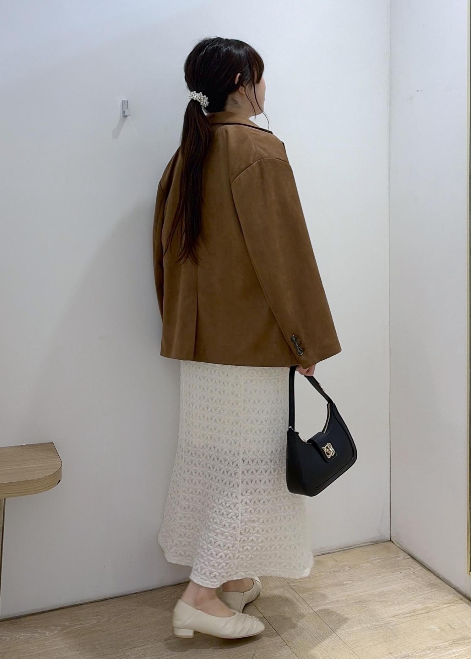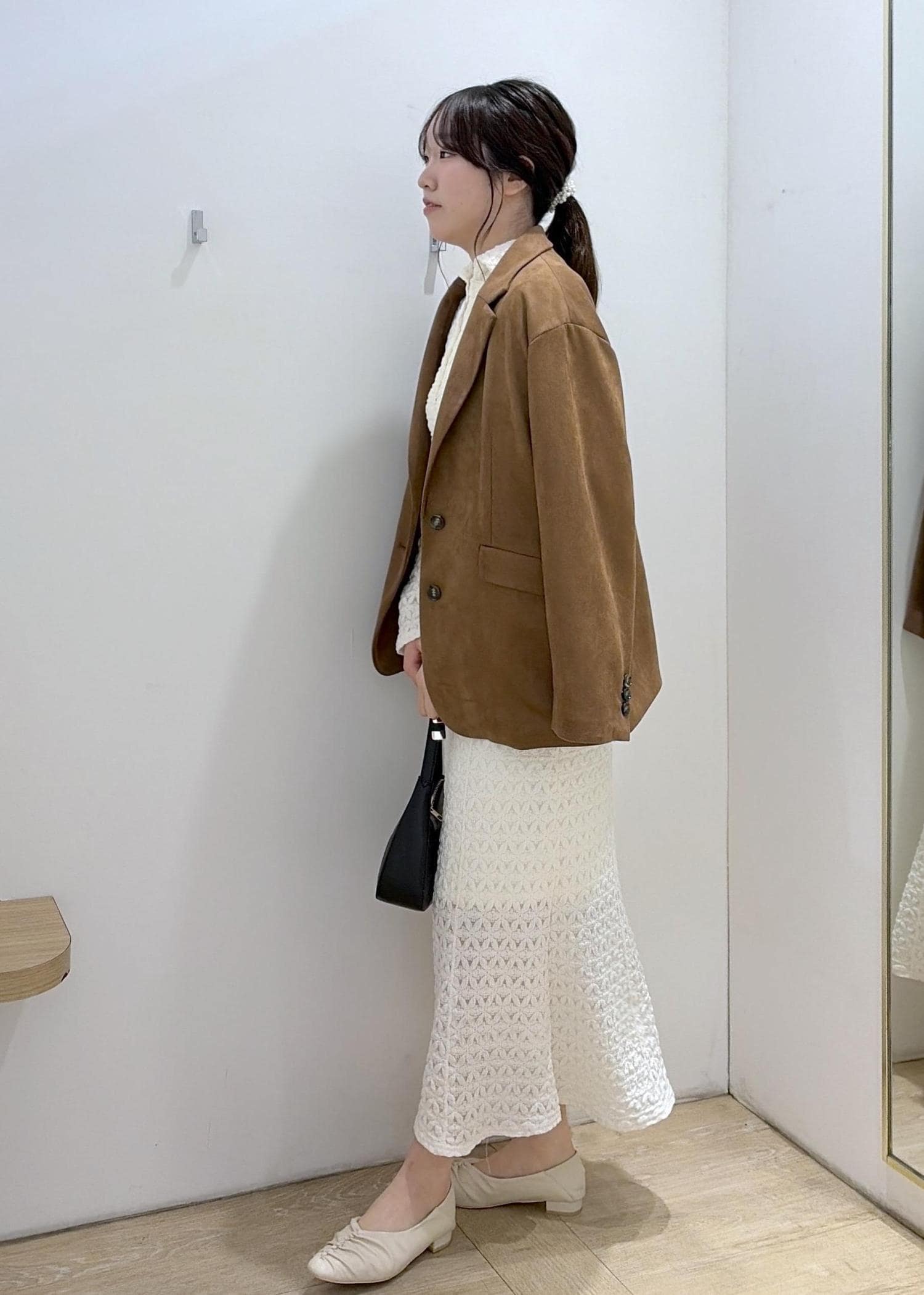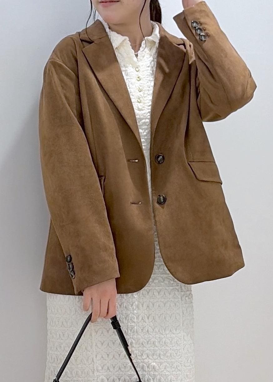 生地感はスエード生地で柔らかく羽織りやすいです。 -