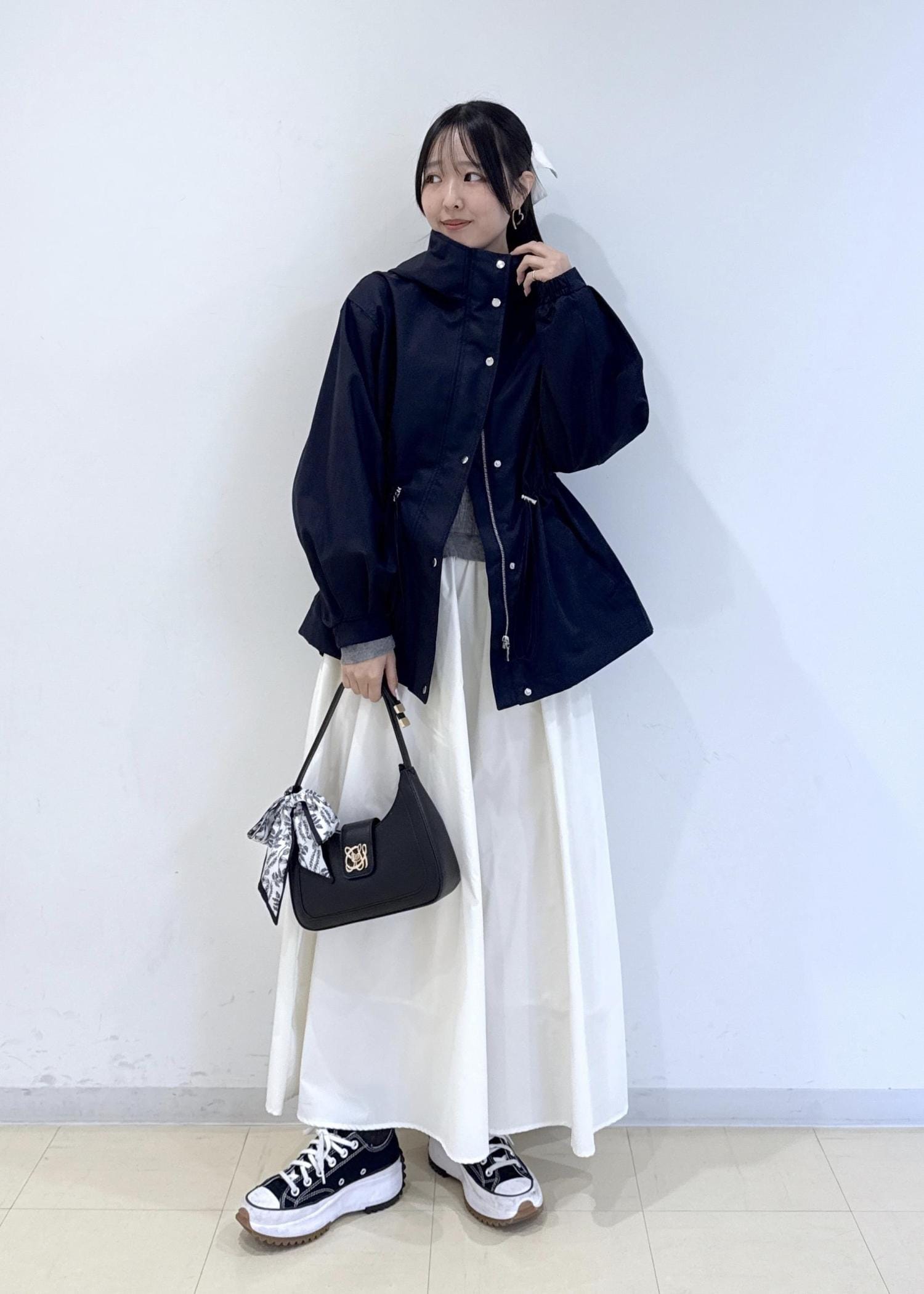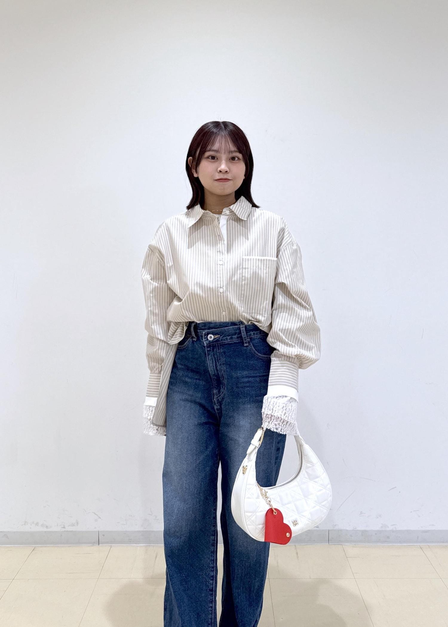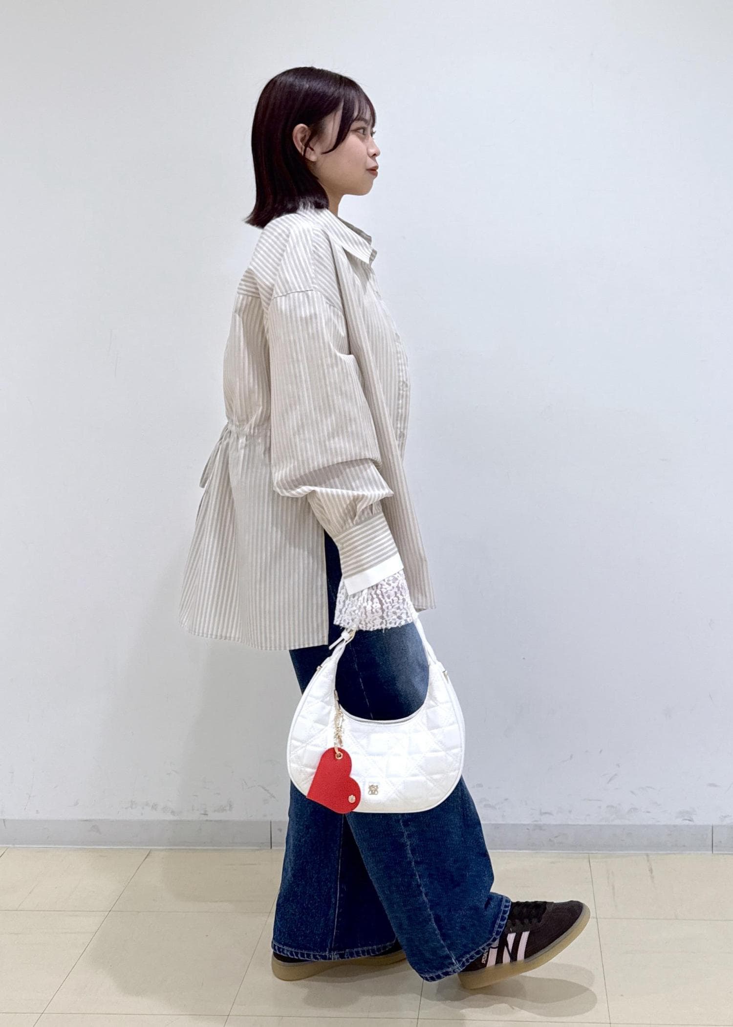 全体的に落ち着いた色味だったので、バッグの赤色のチャームが差し色になるようにしました♬