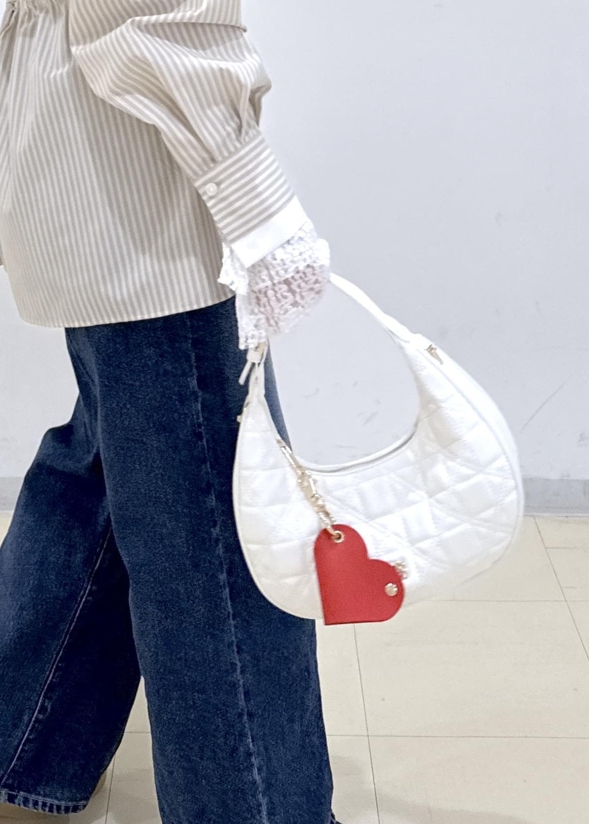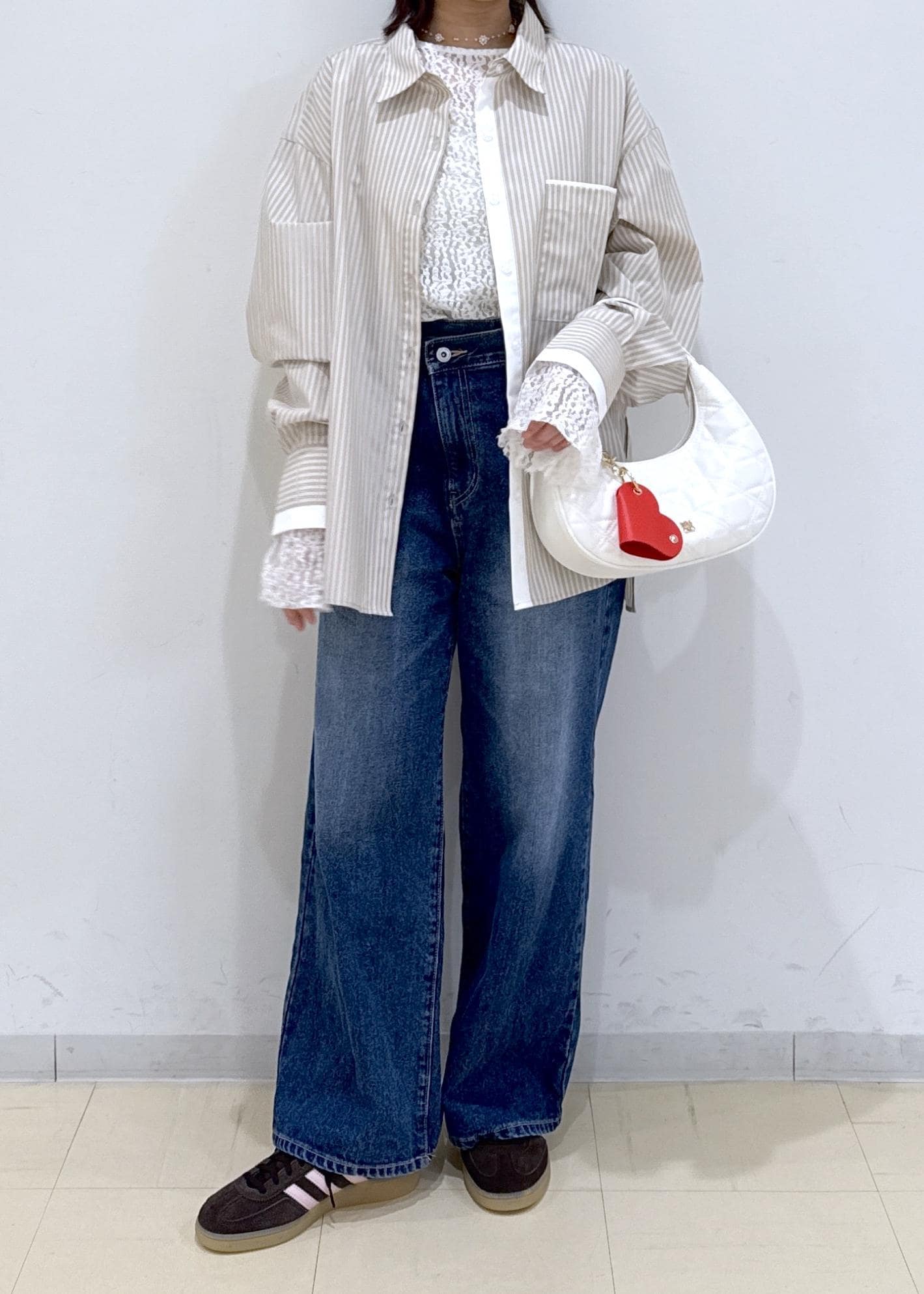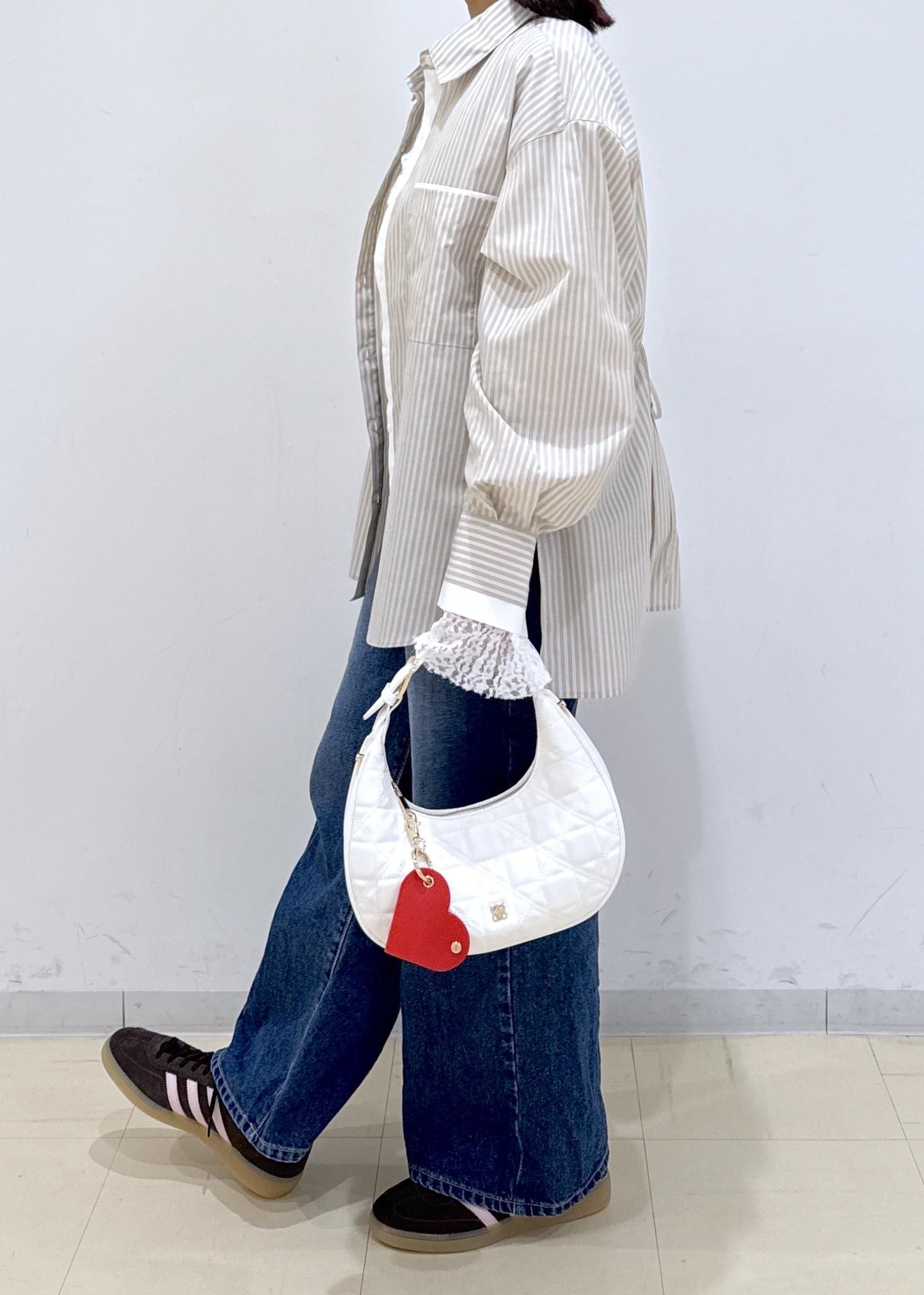 全体的に落ち着いた色味だったので、バッグの赤色のチャームが差し色になるようにしました♬