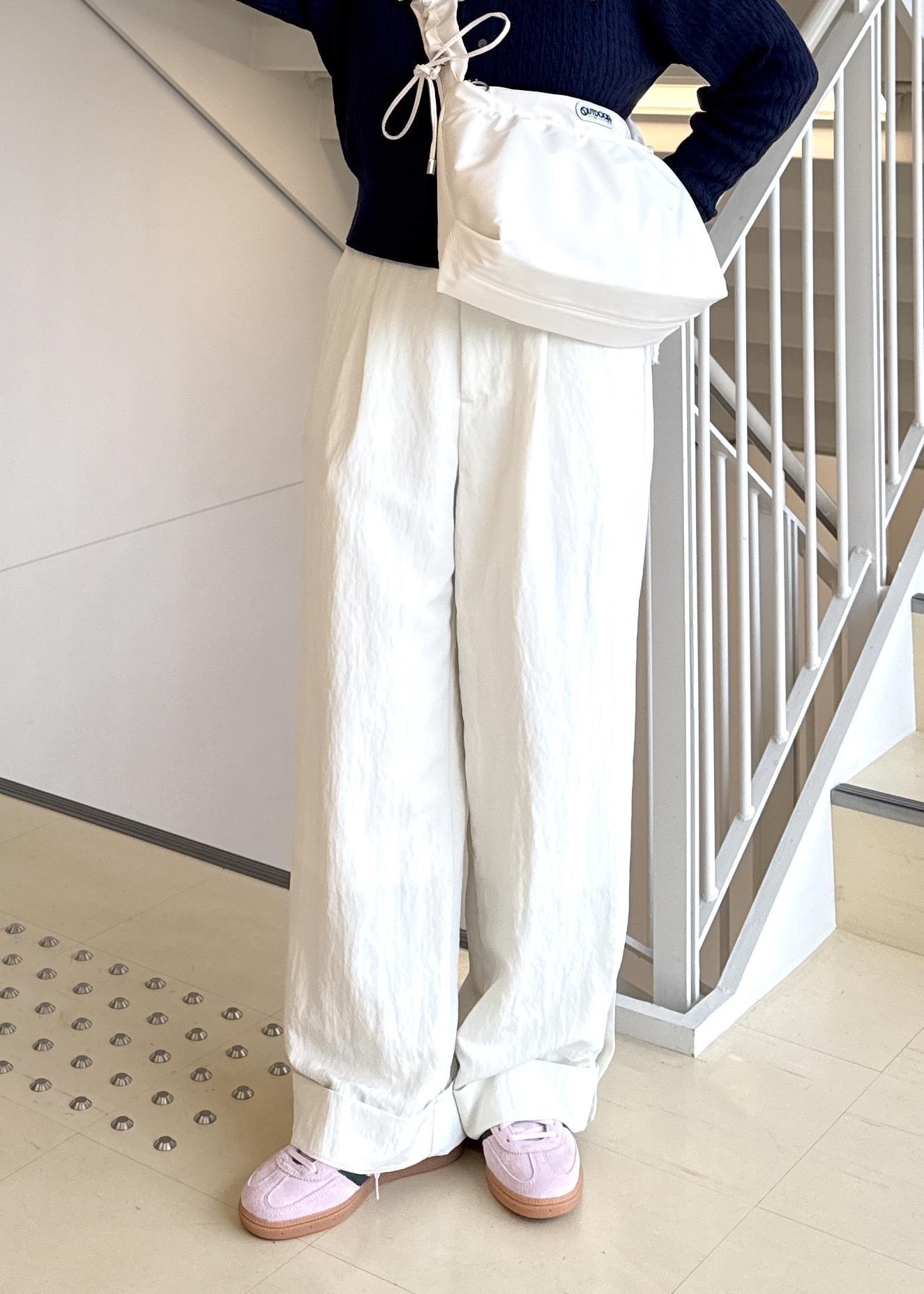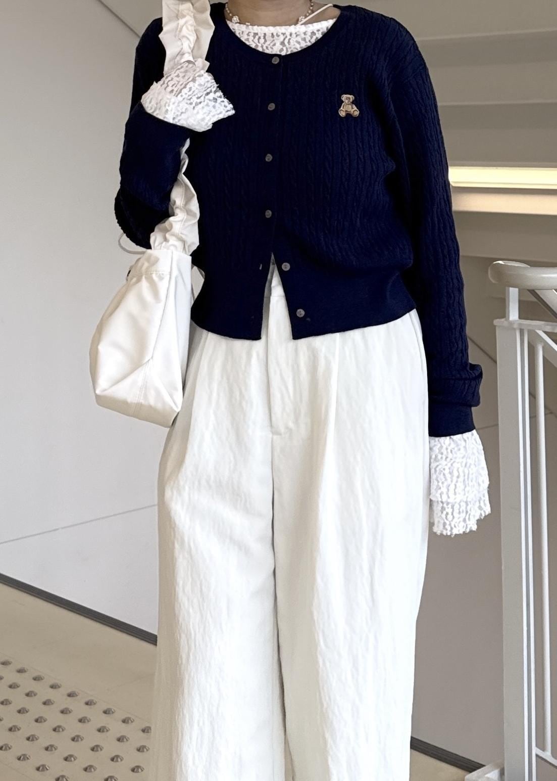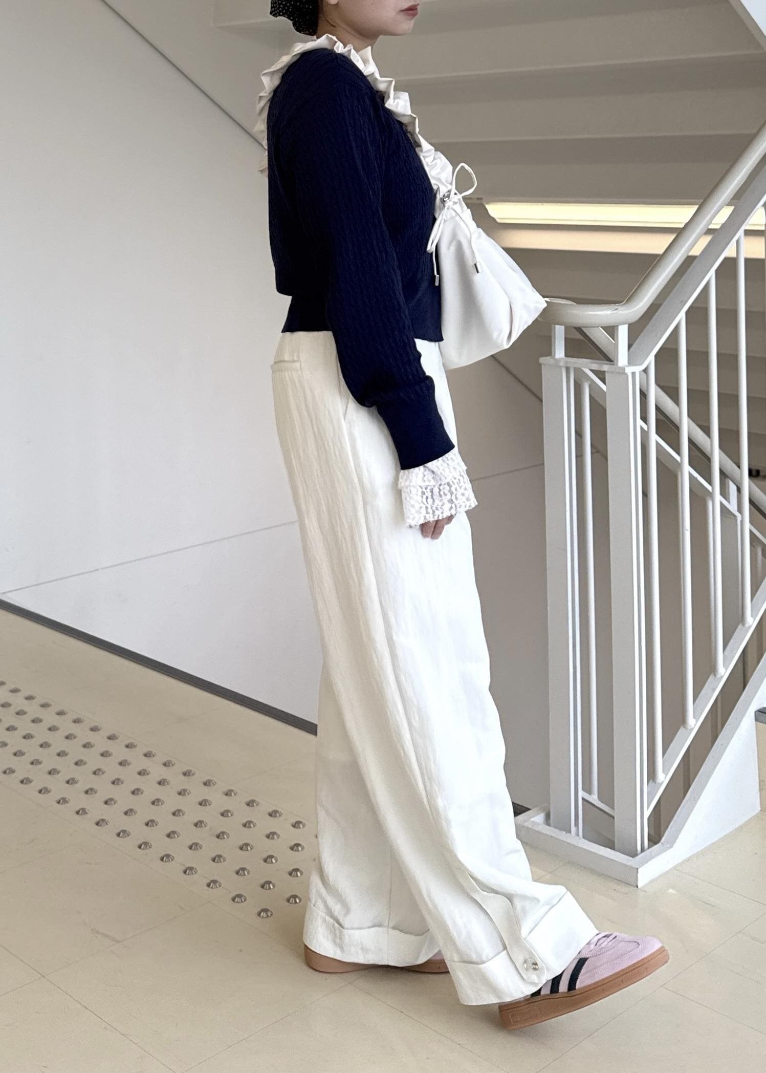 ネイビーは合わせ方によっては暗く、重く見えてしまい、春感がなくなってしまうので、パンツや小物をホワイトにすることで明るさと軽さを出しました!