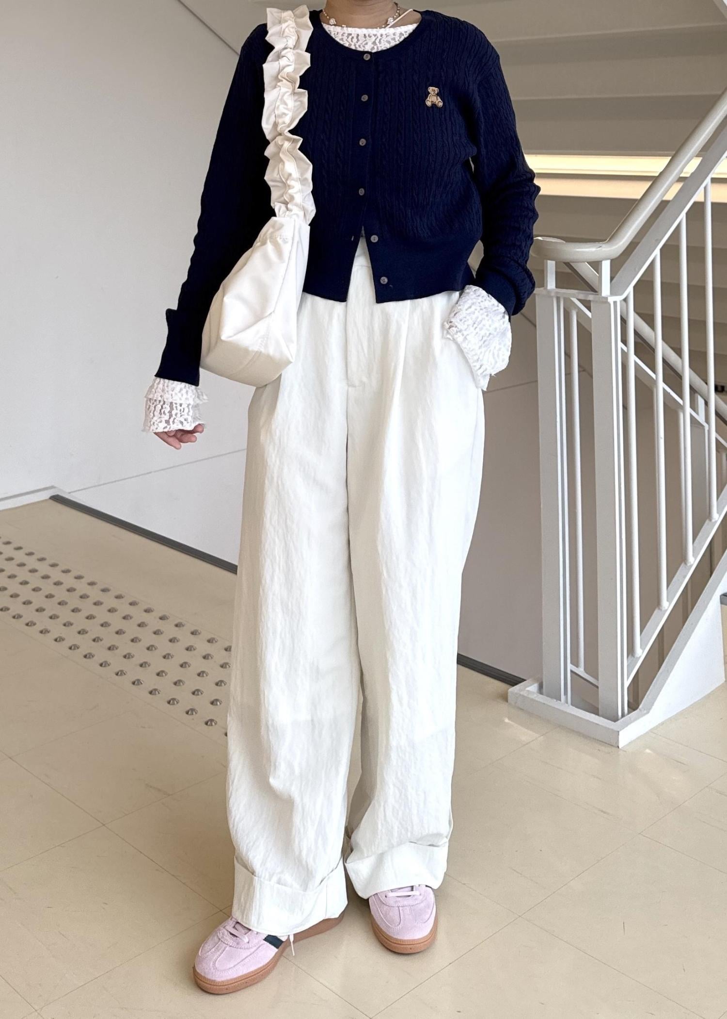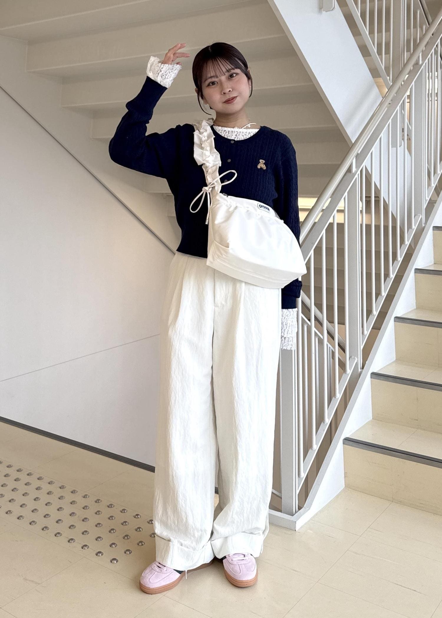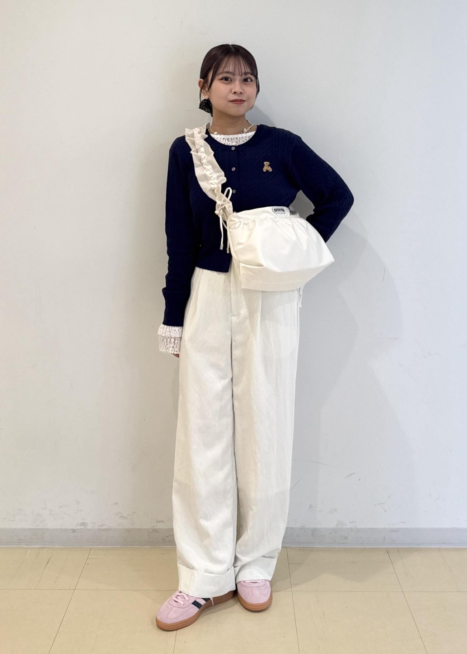 ネイビーは合わせ方によっては暗く、重く見えてしまい、春感がなくなってしまうので、パンツや小物をホワイトにすることで明るさと軽さを出しました!