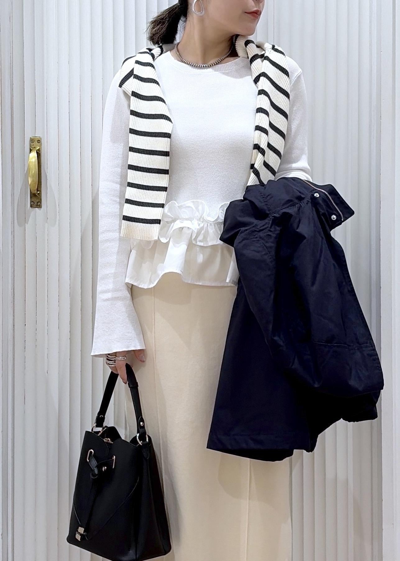 VIS裾フリルティアードドッキングニットオフホワイト / F¥5,929レビュー体にフィットするような着用感で、丈が短めなので、ハイウエストデニムやスラックスと合わせたスタイリングがおすすめです。ニット部分は少しシャリ感のあるドライタッチな素材感で着心地も良く、ロングシーズン着用可能。ジャケットの中にインナーとしても、1枚で着ても着映えするニットトップス。