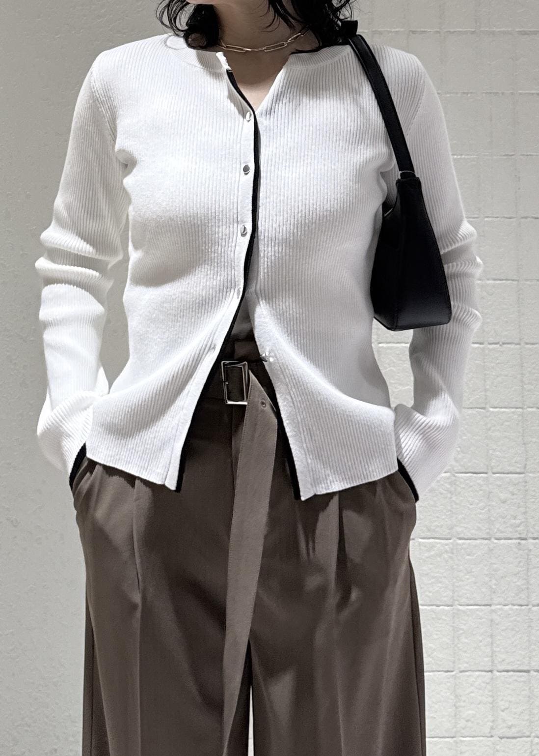 VISバイカラークルーネックカーディガンホワイト系 / F¥5,489レビューしっかり目の素材のカーディガンは綿が少し入ってるので真夏に少し寒いオフィスなどでも活躍しそうな素材。