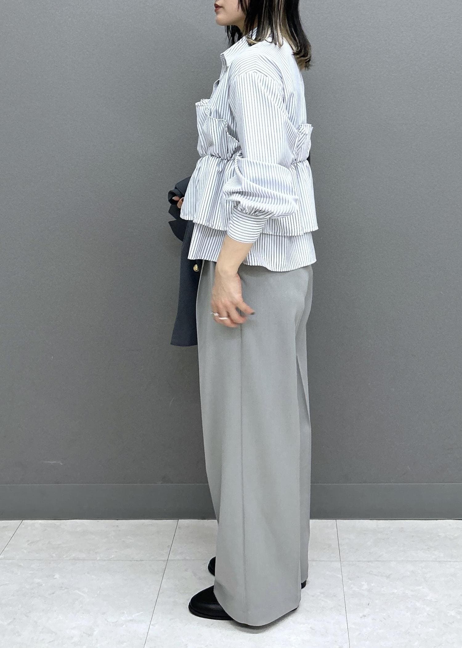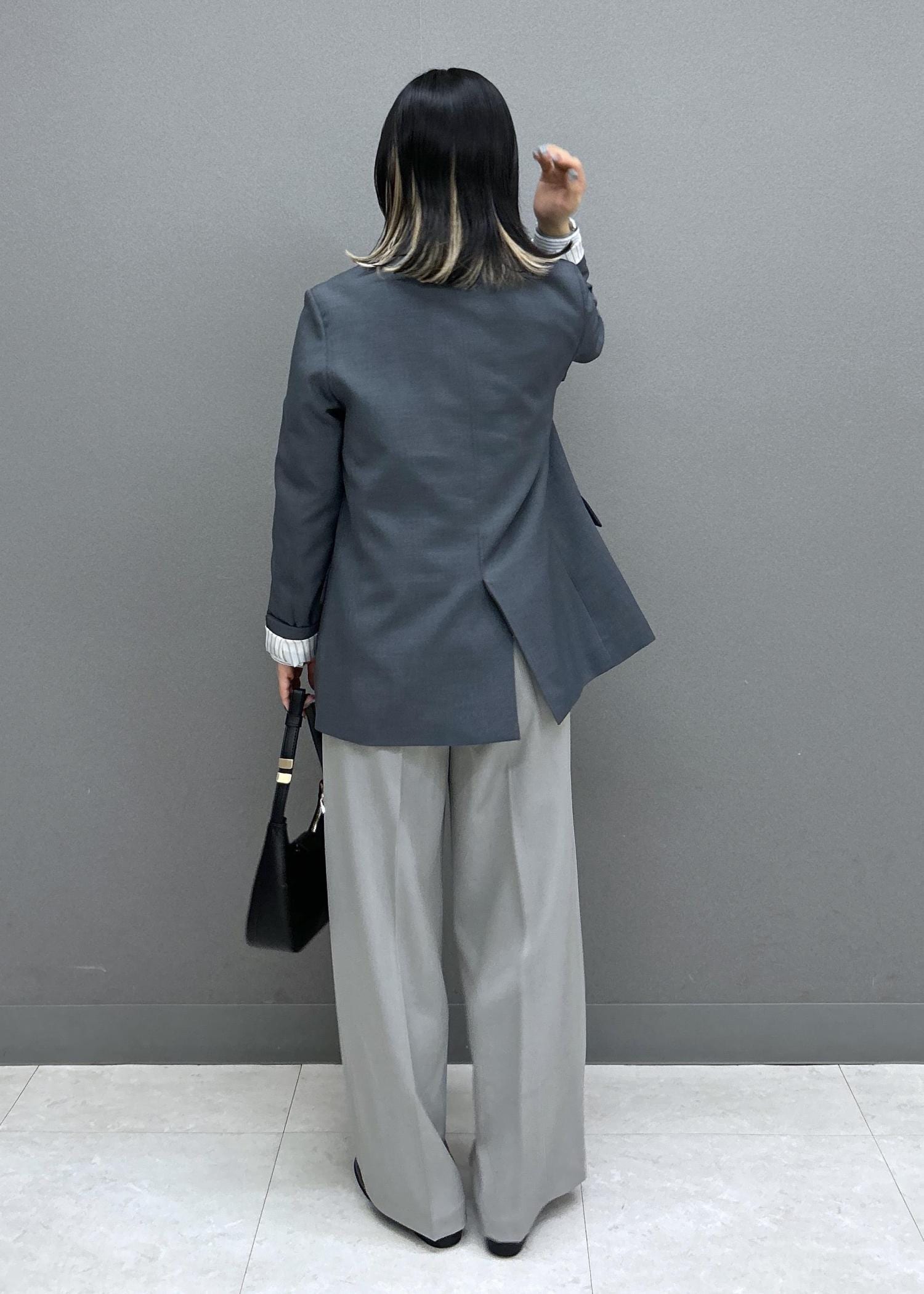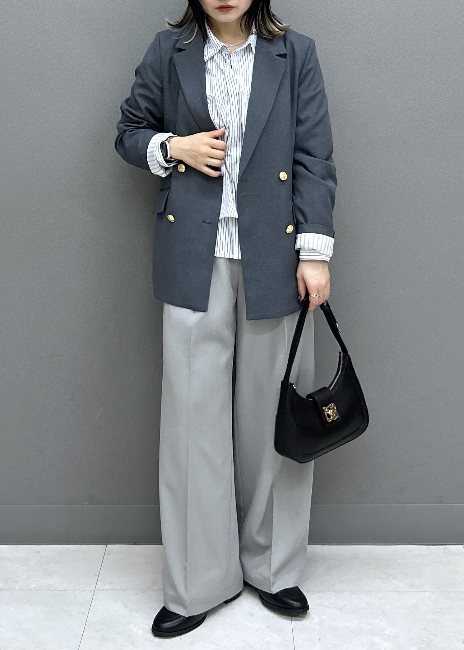 上下トーン違いのグレーであわせたセットアップ風のスタイリングです。