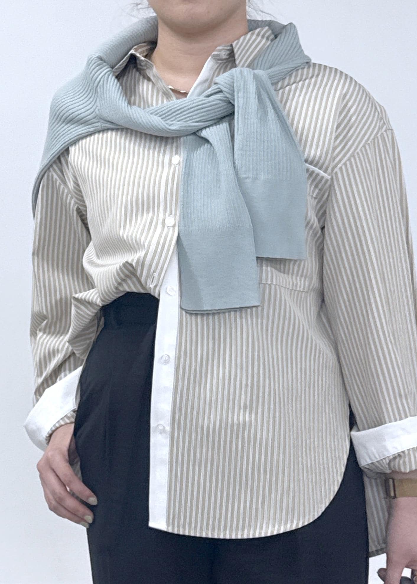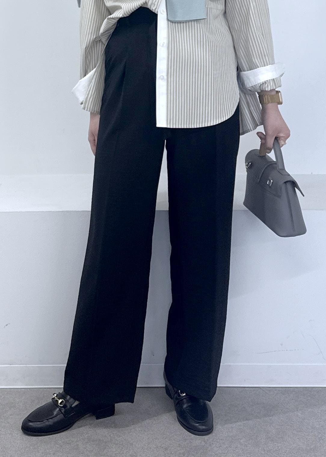 今回は新作で入荷しましたオーバーサイズのストライプ柄にリネンライクのワイドパンツと合わせて、オフィスでも着れる綺麗めカジュアルなコーディネートにしてみました♪