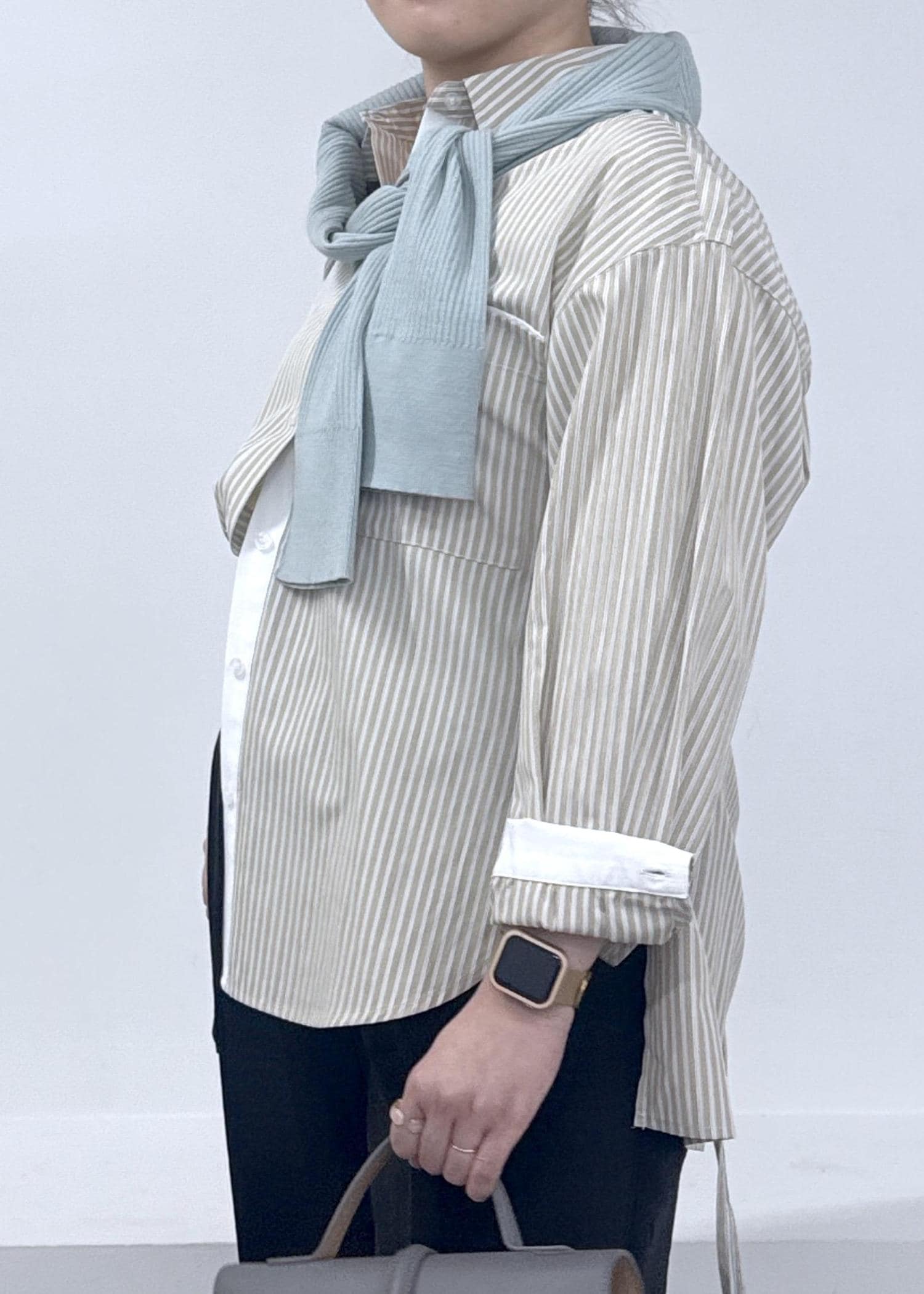 VISウエストリボンシャツ/イージーケア・WEB限定カラーベージュ / F¥5,489レビューオーバーサイズ感のシャツにバッグが絞れるデザインなので、カジュアル過ぎず女性らしさが出るシャツになっています。前開きなので羽織りでも着ることができ、開けるとバイカラーの部分もまた可愛いです!