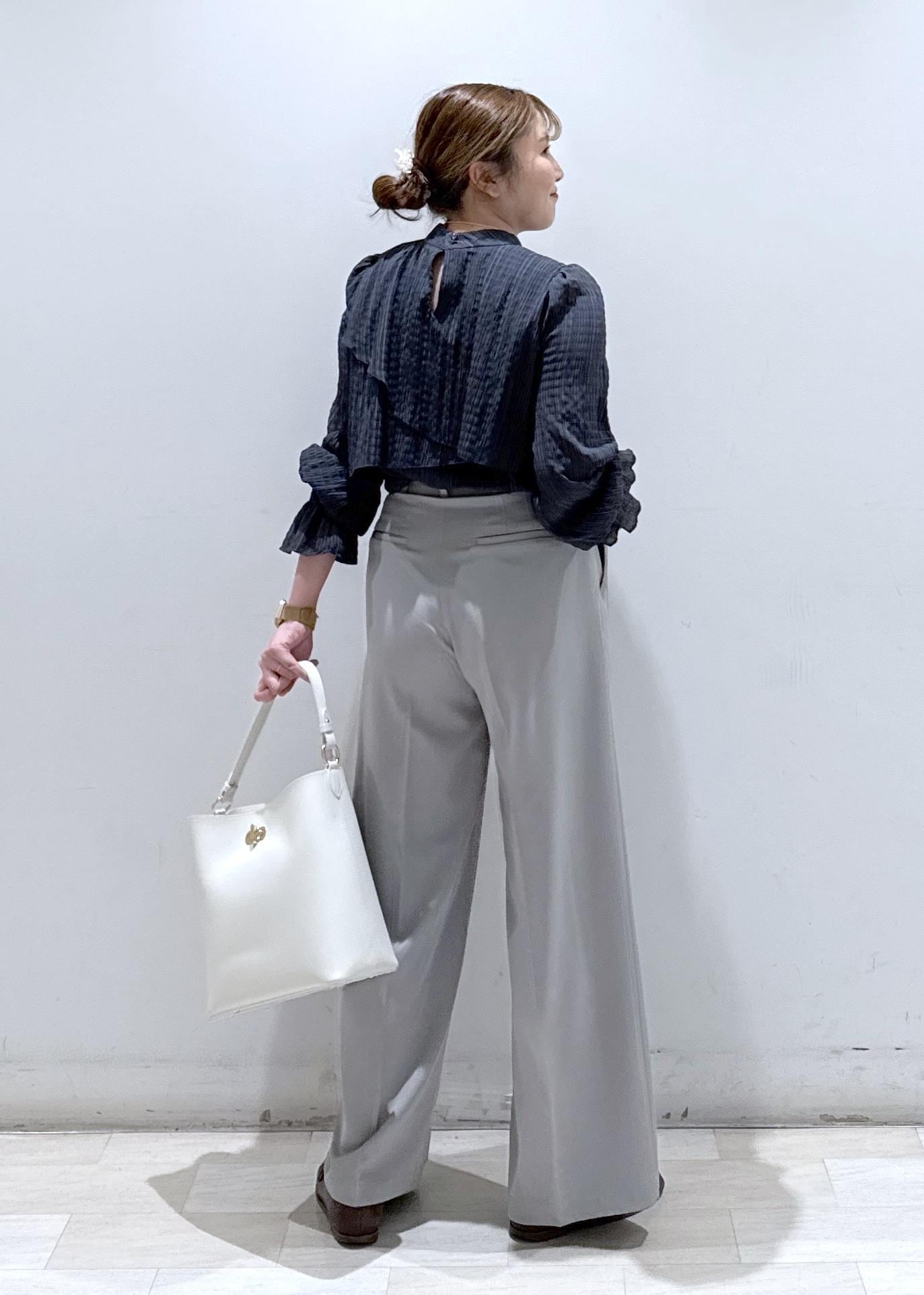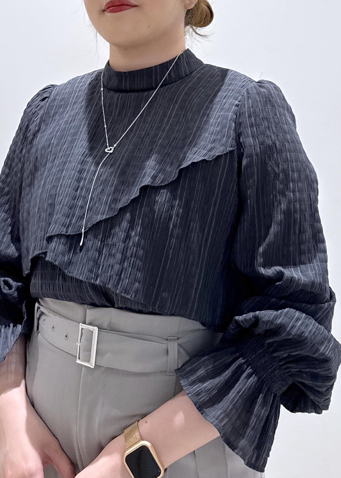 サラッとした柔らかい肌触りに、お袖に少し透け感があるので女性らしく上品に着ていただけます。パンツ、スカートどちらでも合わせやすいので着やすいです。