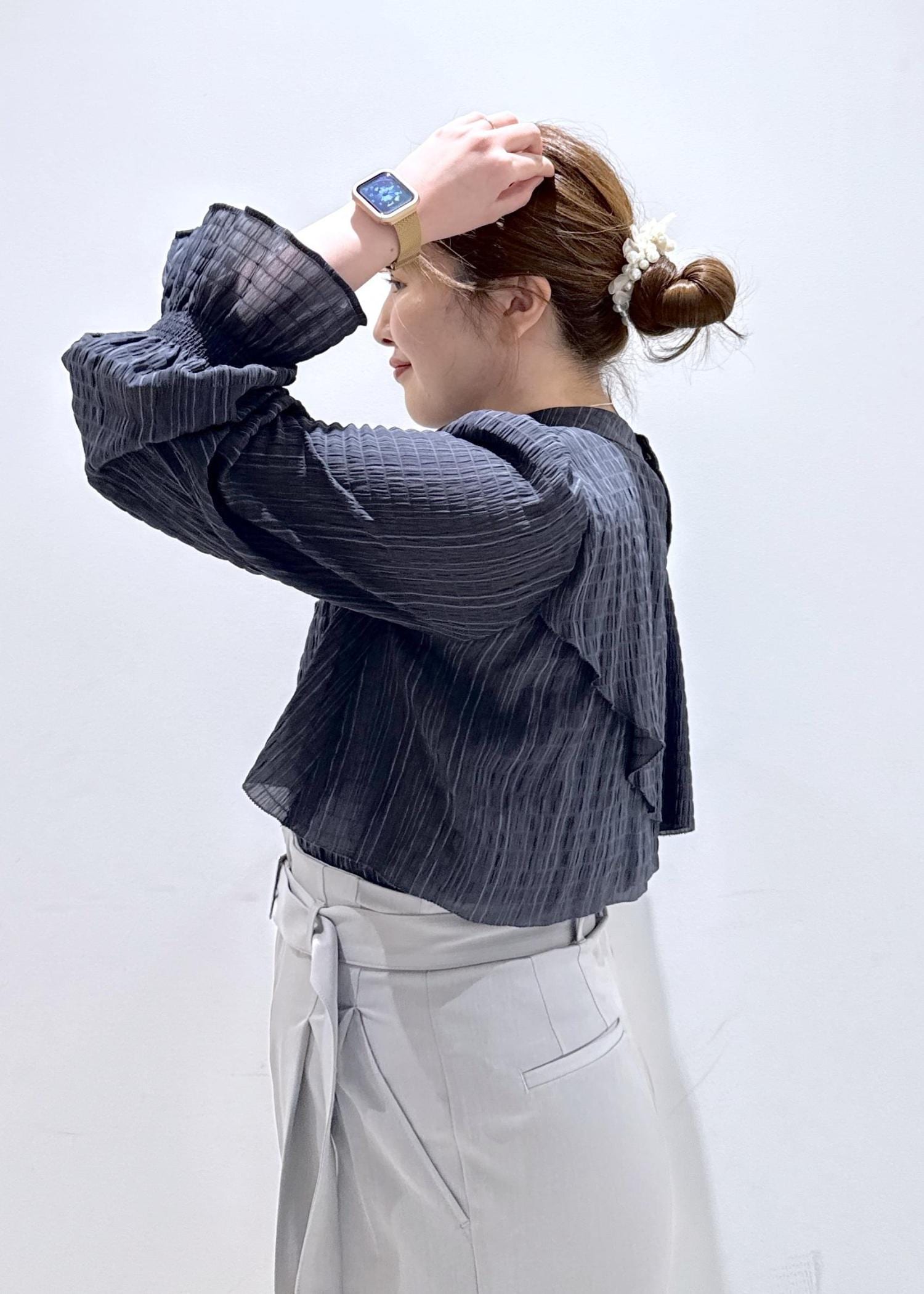 身長157cm/Fサイズ着用。お袖から少し透け感があり、サラッとしている軽いブラウスなので着やすいです。腰丈の長さであるので、インしてもしなくてもどちらでも着れます。1枚でも、ジャケットの中にも着れるオススメのブラウスなのでぜひ合わせてみてください* -