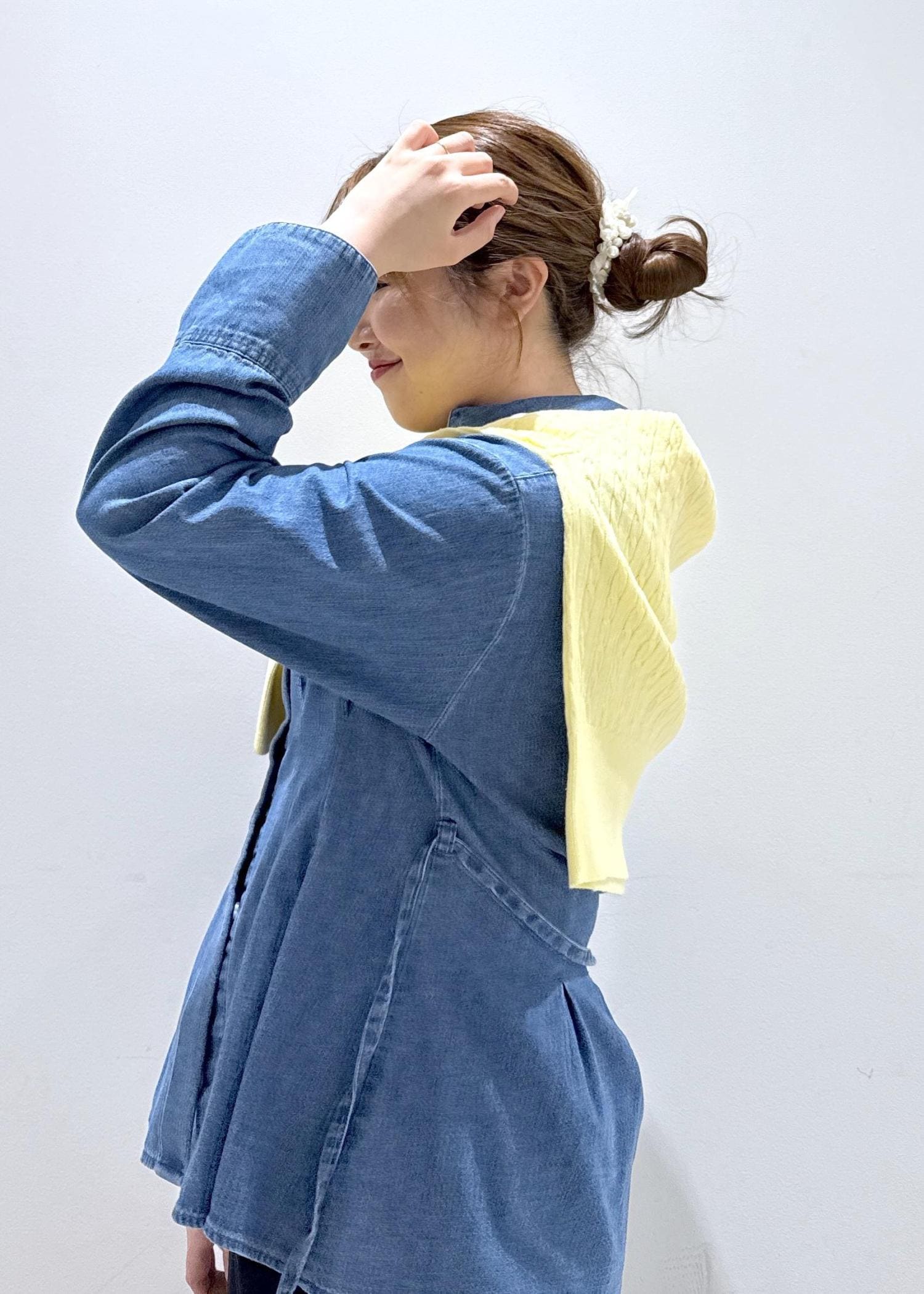差し色で黄色をアクセントに入れているので、顔周りもパッと華やかに明るく見せています。