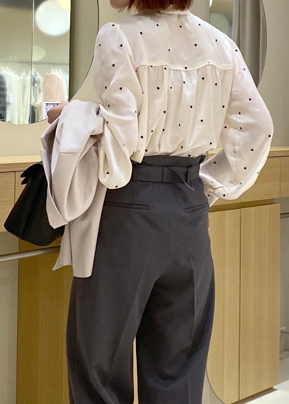 ジャケットを脱ぐとハート柄ブラウスで女性らしさを残しつつ、ベルトでキレイめな印象に!