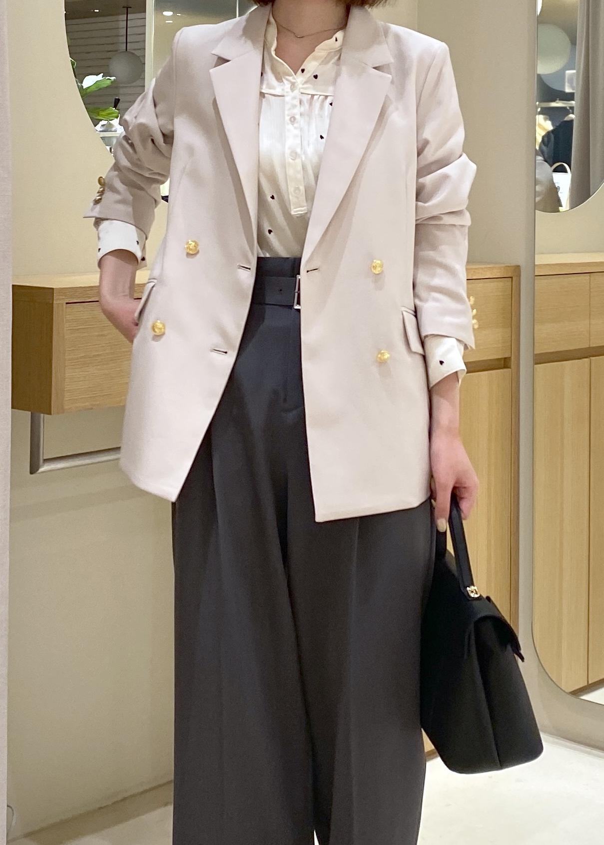 ジャケット・ハート柄ブラウスにベルト付きのワイドパンツを合わせたオフィスカジュアルコーデです!