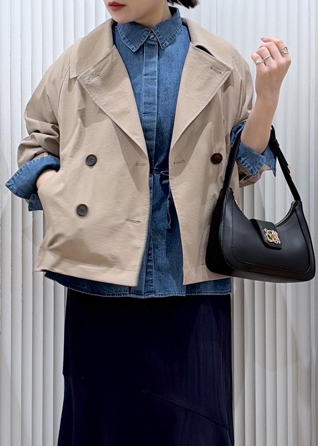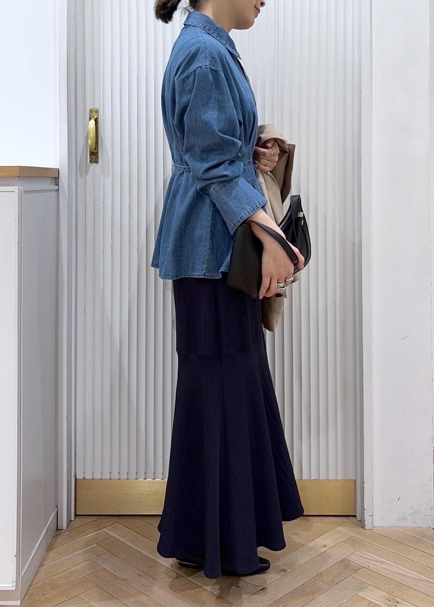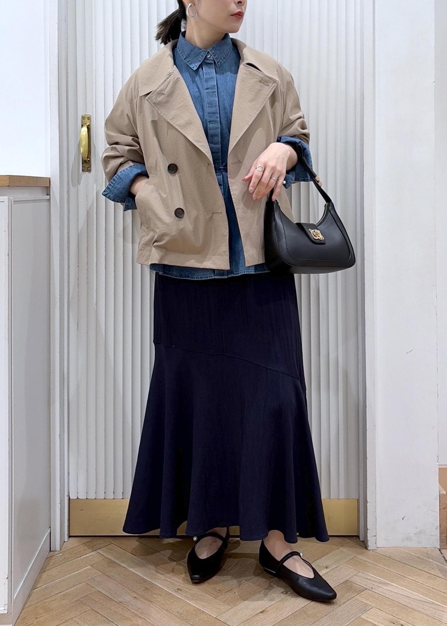 サテンマーメイドを程よくカジュアルダウンしたデニムシャツとショートトレンチがポイントのコーディネートです。