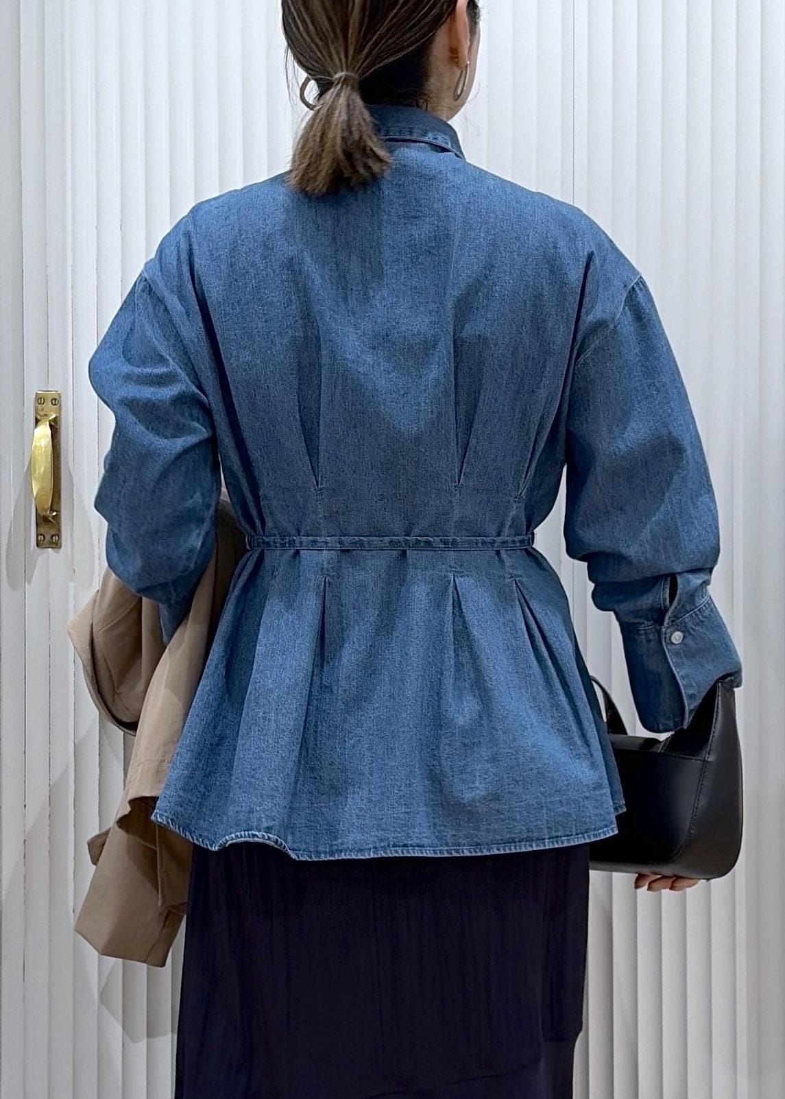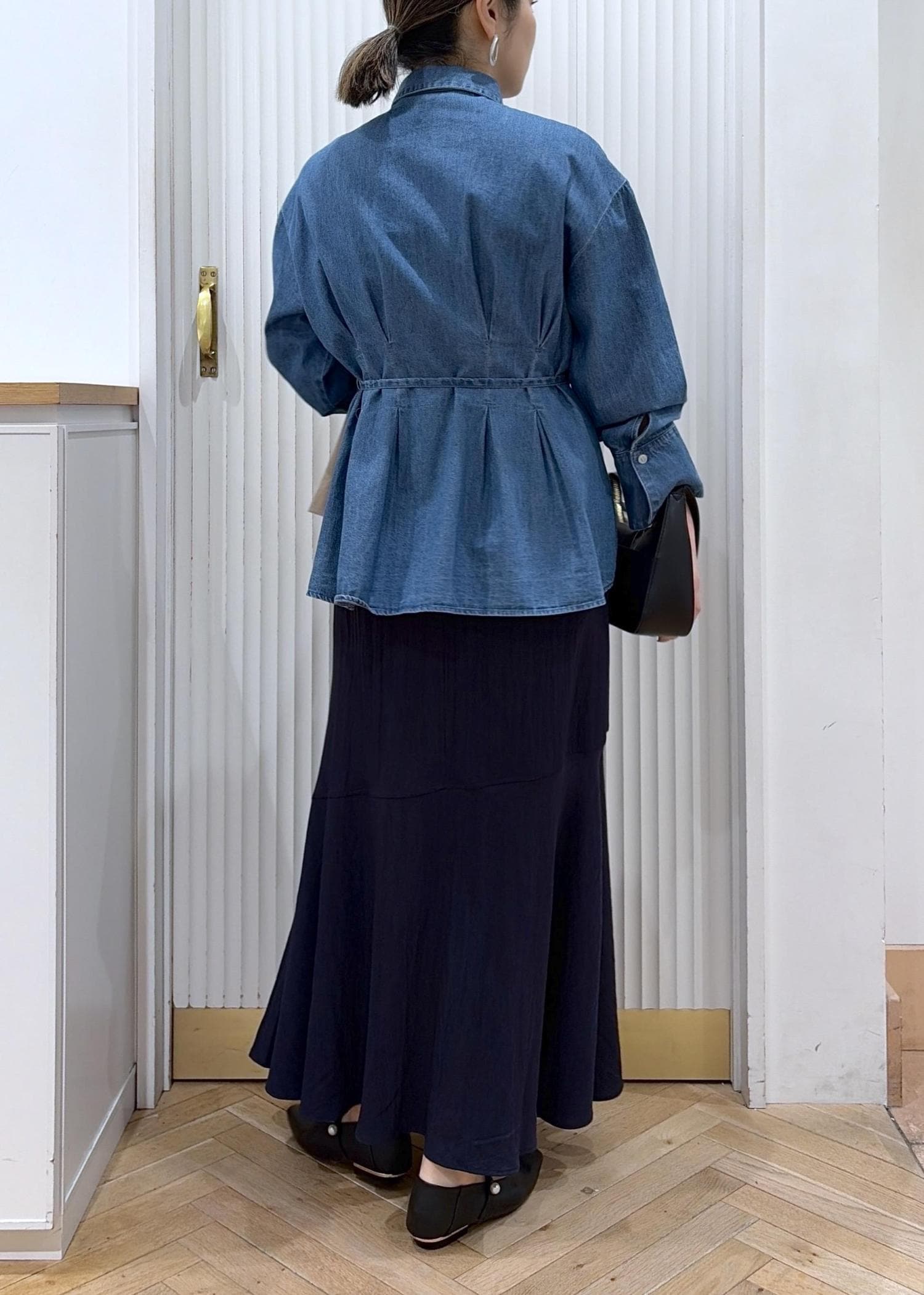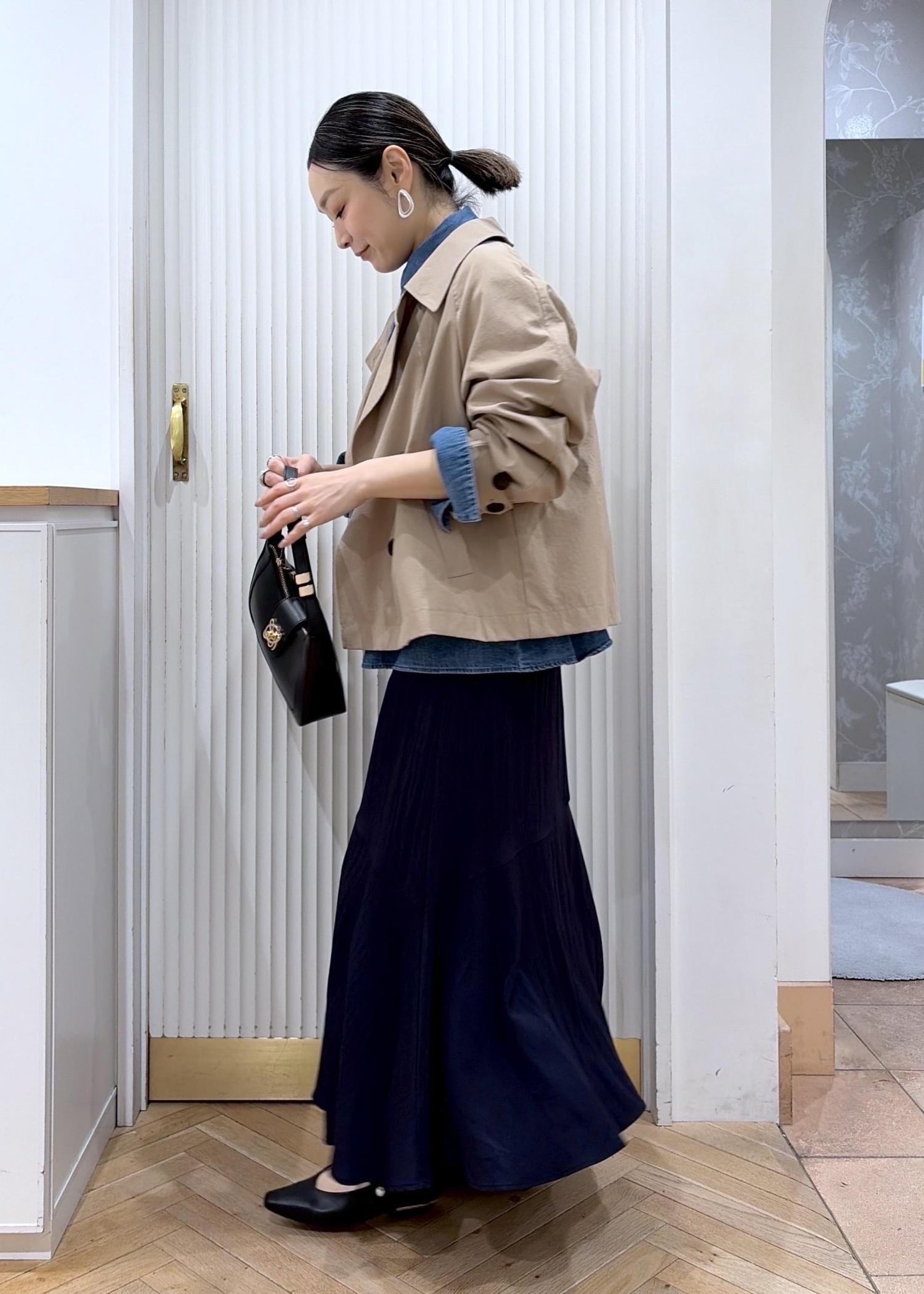 サテンマーメイドを程よくカジュアルダウンしたデニムシャツとショートトレンチがポイントのコーディネートです。
