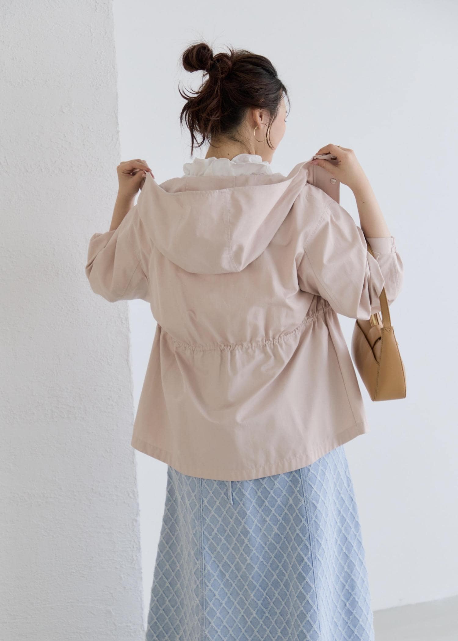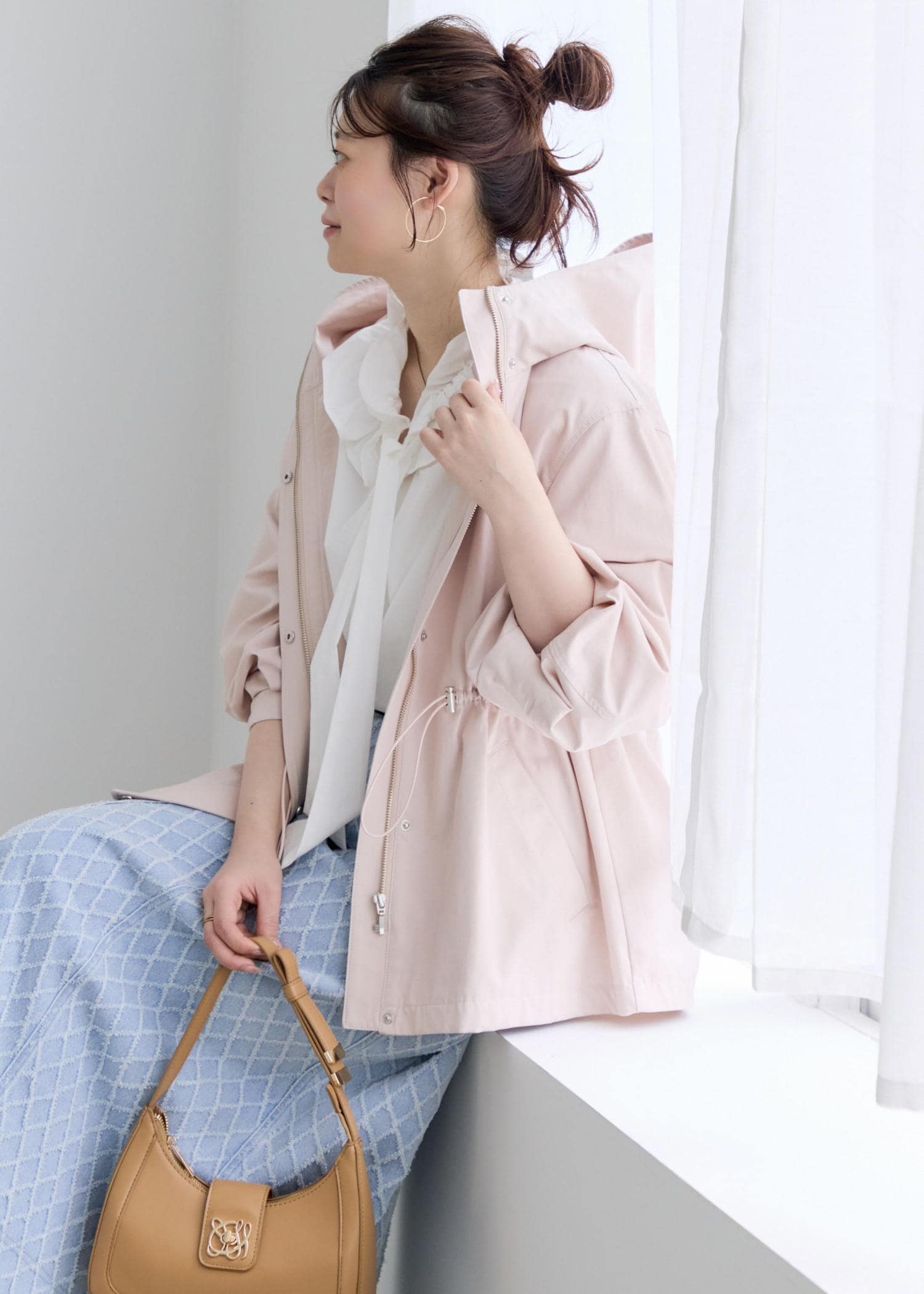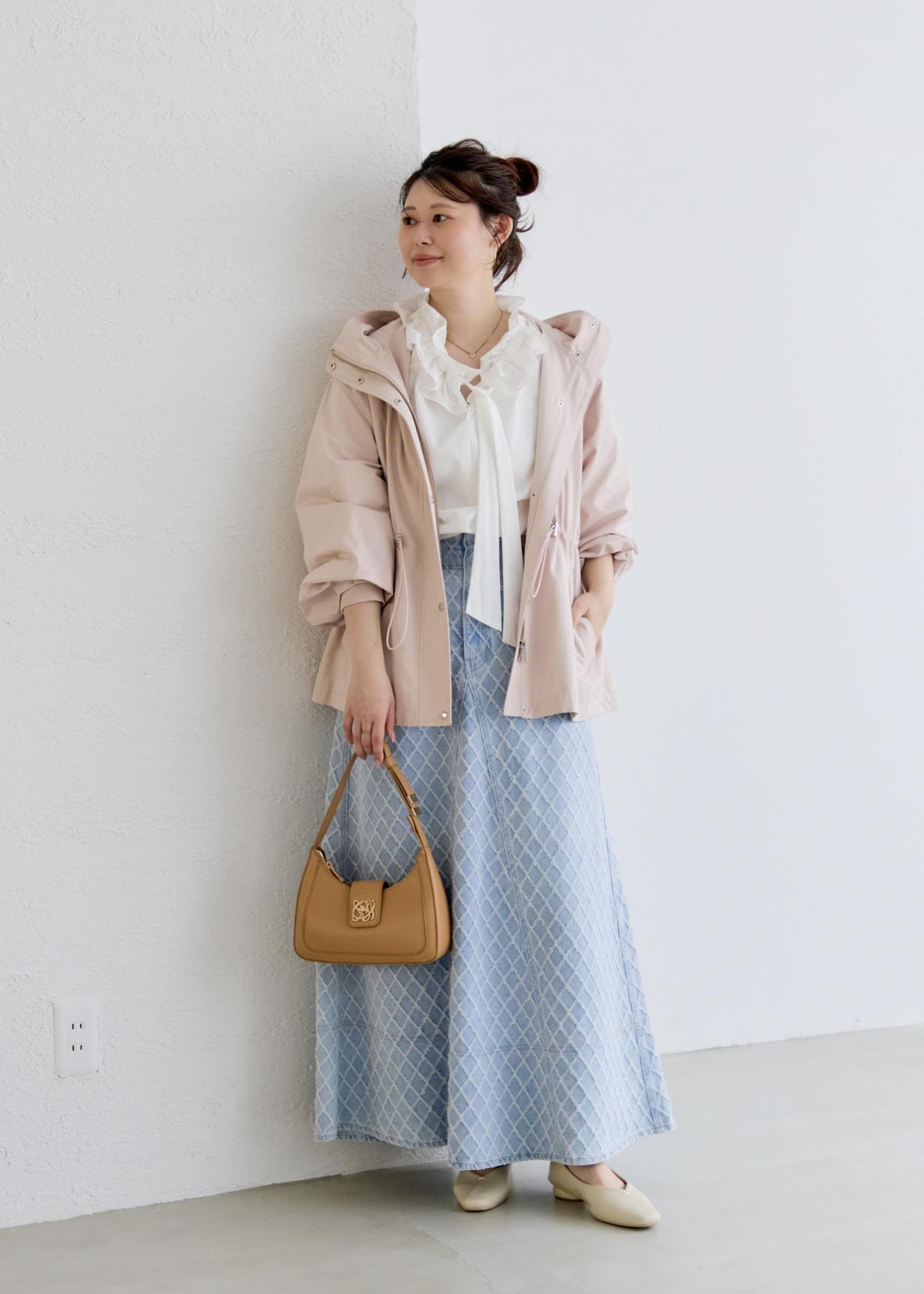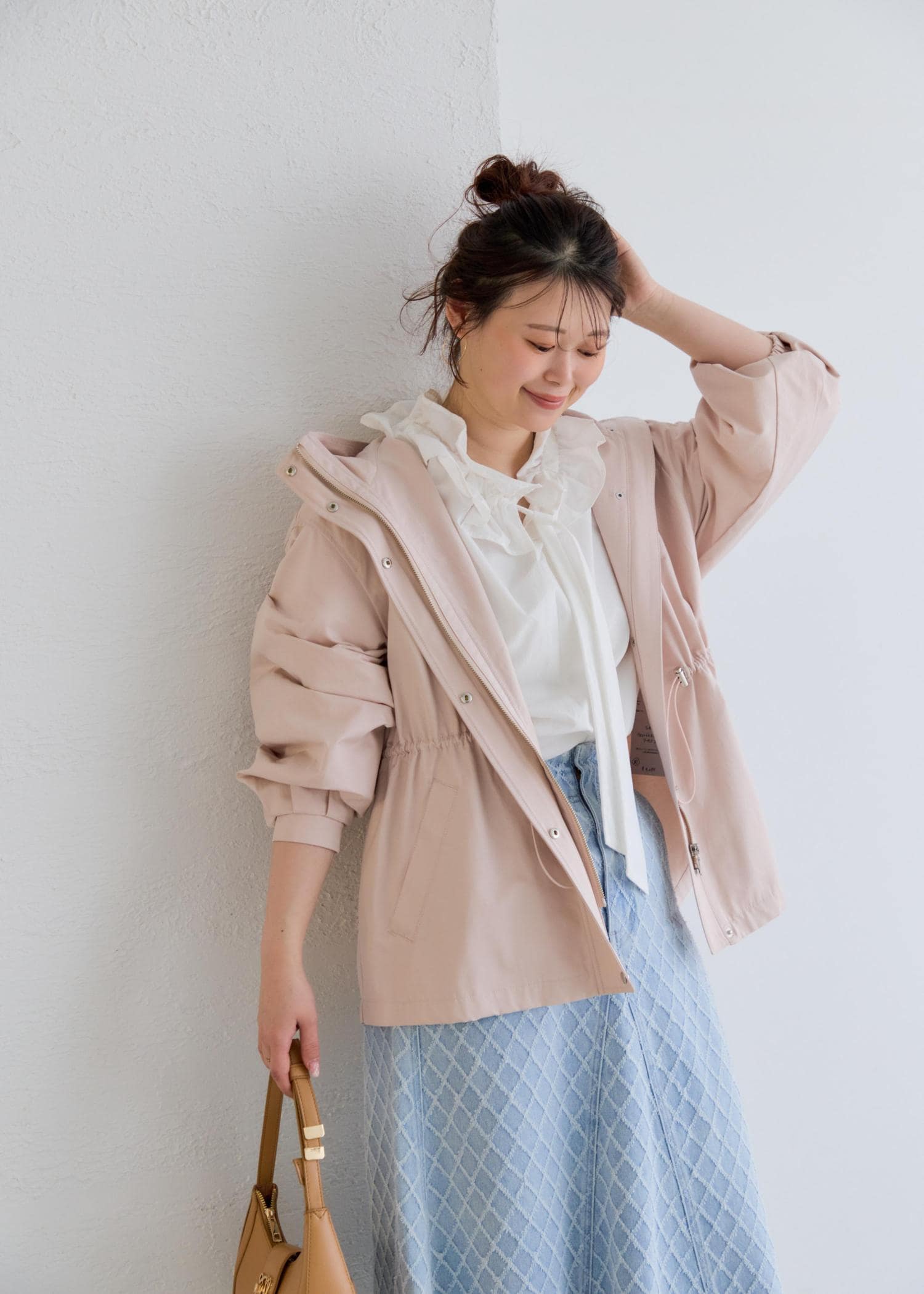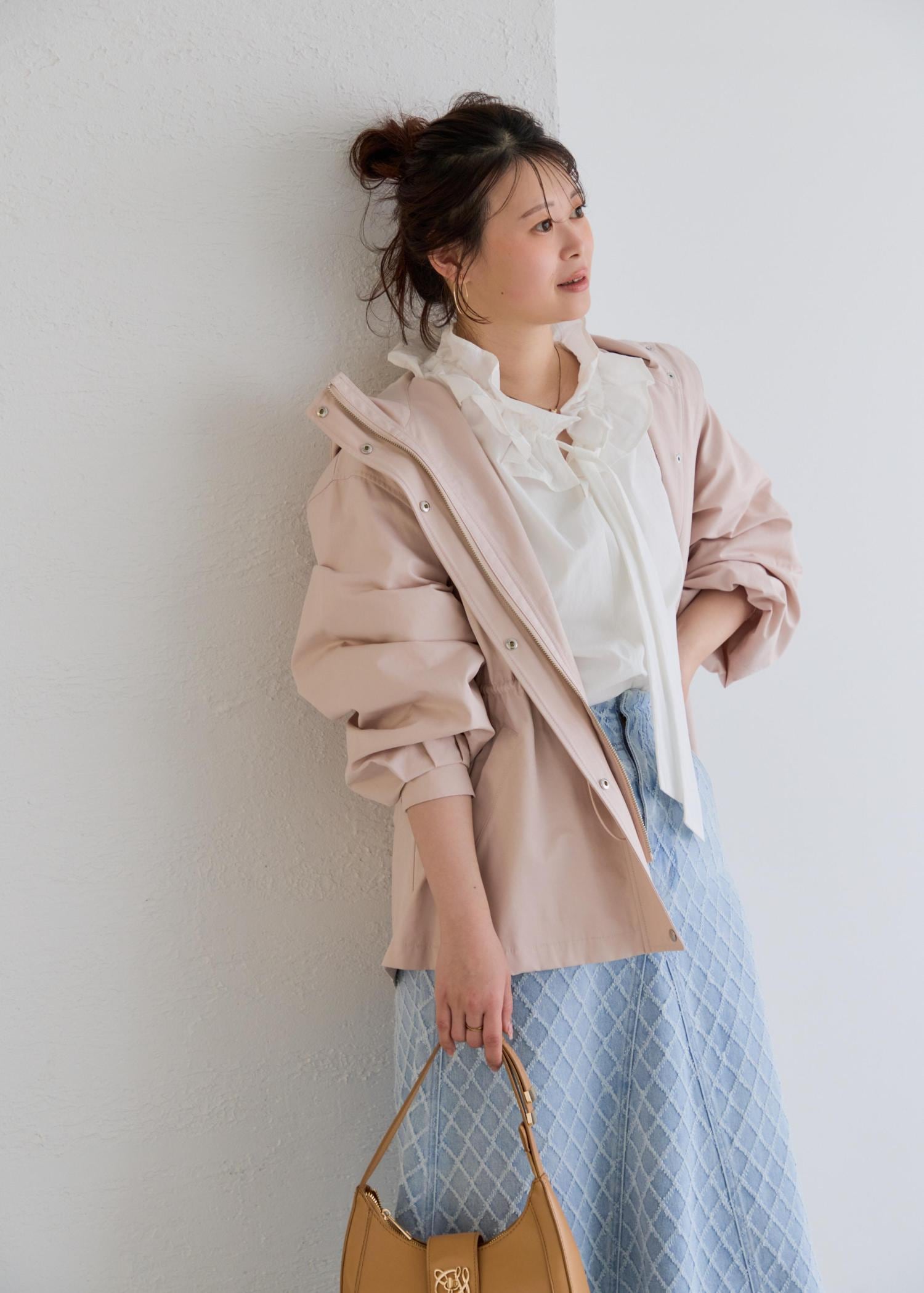 季節の変わり目にもピッタリなナイロンジャケットは淡いピンクカラーに、ネック部分のフリルは張り感があり、デニムはロング丈でバランス◎