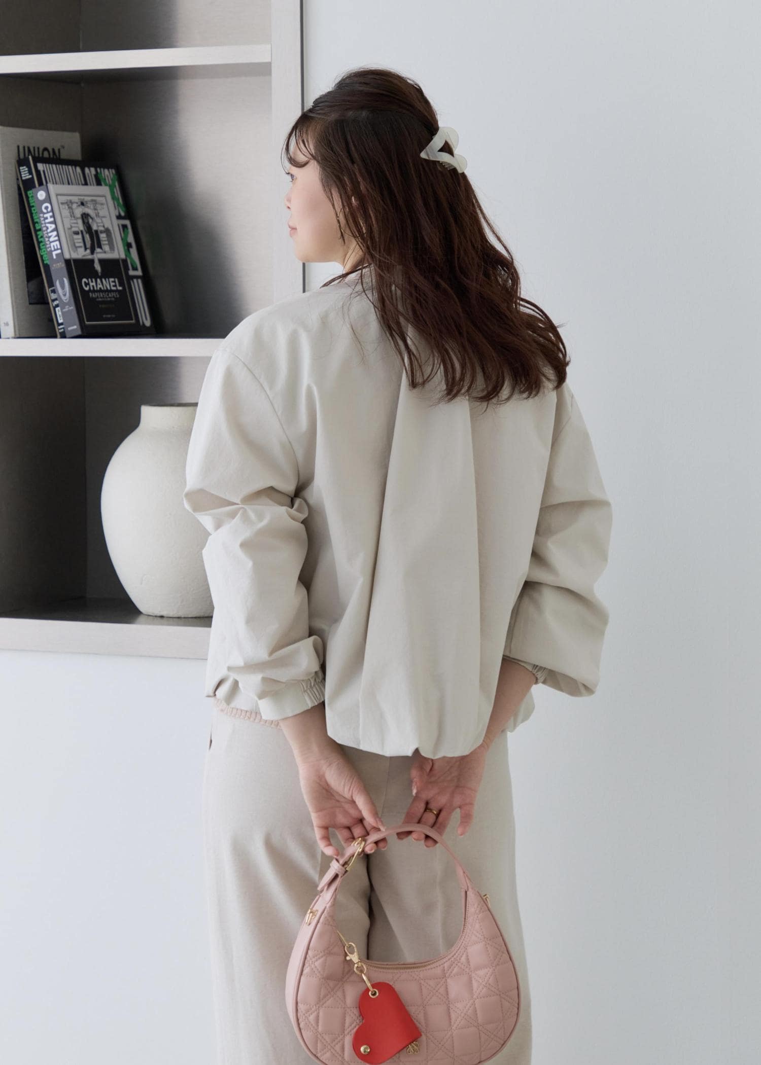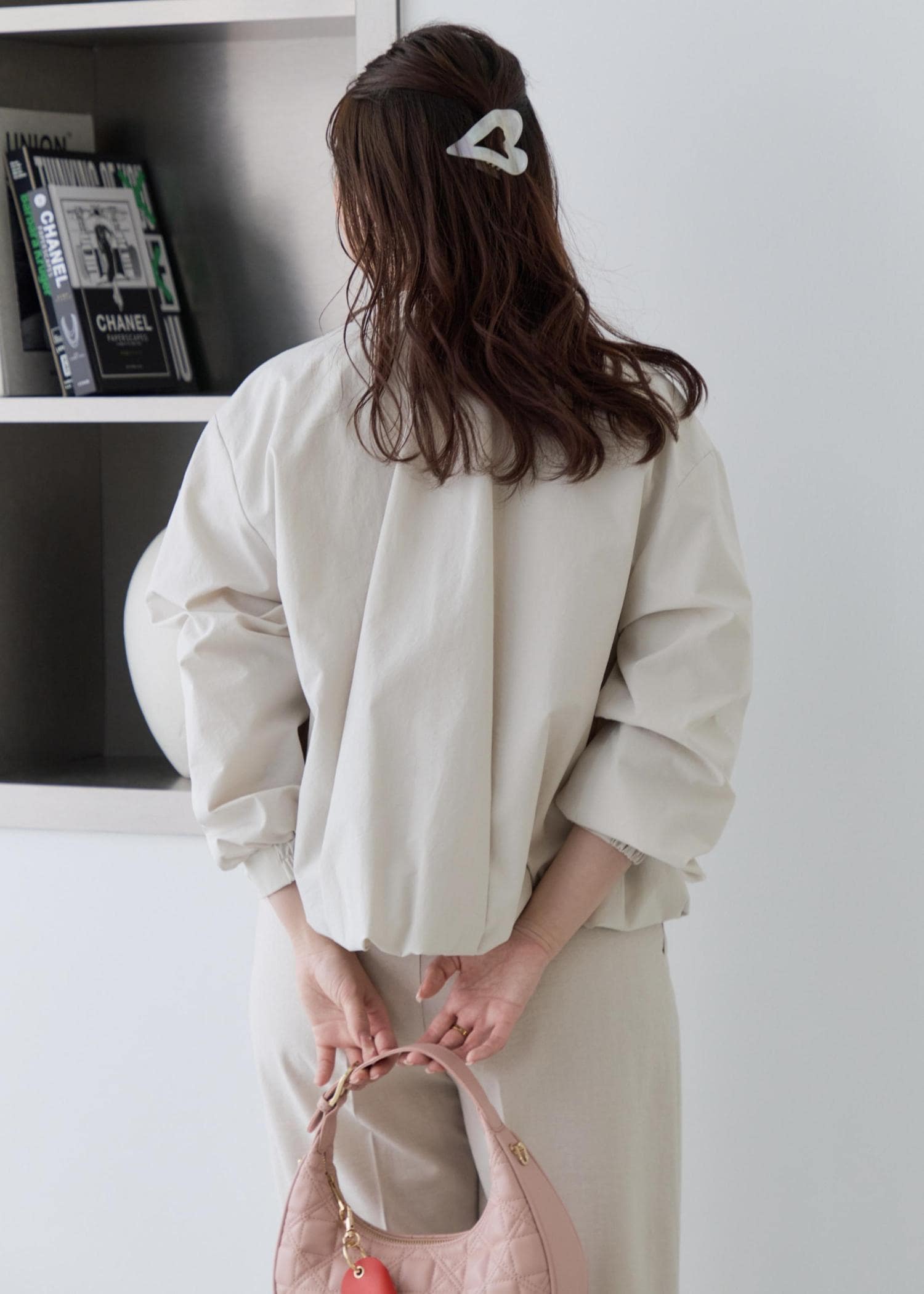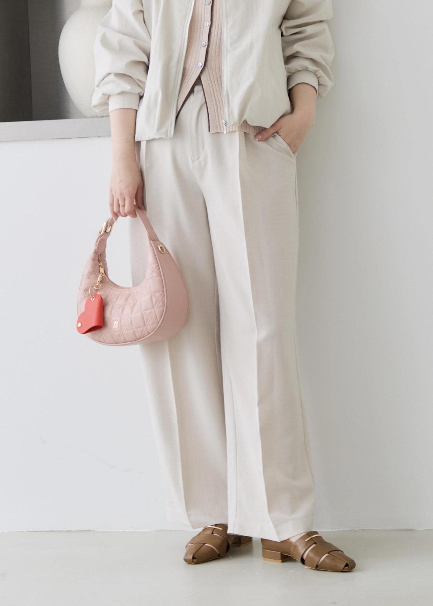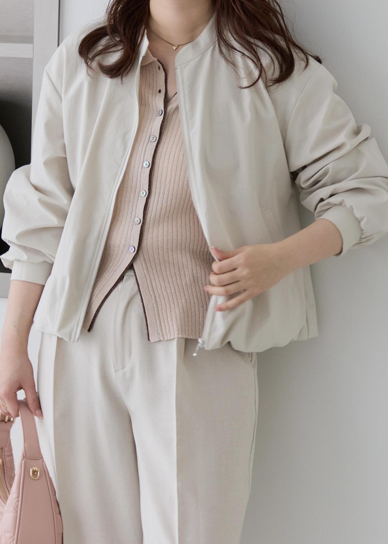 ショート丈の春ブルゾンに、インナーはラメの効いた配色がお洒落なピンクのカーディガンを合わせ、ボトムは綺麗みえするホワイト系のワイドパンツを合わせ、小物はピンクカラーで春らしいアイテムを合わせてみました!