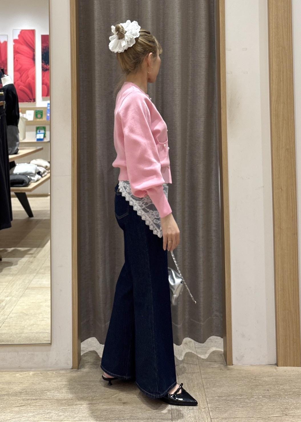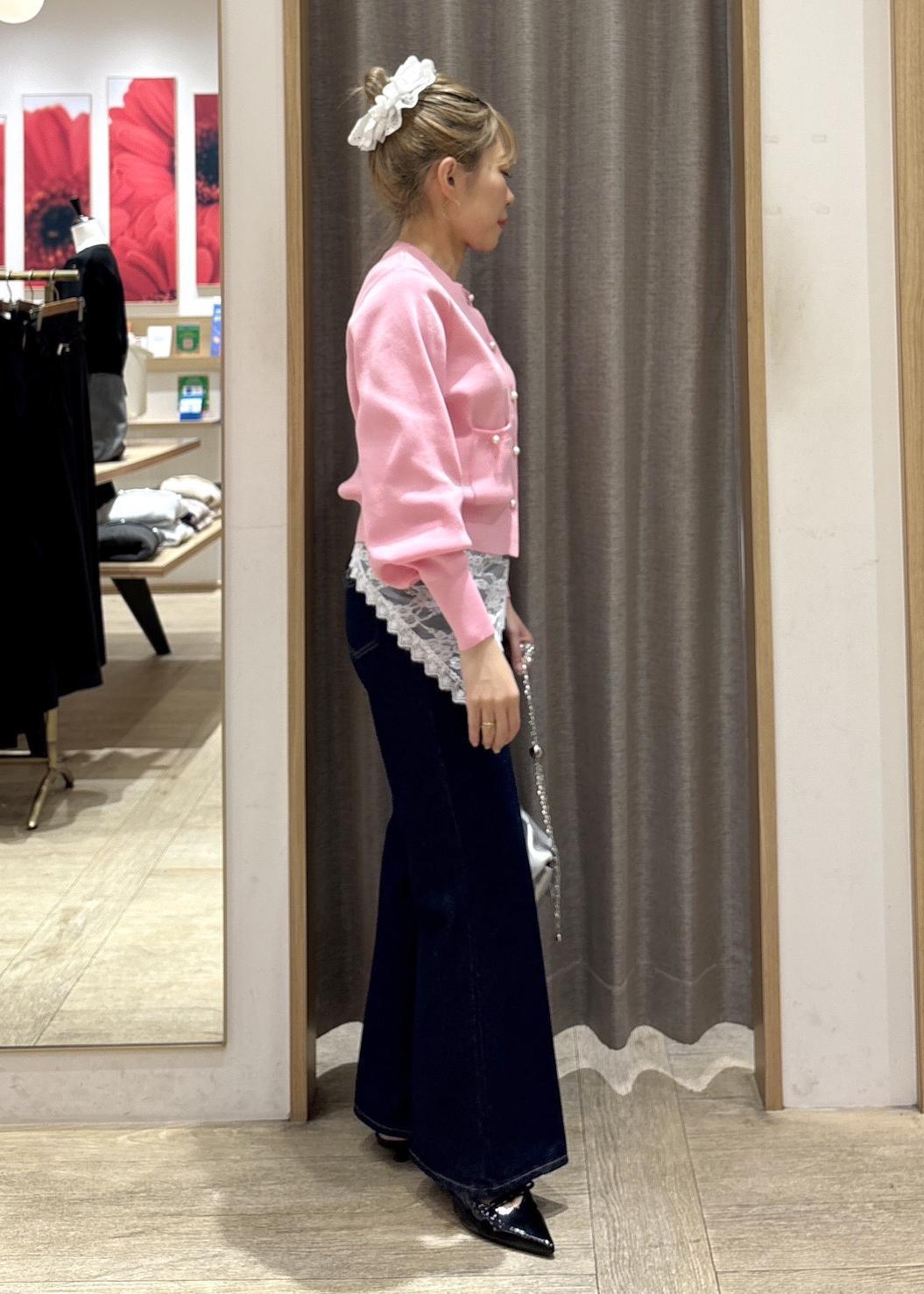 VISパールボタンカーディガンピンク / F¥6,589レビュー身長154㎝でFサイズ着用。
