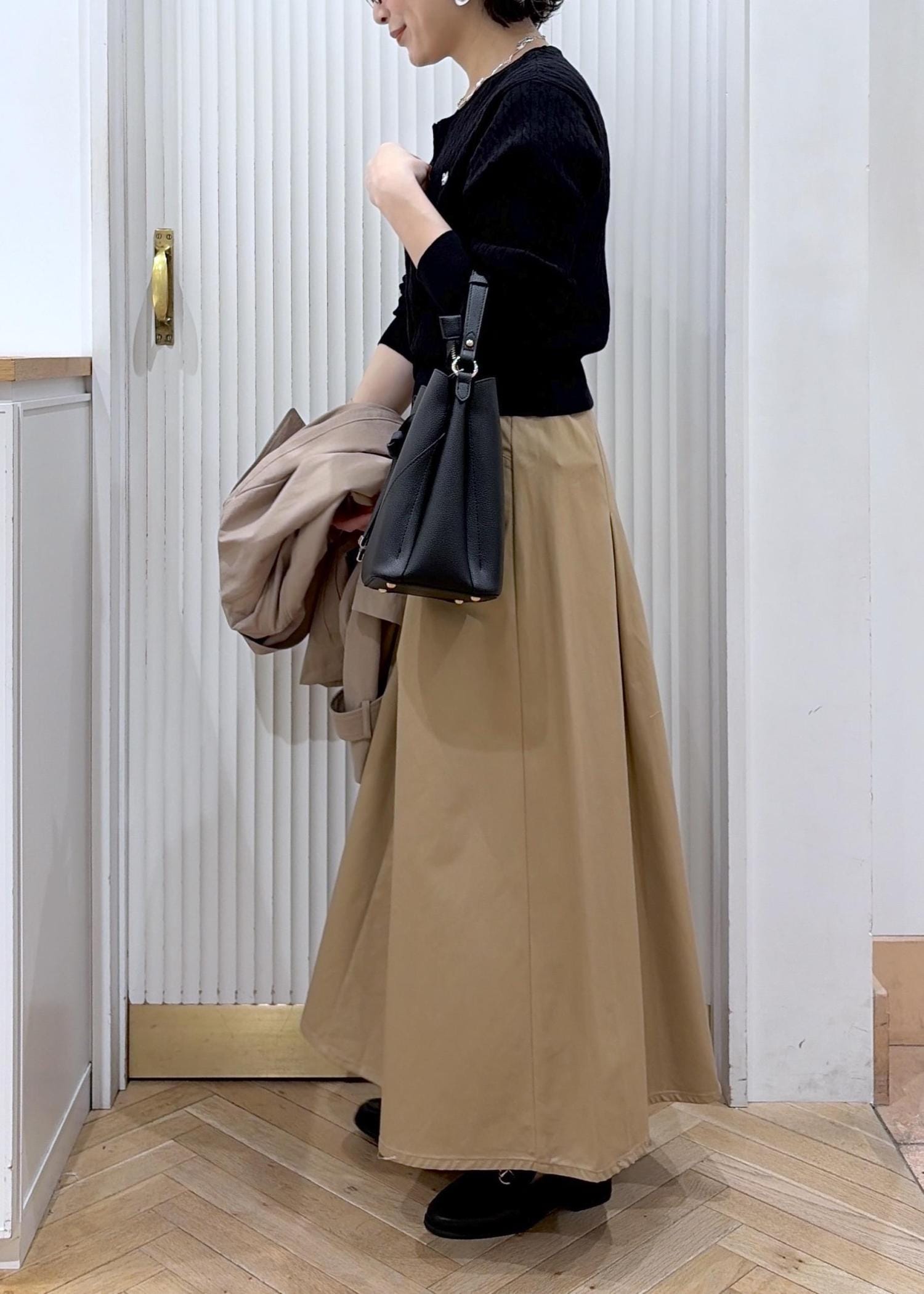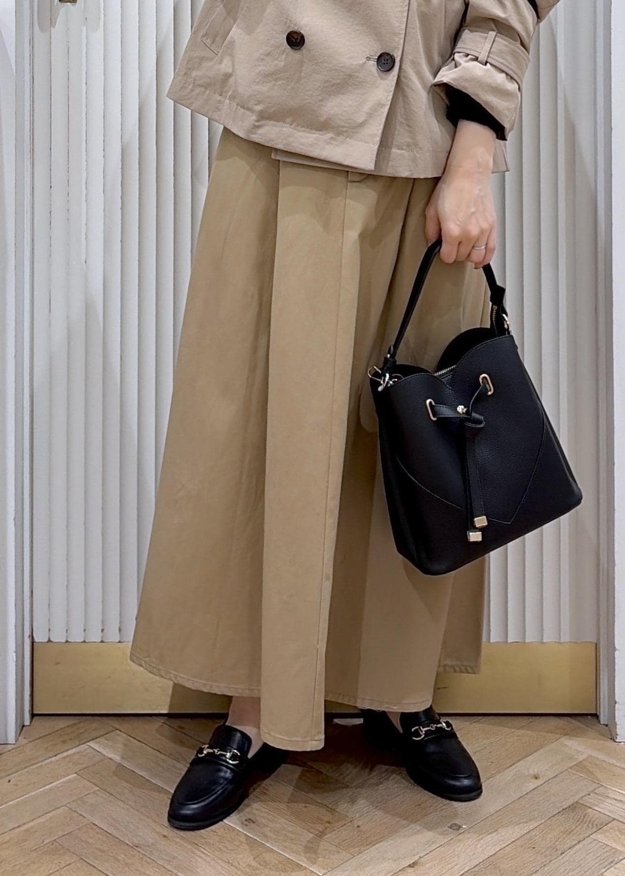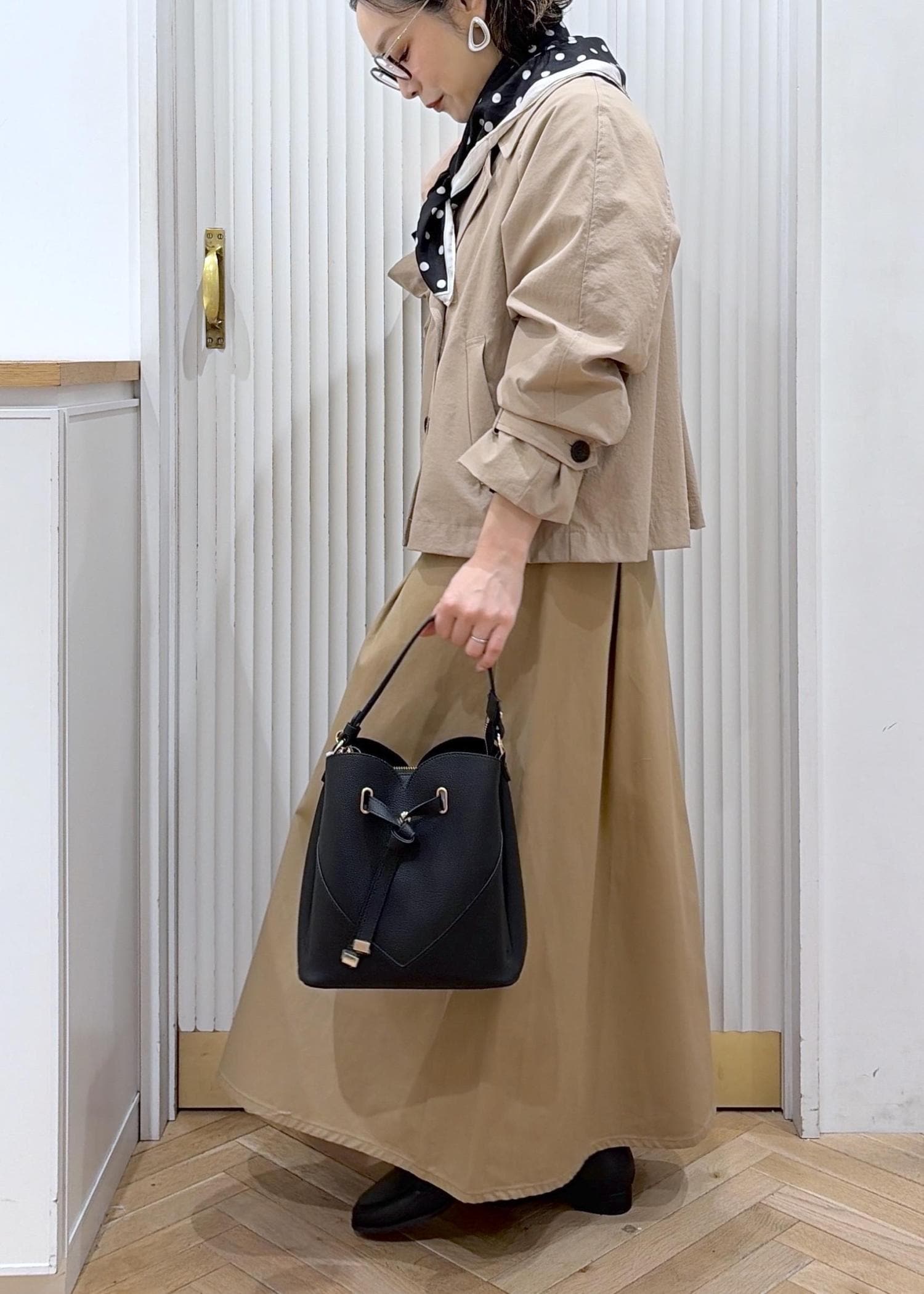 ベージュのワントーンとドットのスカーフ、小物はブラックで引き締めた大人な春コーデです。