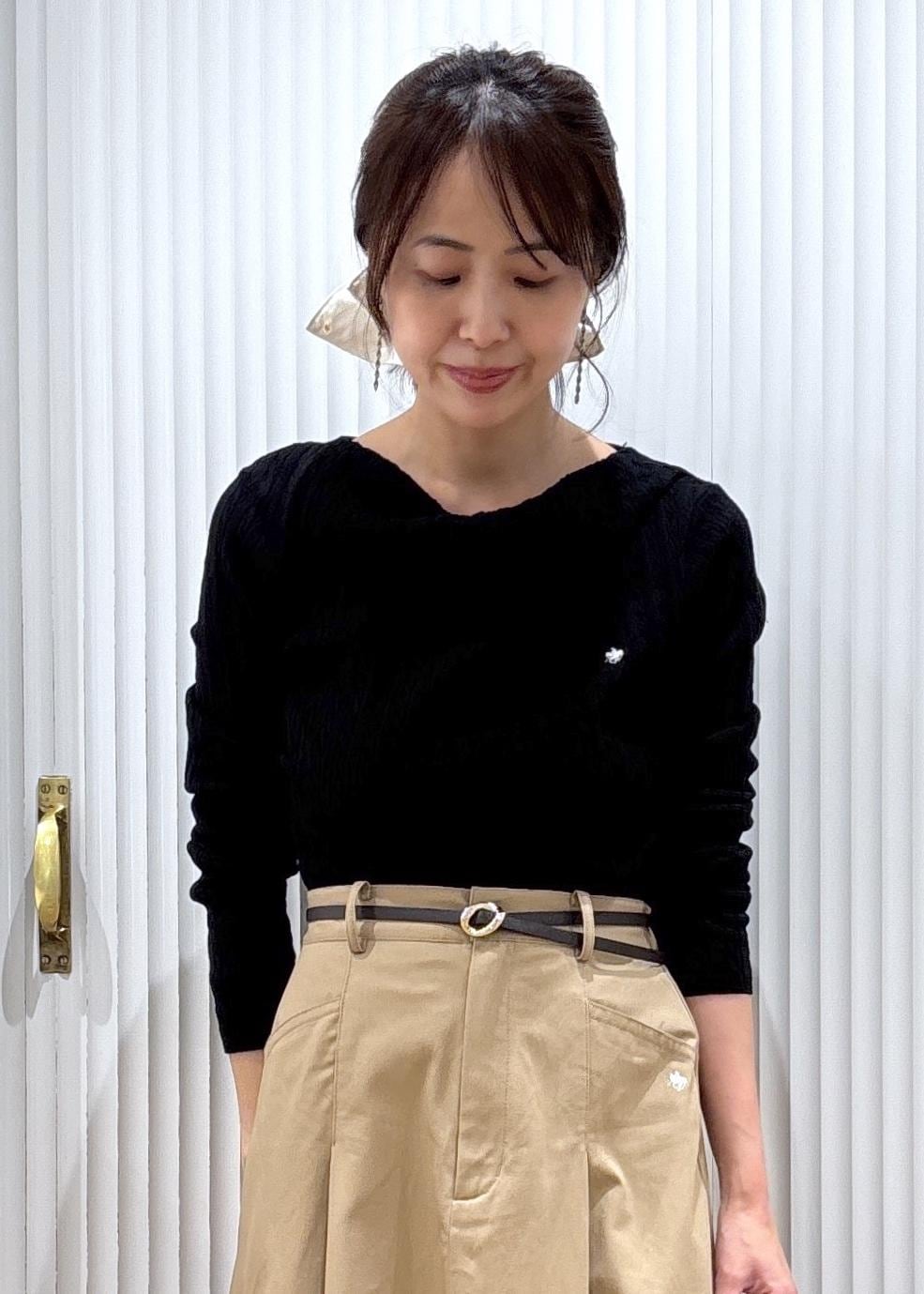 POLOコラボのドレープニットとスカートのコーディネートです。