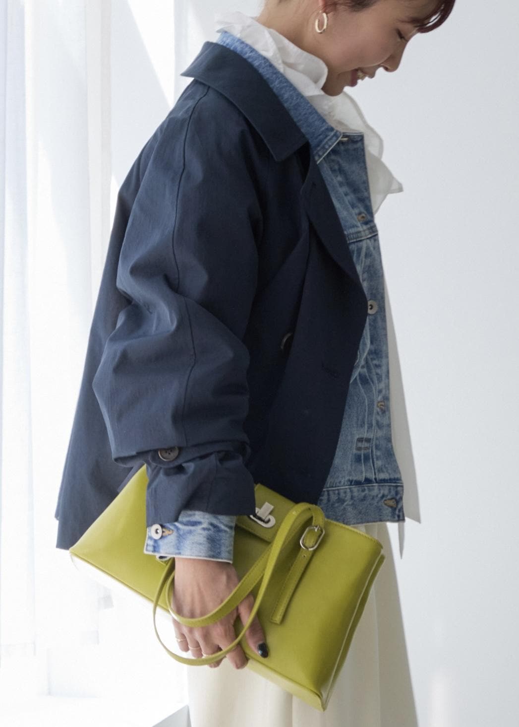 NEW!VISショートトレンチコート/UVケア・撥水・花粉ガードネイビー / F¥13,090レビュー身長158cm、ゆったりとしたサイズ感ですが着丈は腰あたりまでのコンパクトな丈感。
