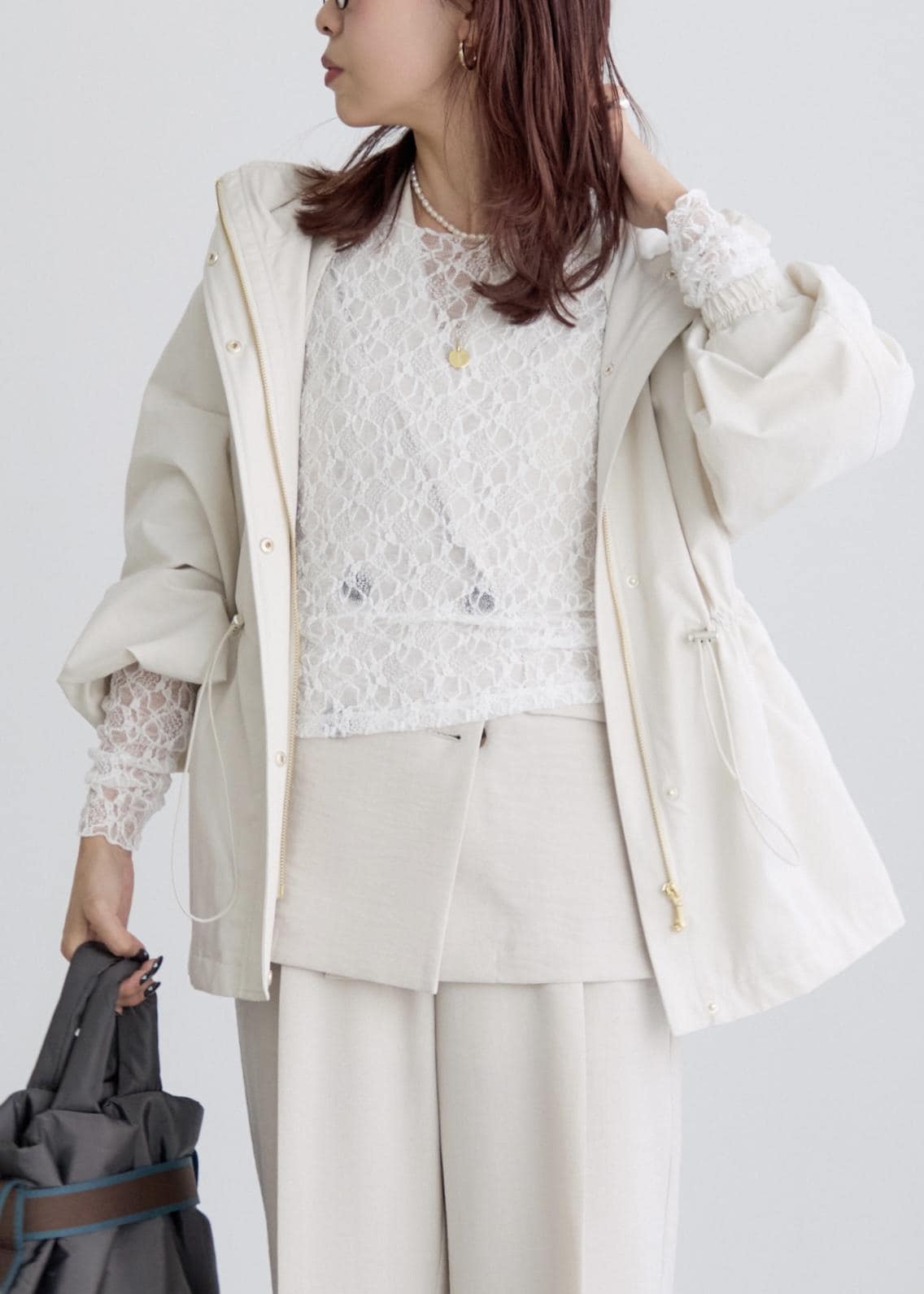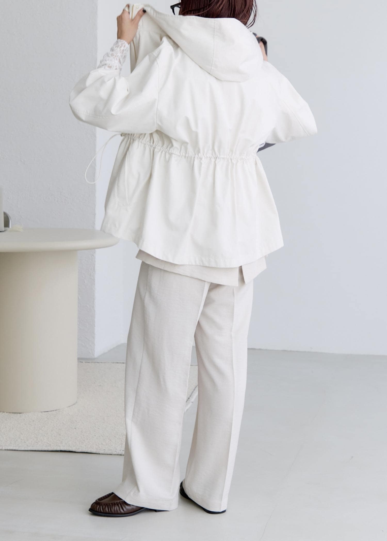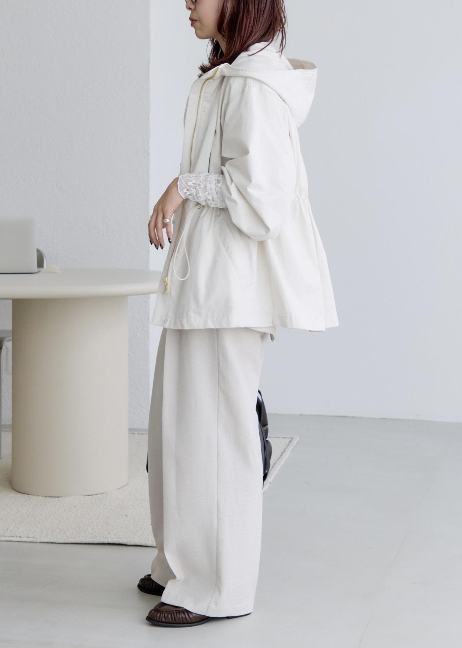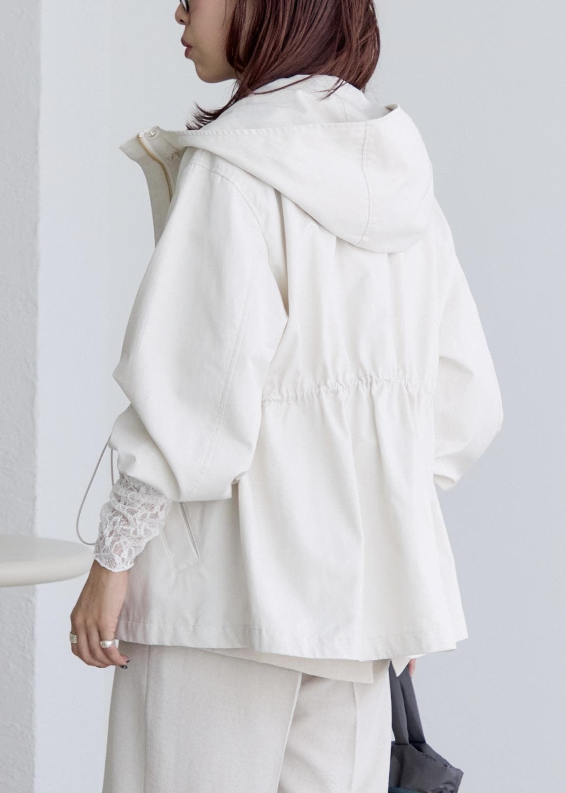 ウエストが絞れるようになっているので、一度ここで絞りを入れシルエットにメリハリを作ると、小柄な方でもバランスが取りやすく、着やすいと思います!