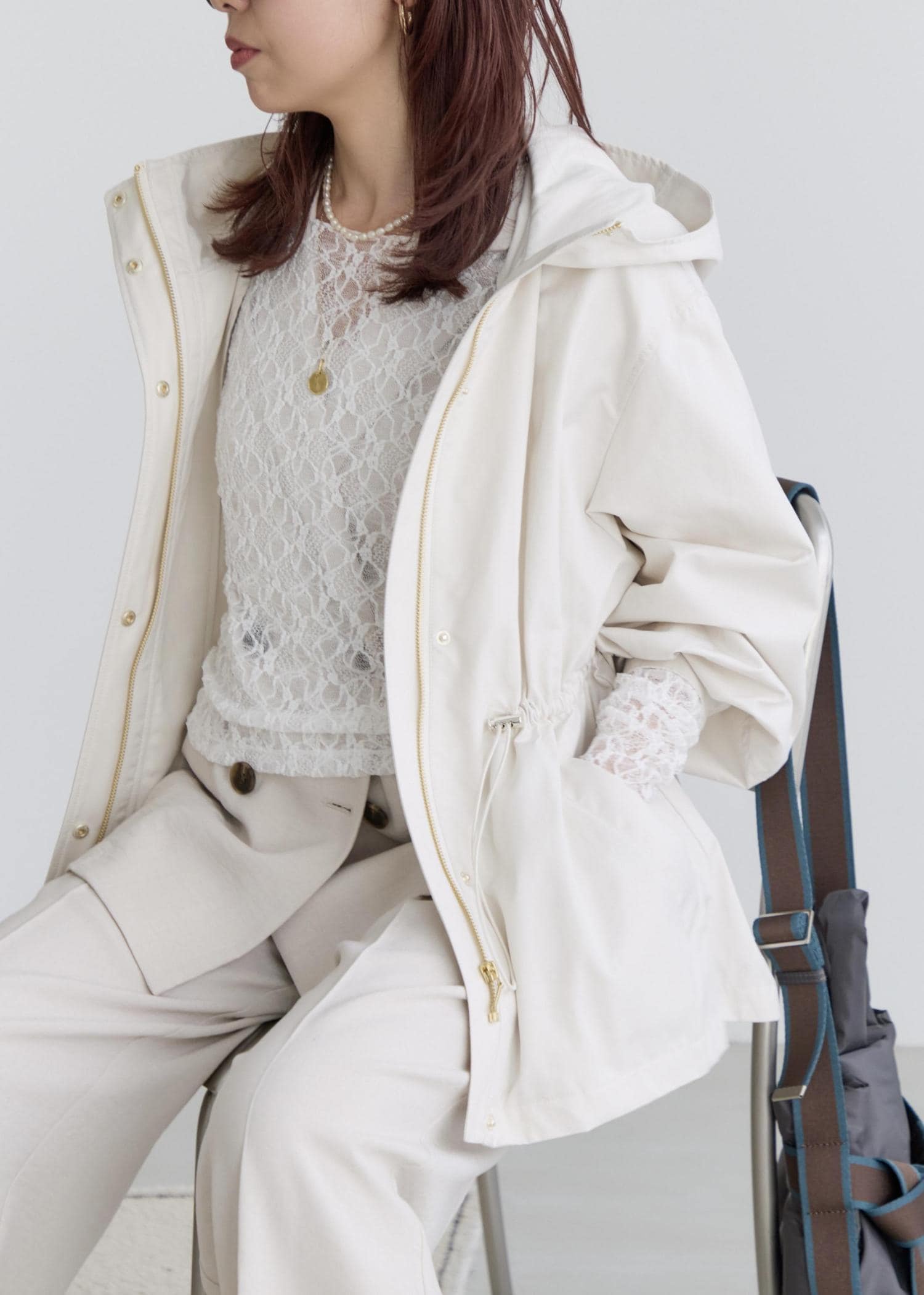マウンテンパーカーを合わせた、ホワイトコーデ。
