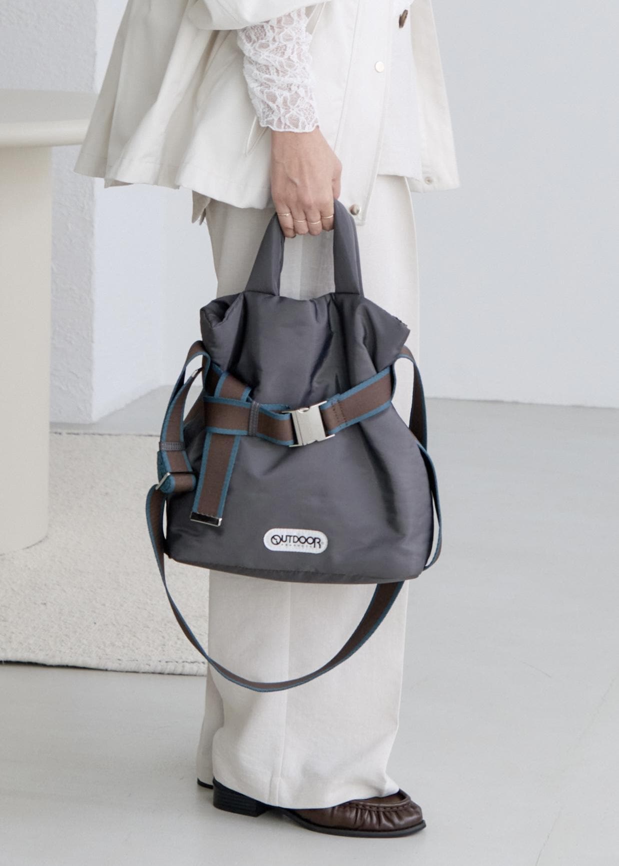 肩からも掛けられるため、入るだけ荷物をつい詰めてしまいそう、、!ただ、たくさん詰めても柔らかい素材なので、中の荷物の形状に合わせて少し広がるところも嬉しいのと、とにかくバッグ自体が軽いのもポイント!