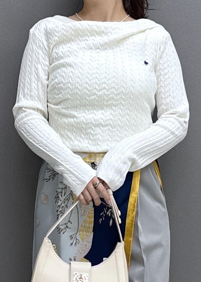 伸縮性のある柔らかい生地で着心地抜群◎ケーブル編みなので身体のラインを拾いにくく、1枚で着ても、ジャケットのインナーとしても重宝しそうです! -