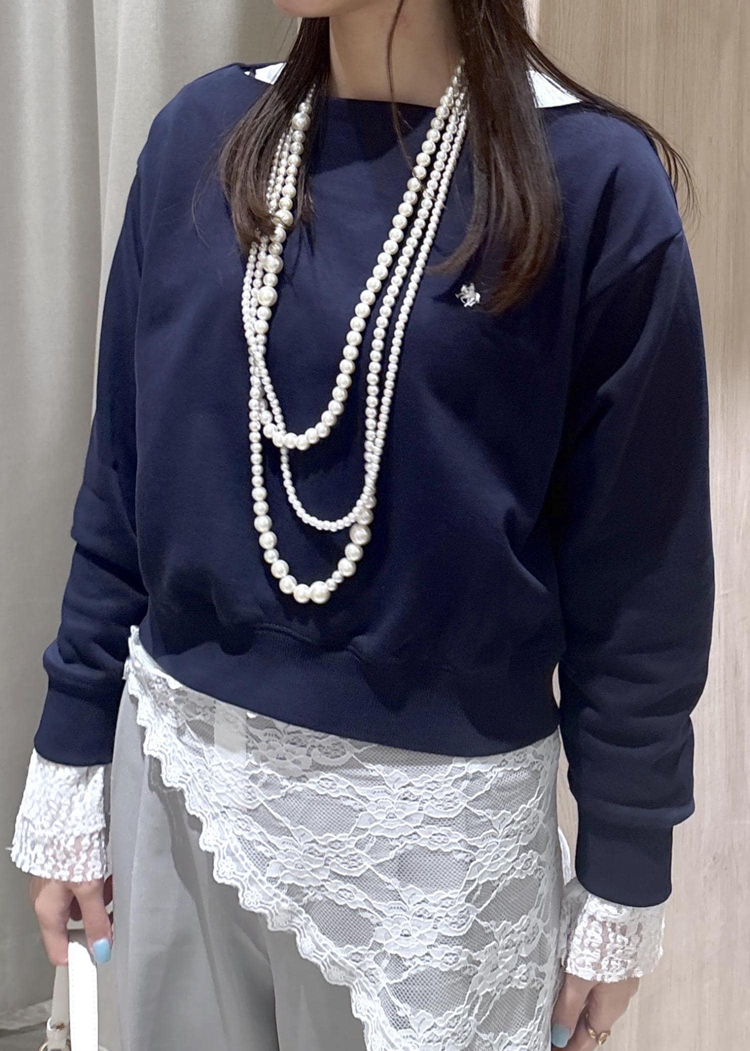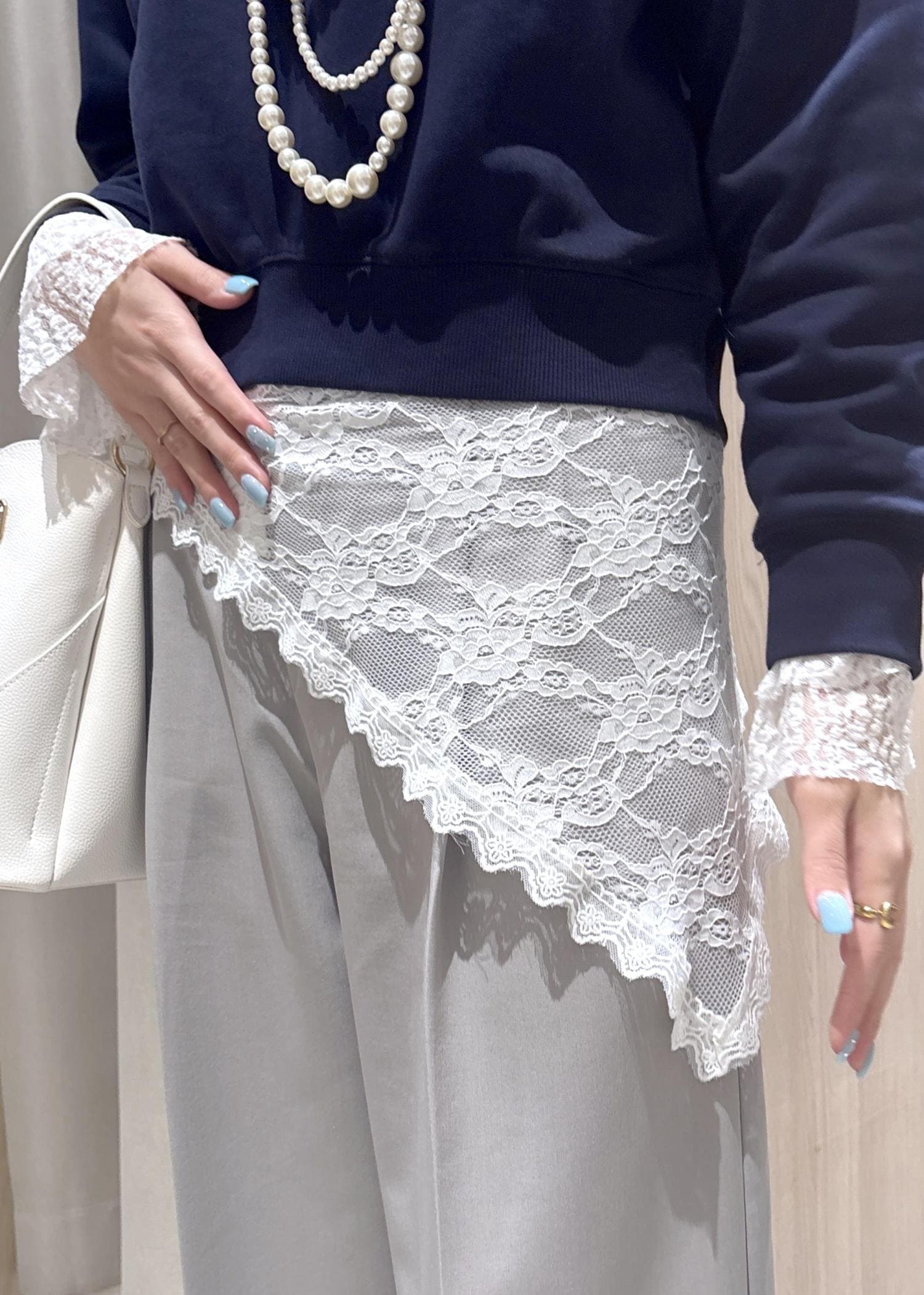 カジュアルなスウェットはレースのインナーと合わせるとフェミニンで女性らしい印象に◎