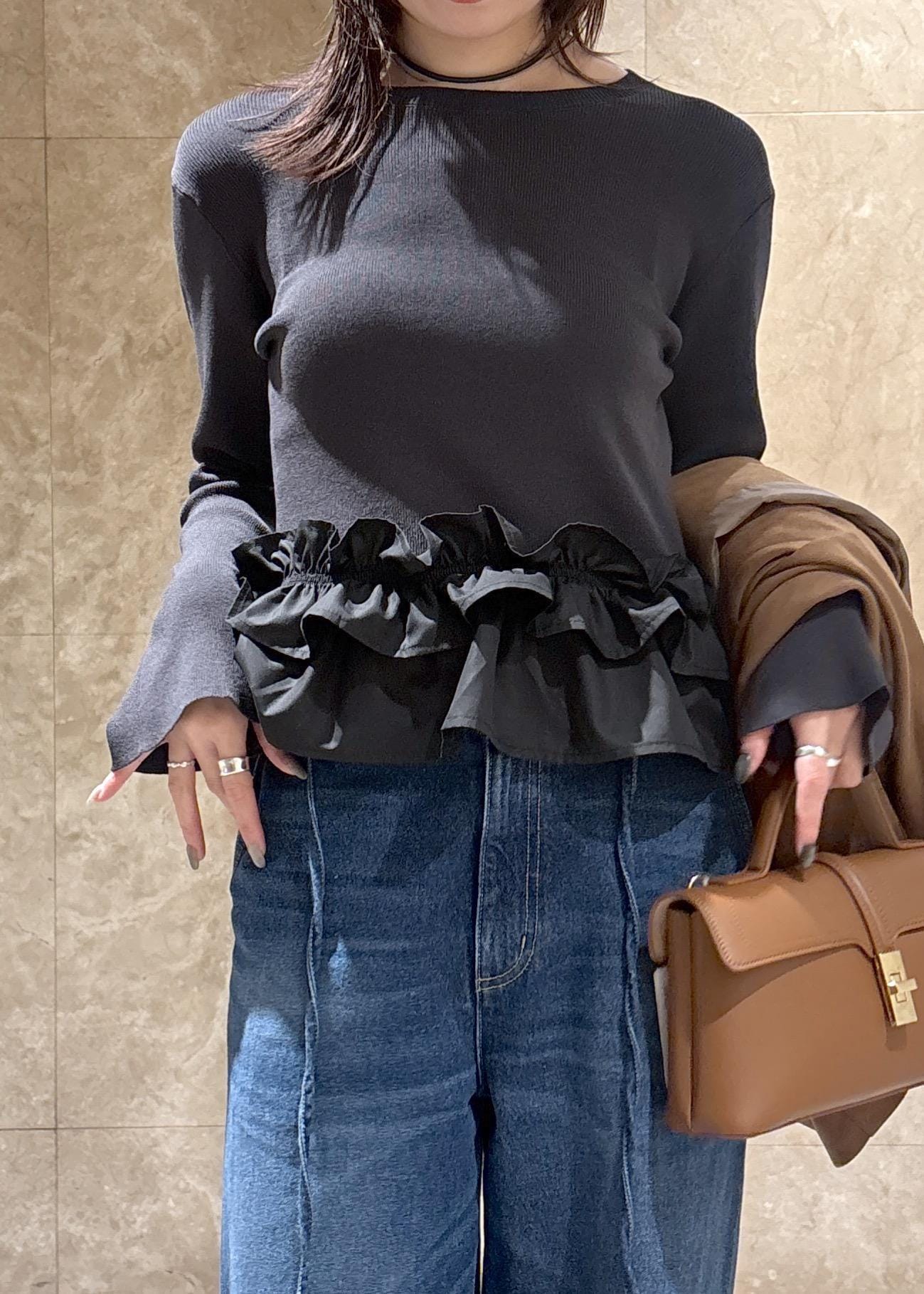 VIS裾フリルティアードドッキングニットチャコール / F¥5,929レビューフレアスリーブと程よくボディラインを拾うシルエットでスッキリ見えるニット。