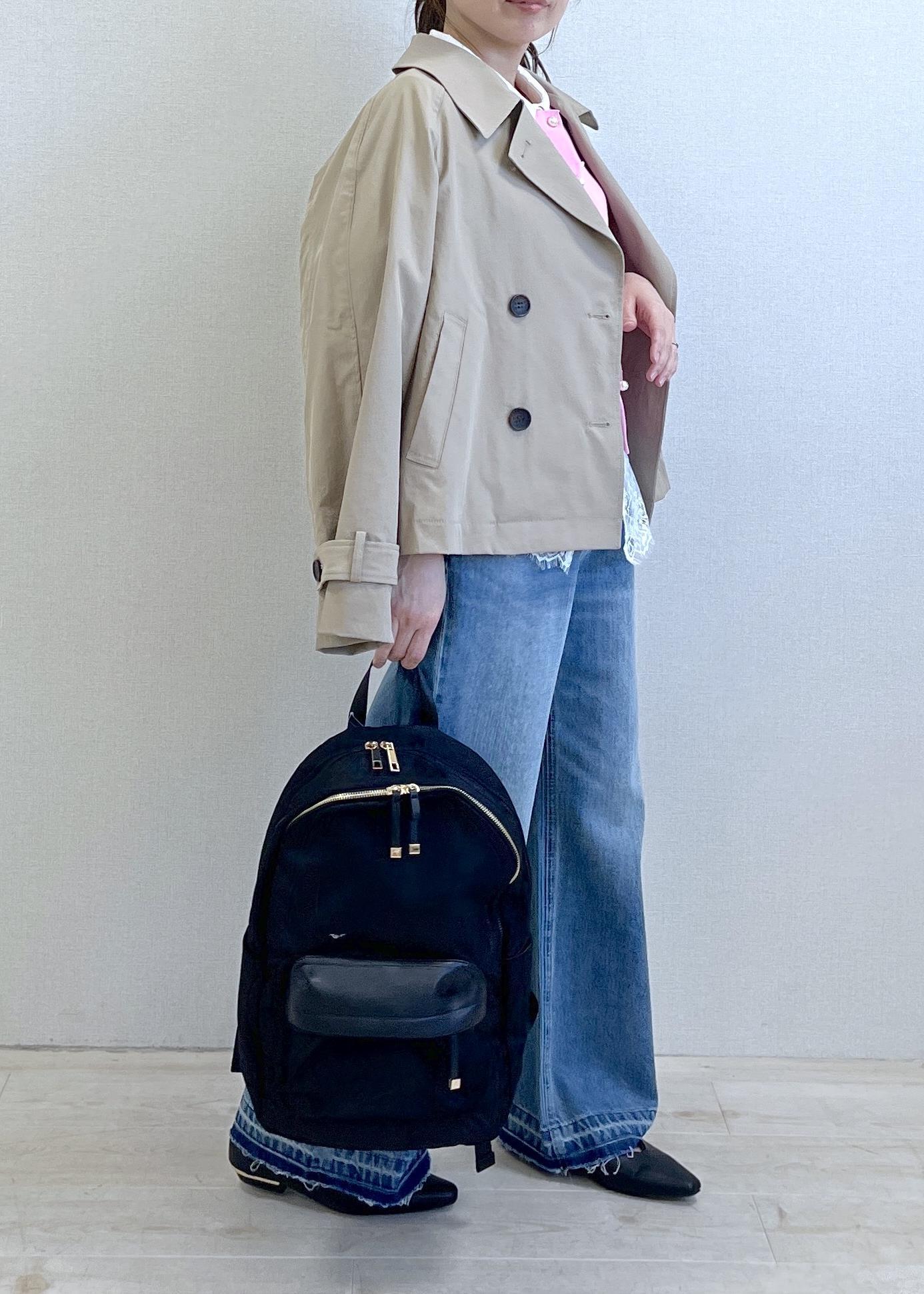 NEW!VISショートトレンチコート/UVケア・撥水・花粉ガードベージュ系 / F¥13,090レビュー152cmでFサイズ着用し、着丈は腰にかかるくらいの丈。オーバーサイズの今年らしいデザイン。小柄には嬉しいバランスのとりやすい丈でした。春らしいサラッとした軽めの素材感なのでカチッとしすぎずON.OFF使いやすそう。袖がボタンで絞ることが出来るので、手首見せもできたりと嬉しい拘りポイントが!