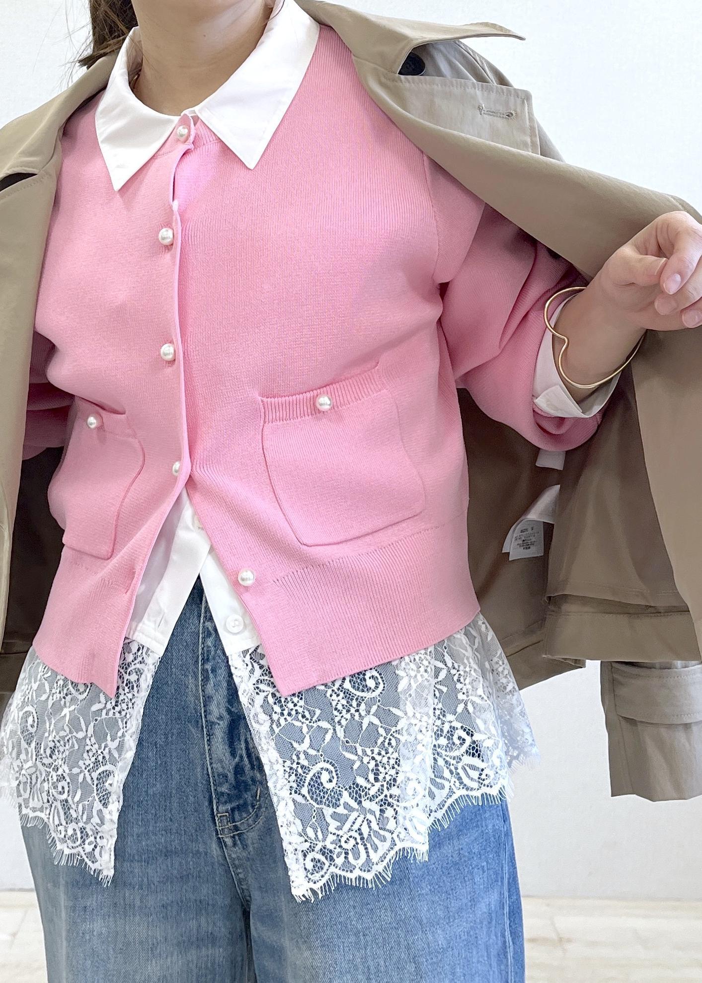 やわらかなピンクのカーディガンに