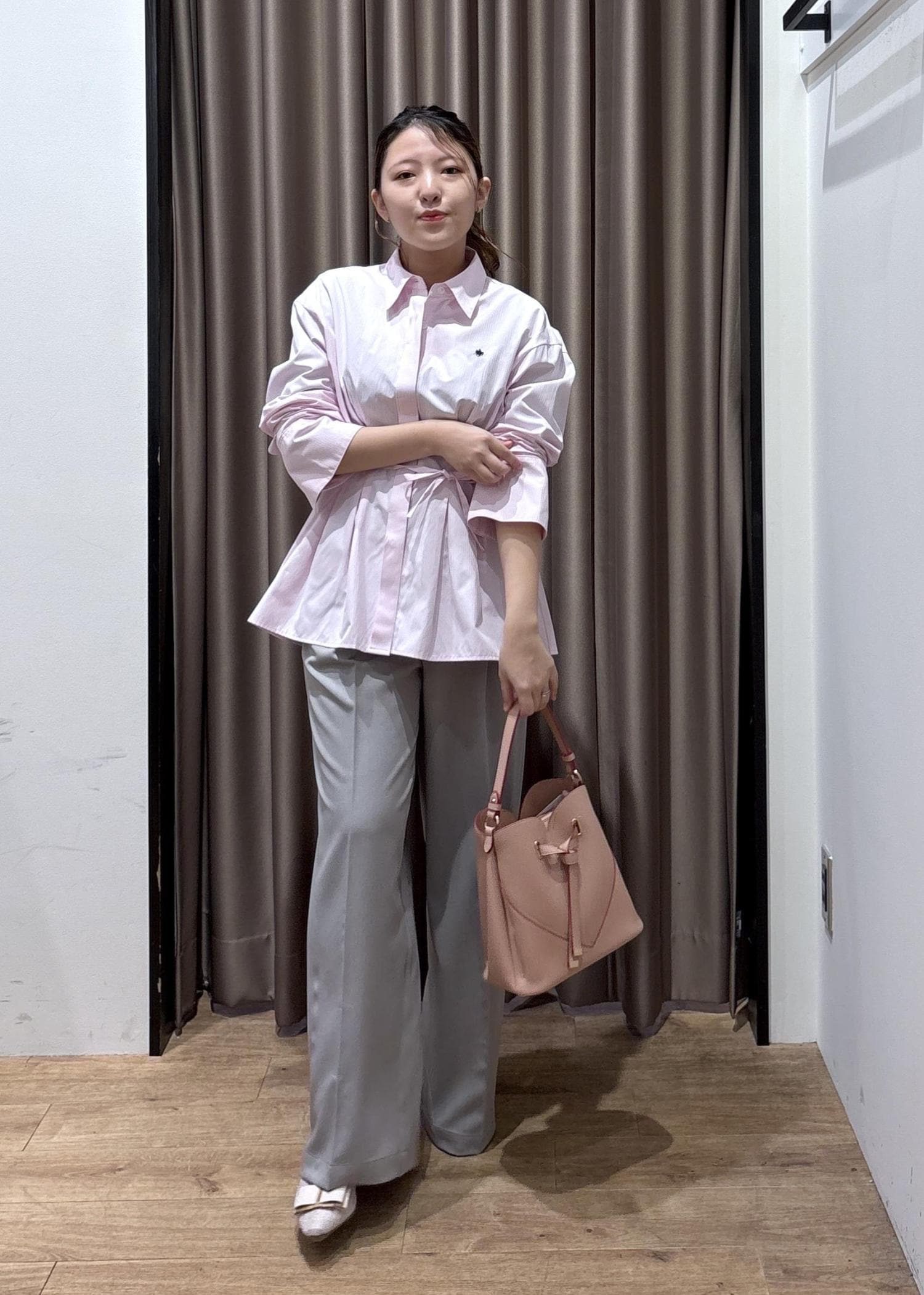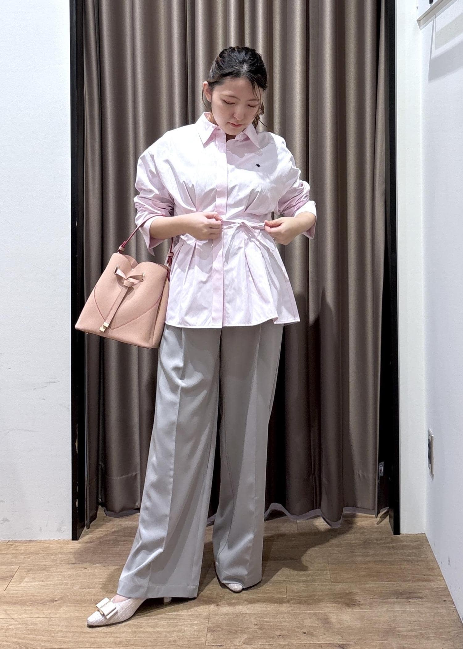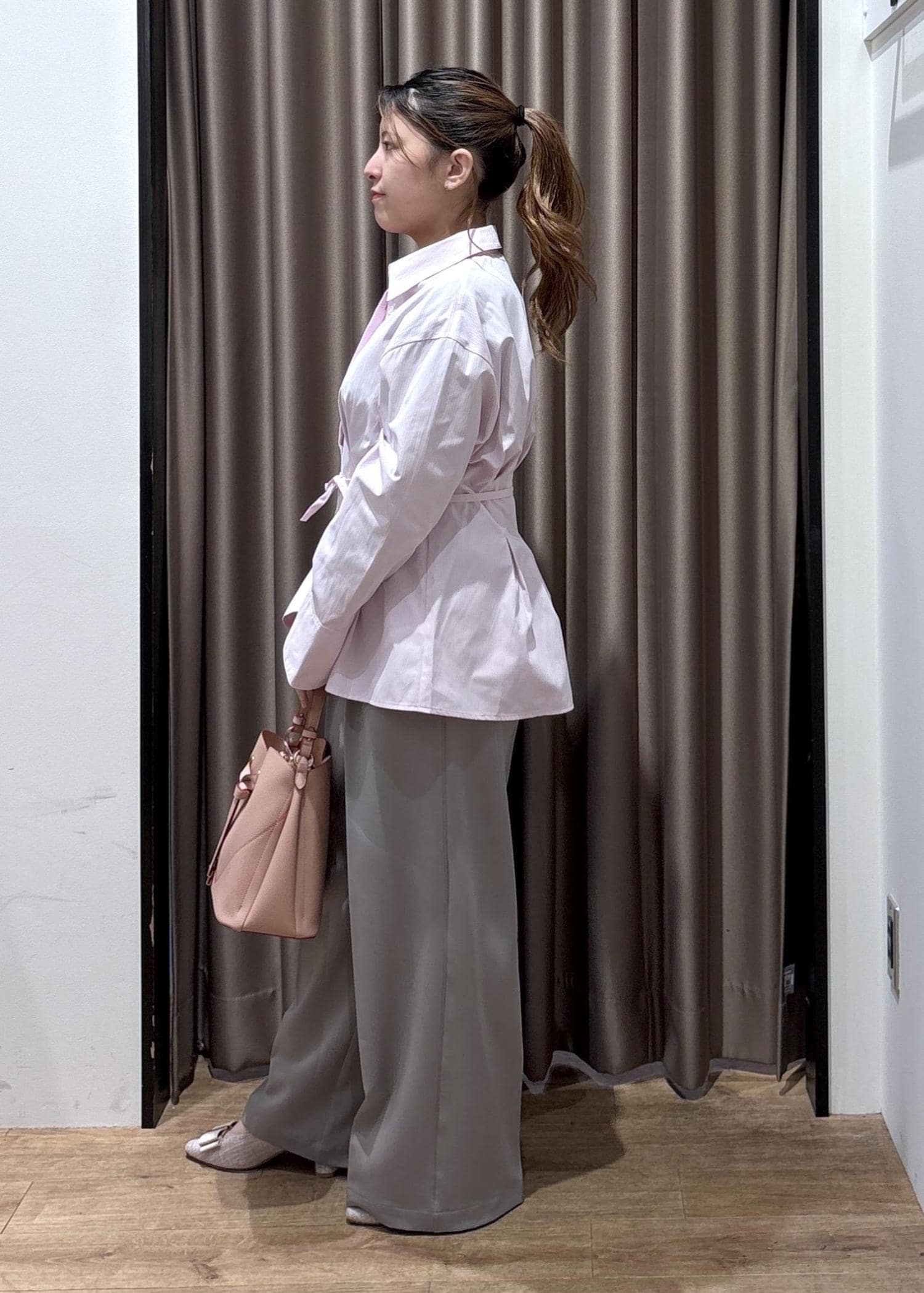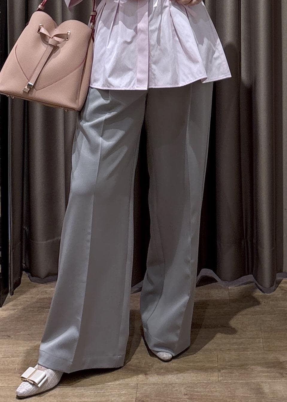 VISベルトディティールパンツ/防シワ・イージーケアライトグレー / M¥6,589レビュー153cm、Mサイズ着用でヒールをはいて床につかないくらいの丈感でした!
