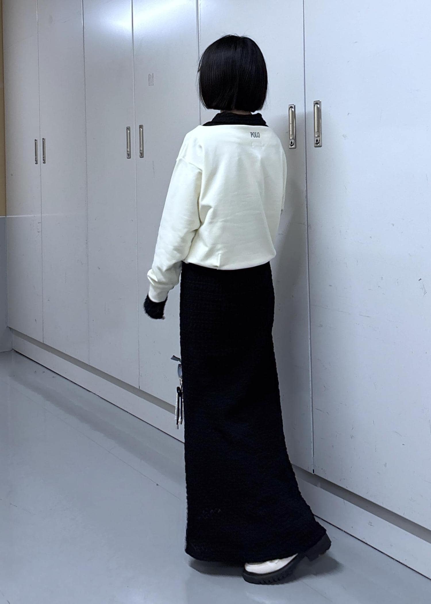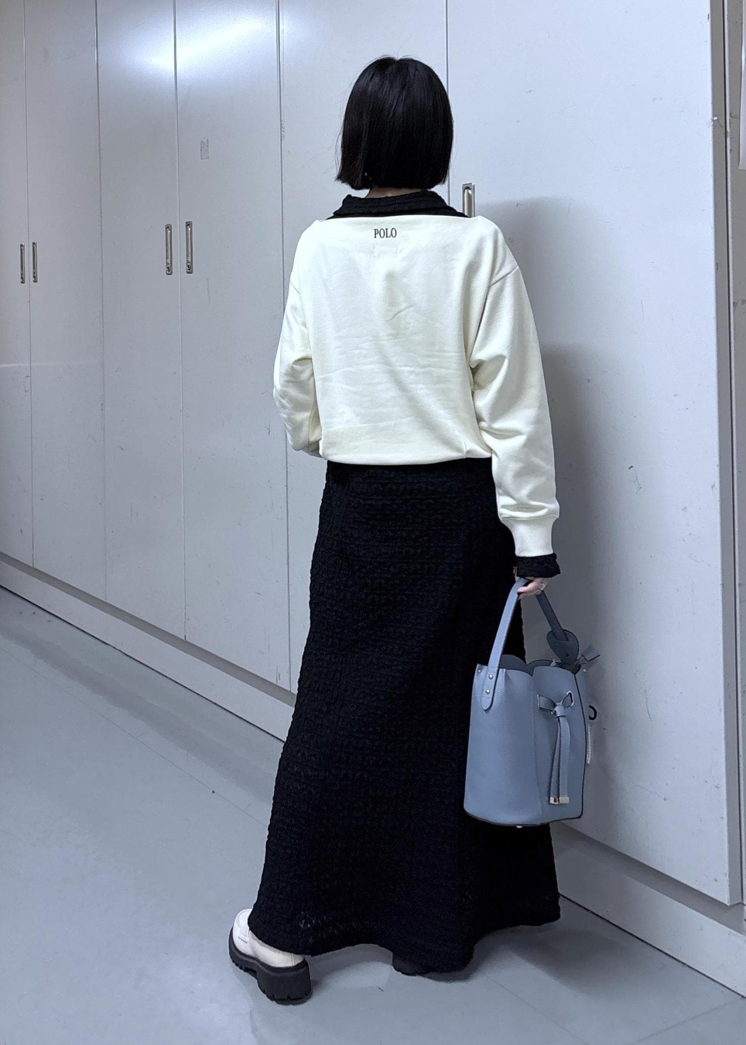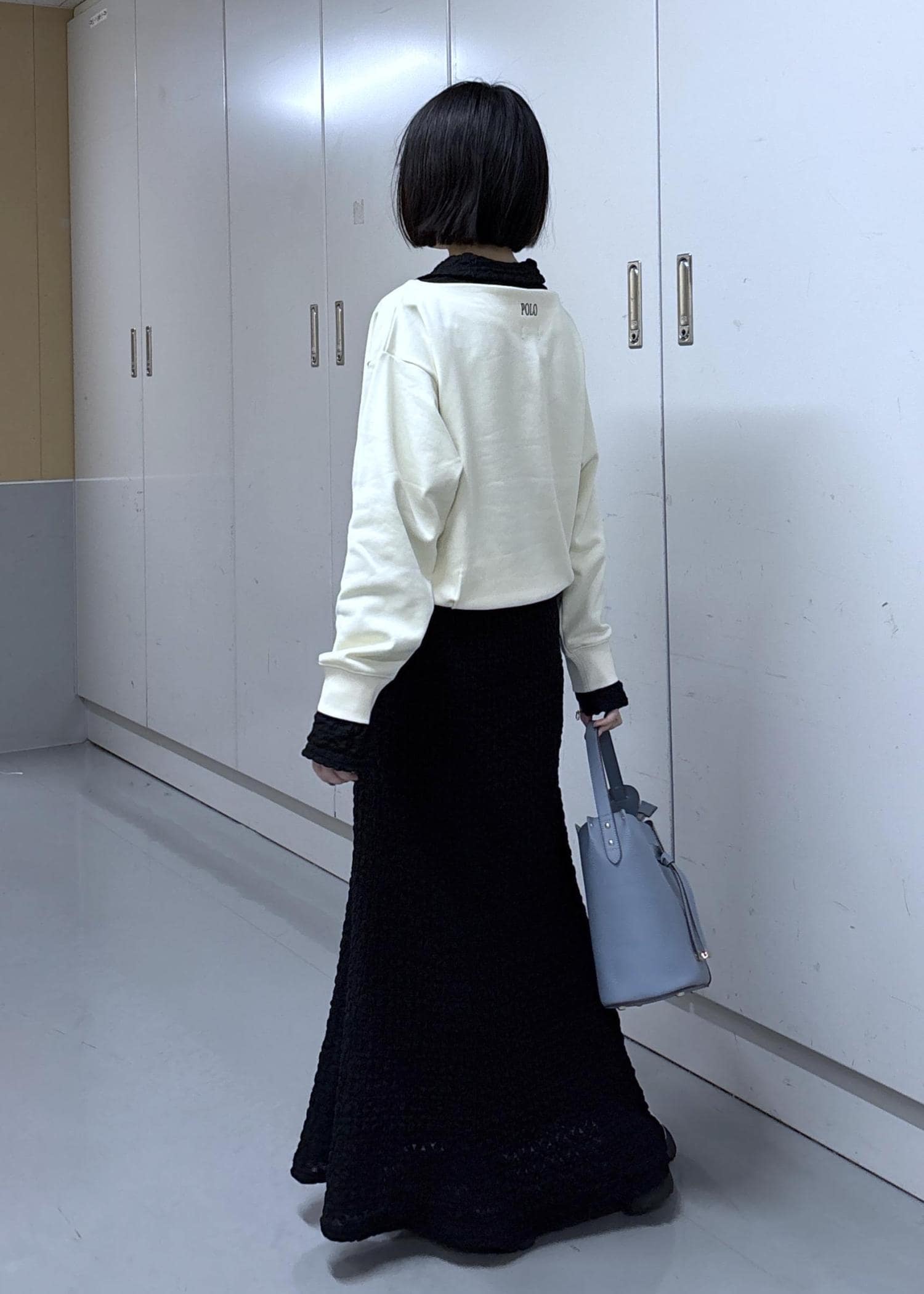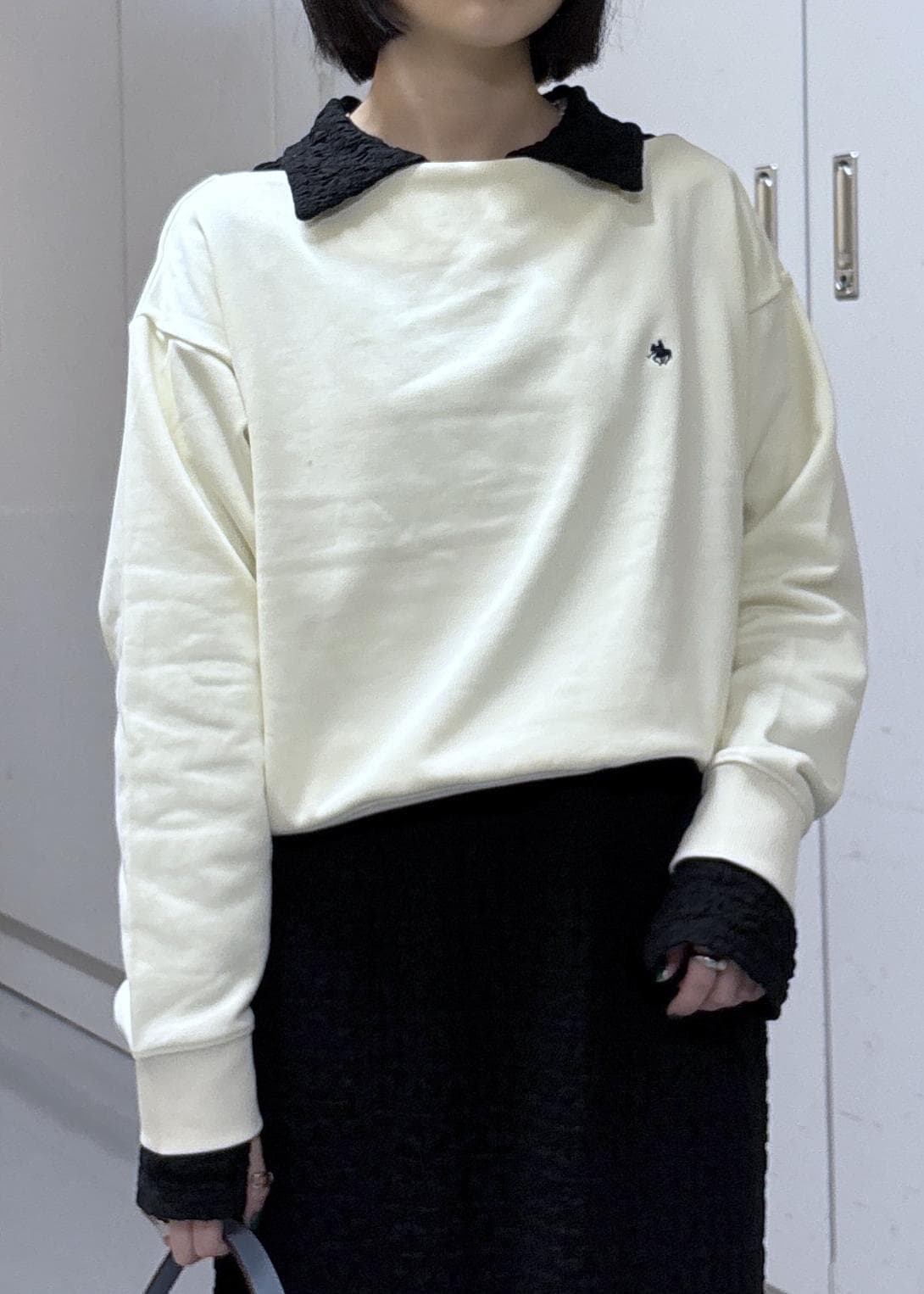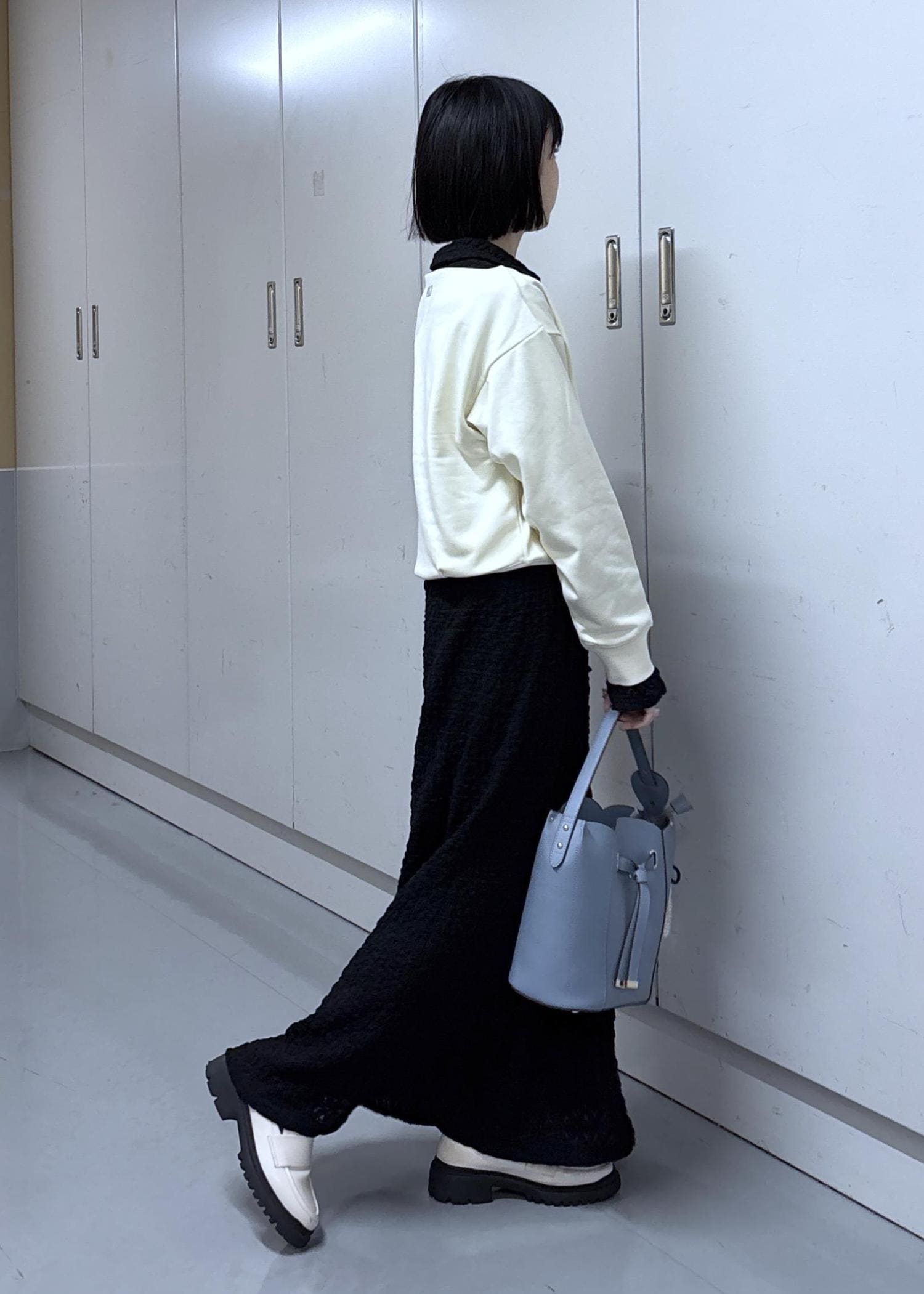 春にモノトーンは暗くない?と考える方もいるかもですが、レースのワンピースは抜け感が出せて、更に白のスウェットをレイヤードすることで明るい+今っぽい印象に♫