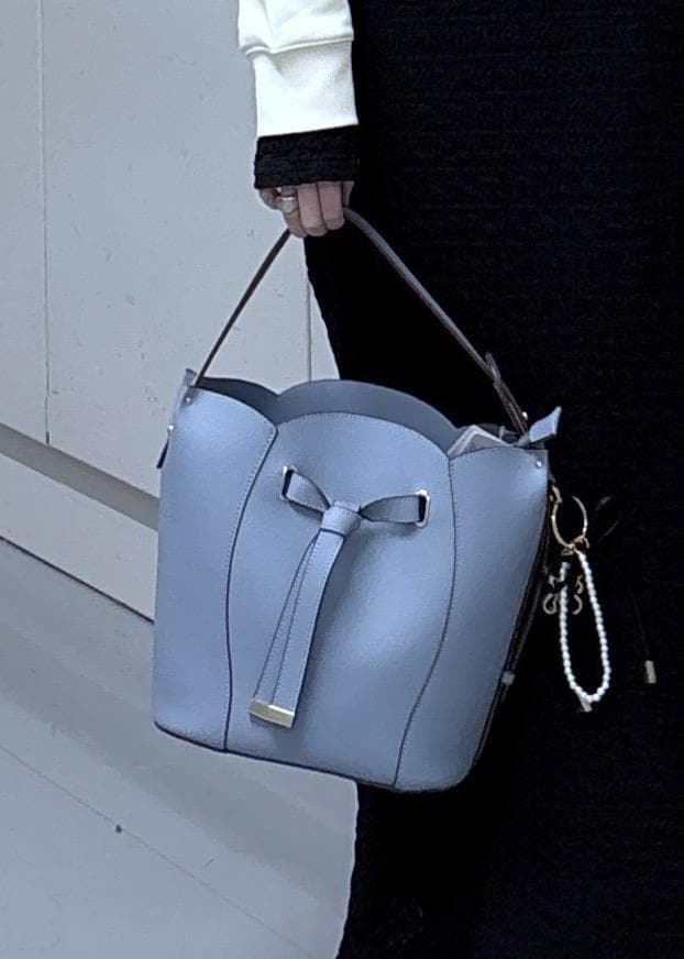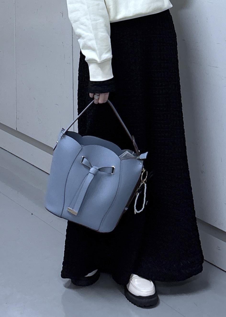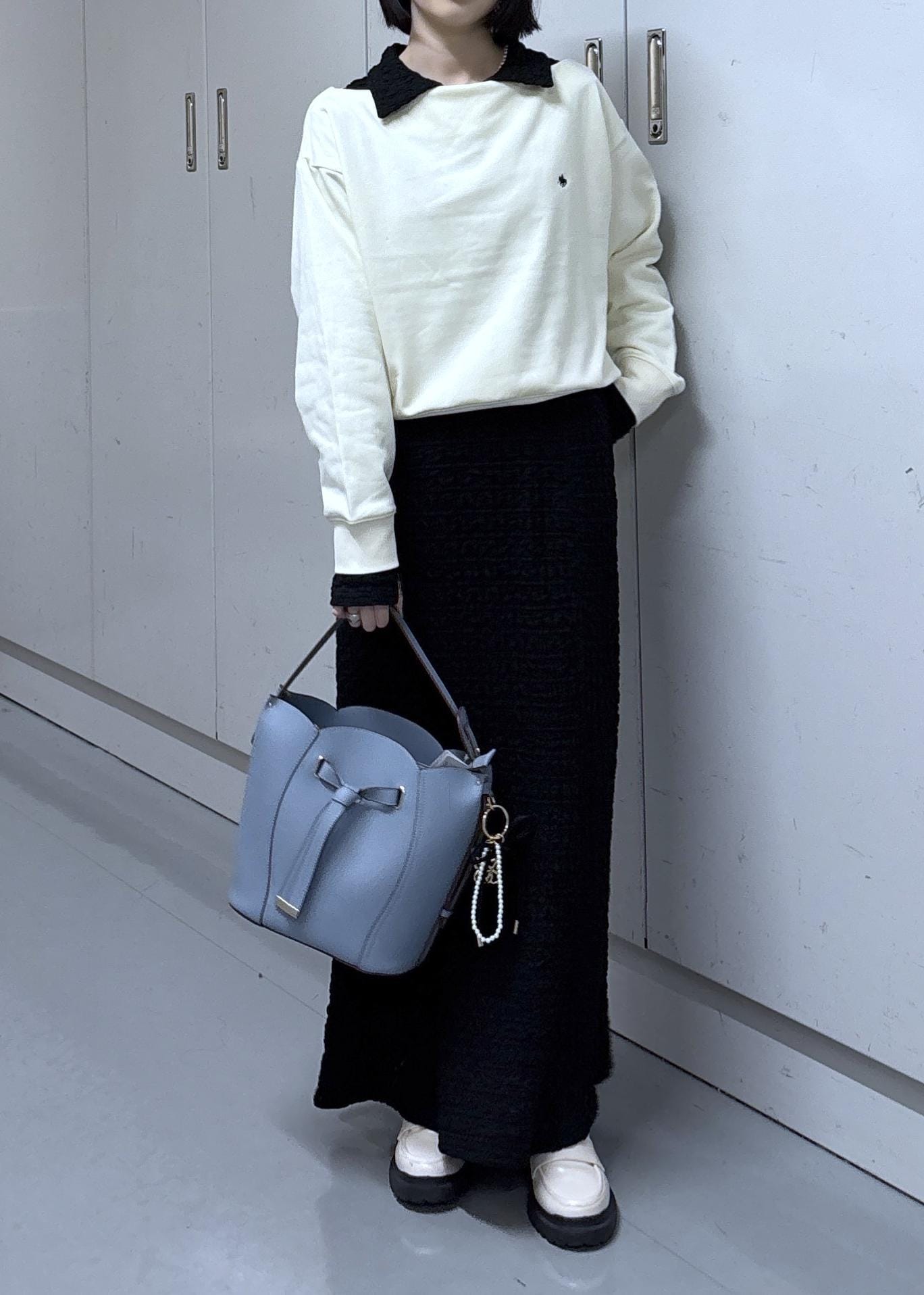 バッグも新色のサックスを合わせて、春に楽しいモノトーン+差し色コーデの完成です!