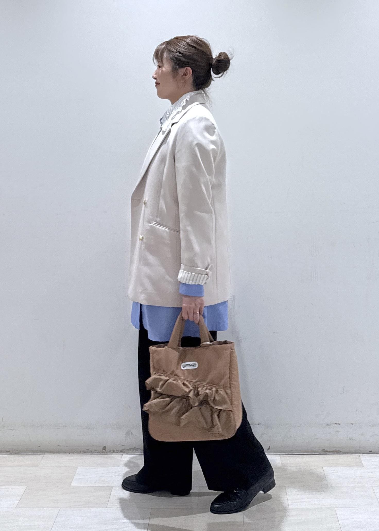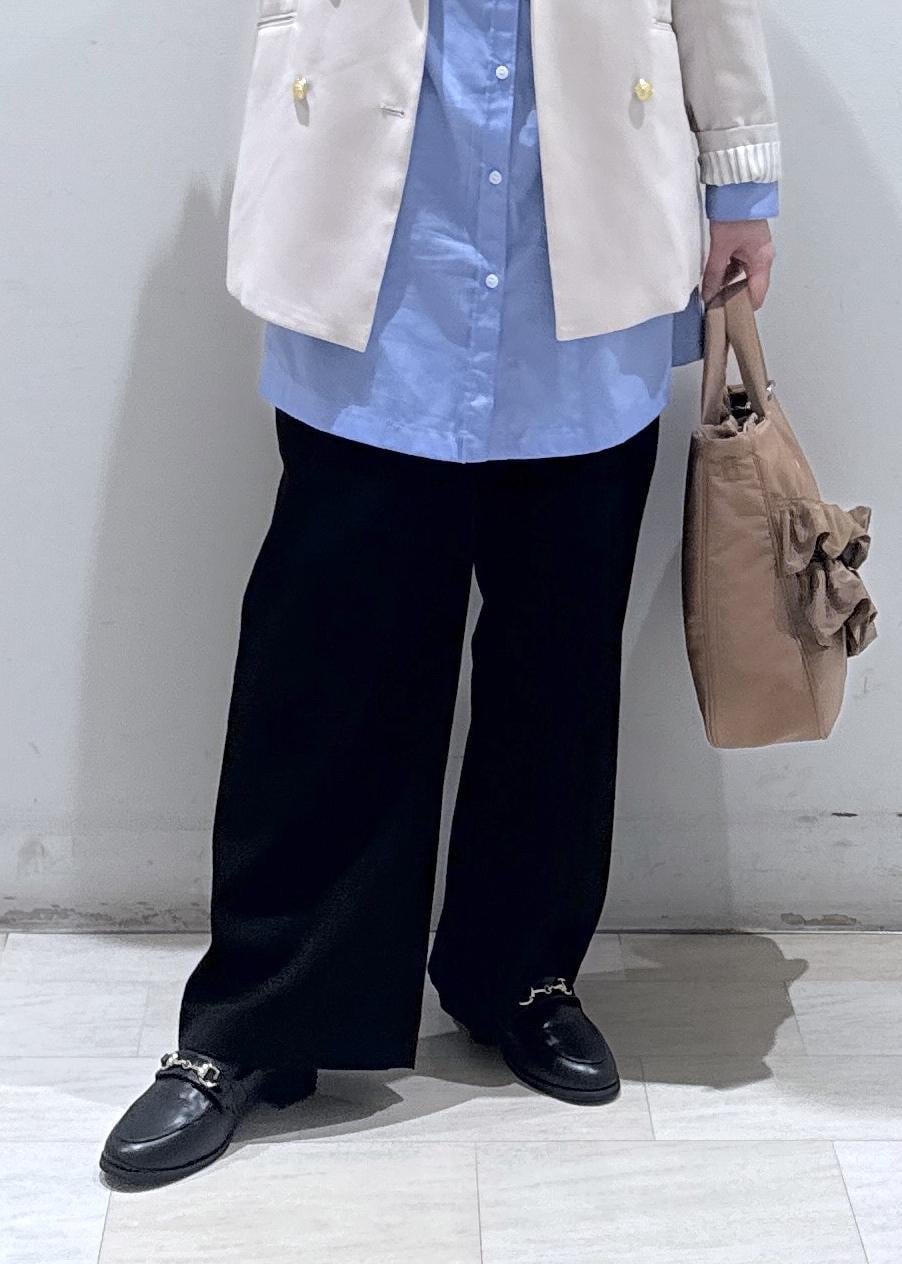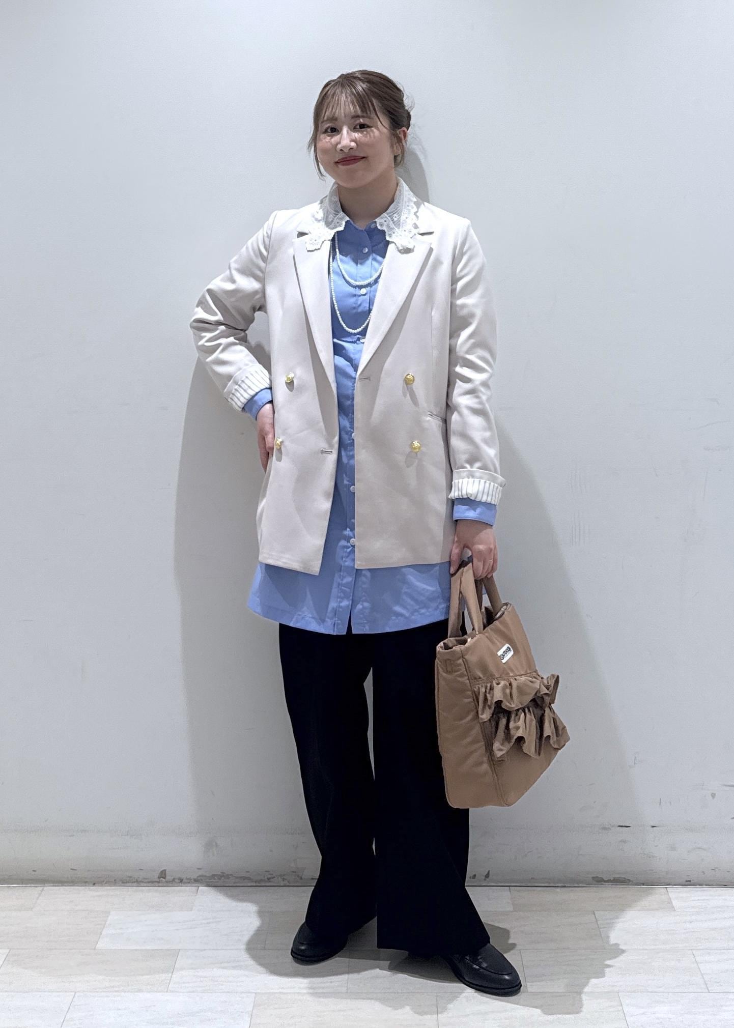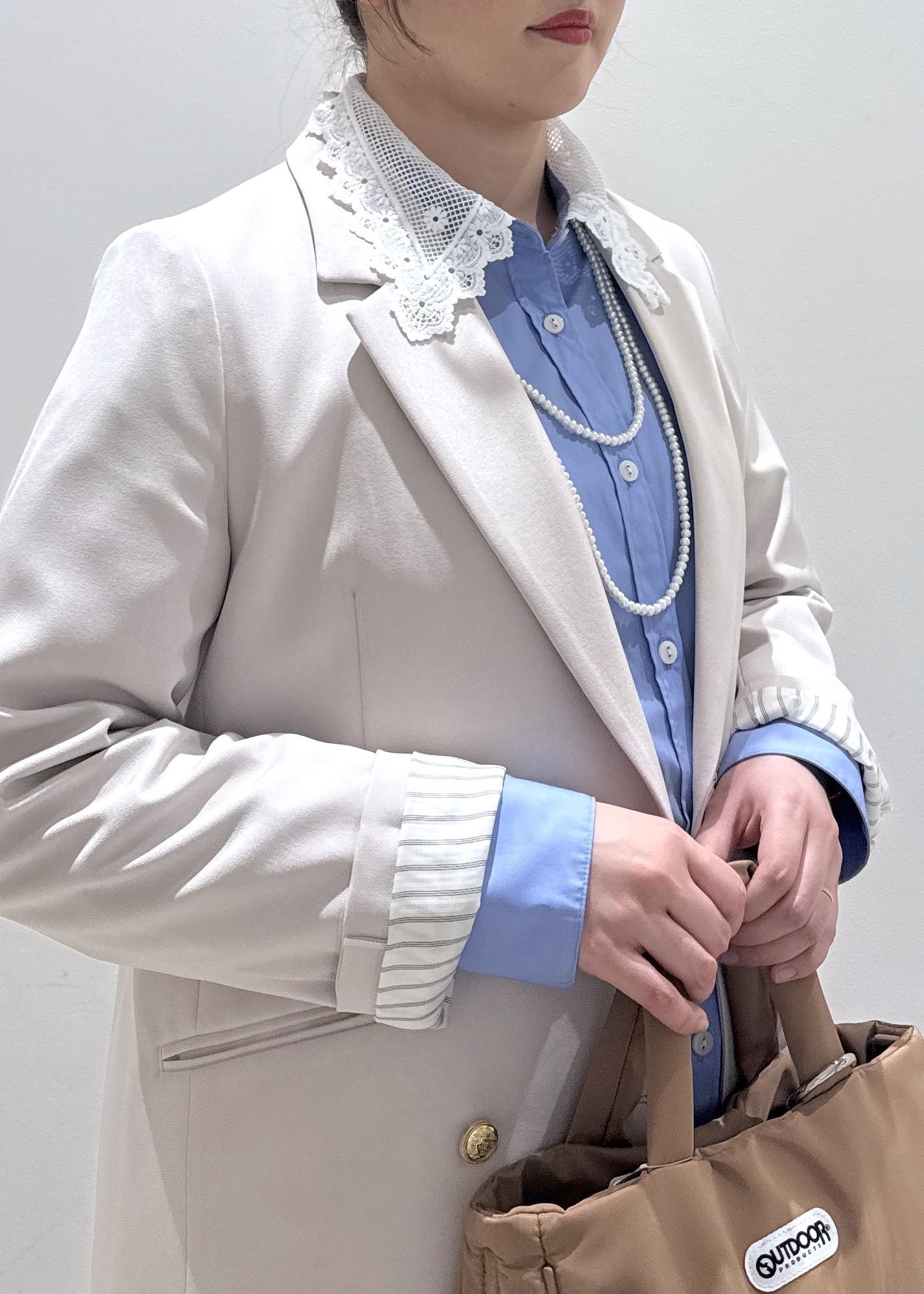 ジャケットはベージュのカラーですが、サックスブルーのカラーとの相性も良くて清潔感のある印象と全体的にスッキリとして見えるのでオススメです。お仕事から普段使いにぜひ真似してみてください♪
