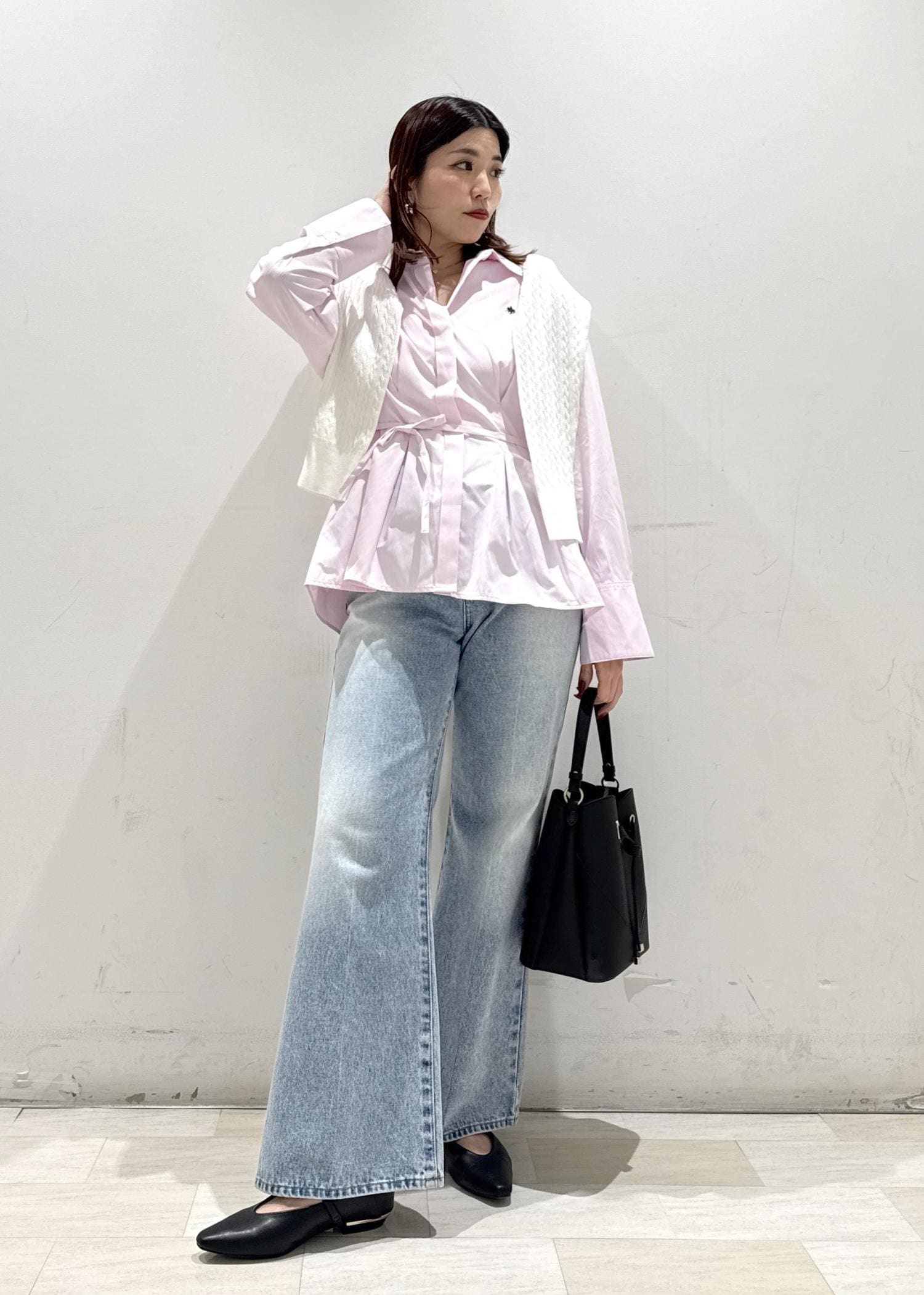 ピンクのシャツ×淡めデニムのカラー合わせは