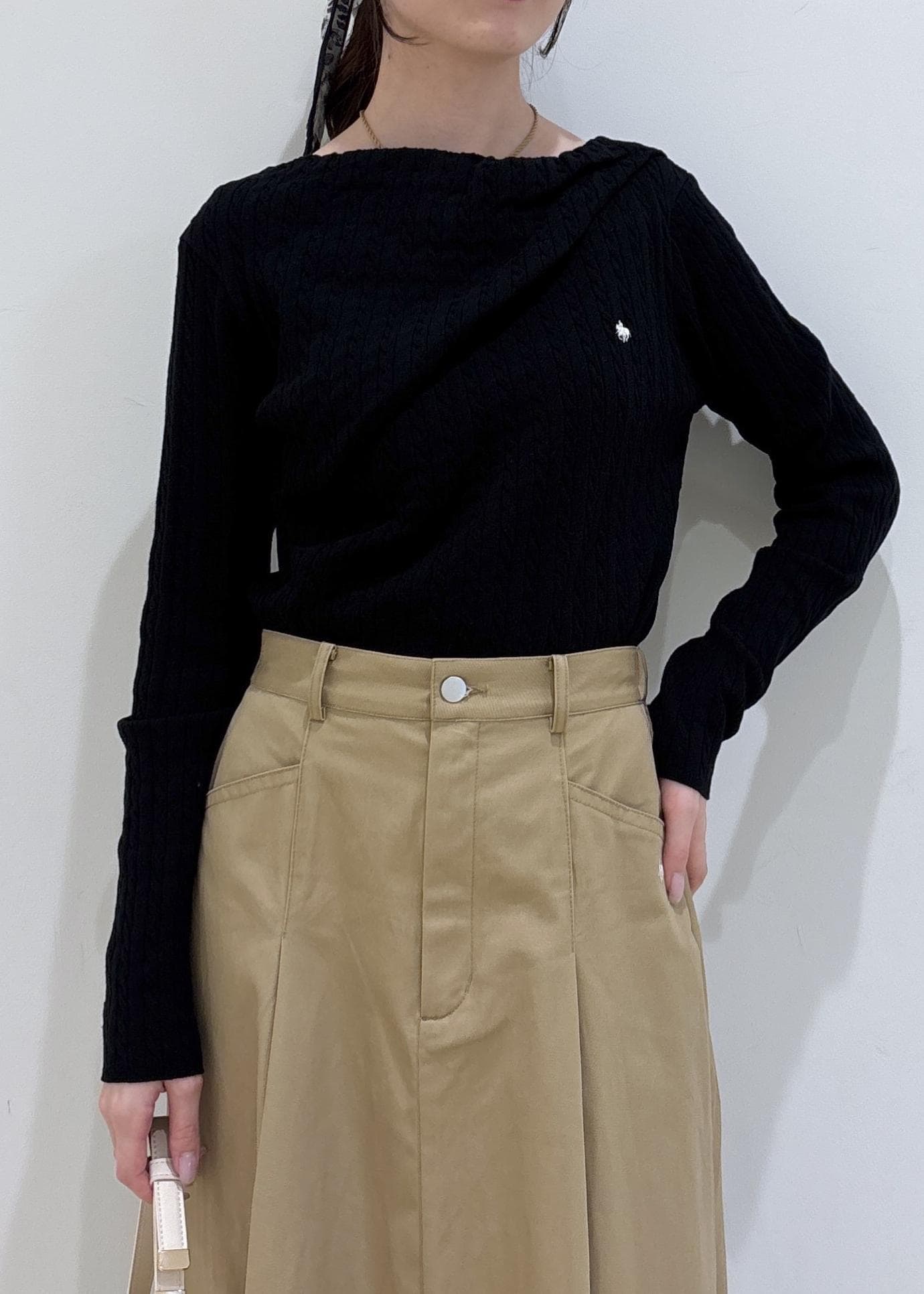 POLO BCSコラボのドレープニットとフレアスカートを合わせたコーディネートです。