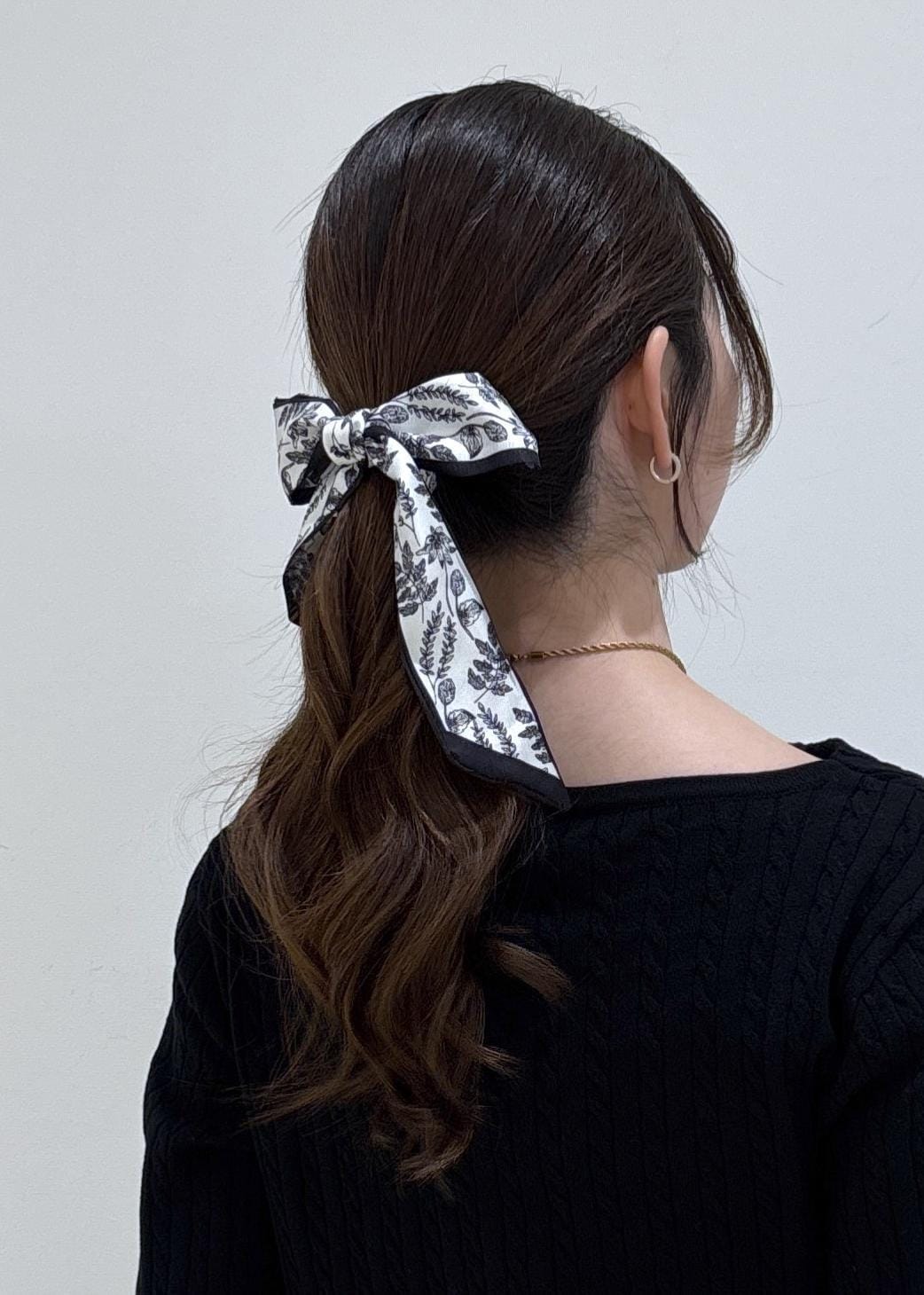 ヘアはアップスタイルにして、ナロースカーフでワンポイントプラスしました!