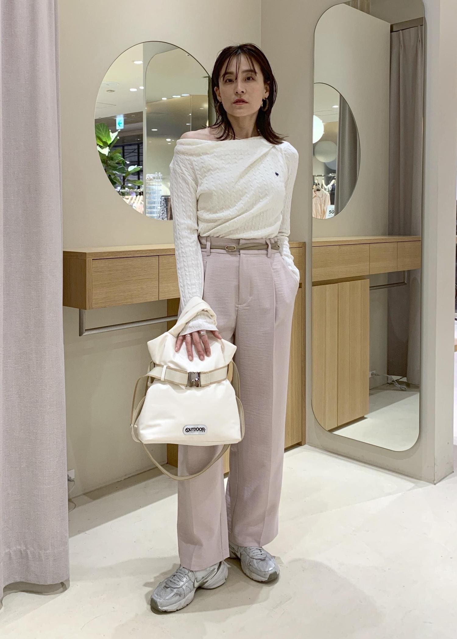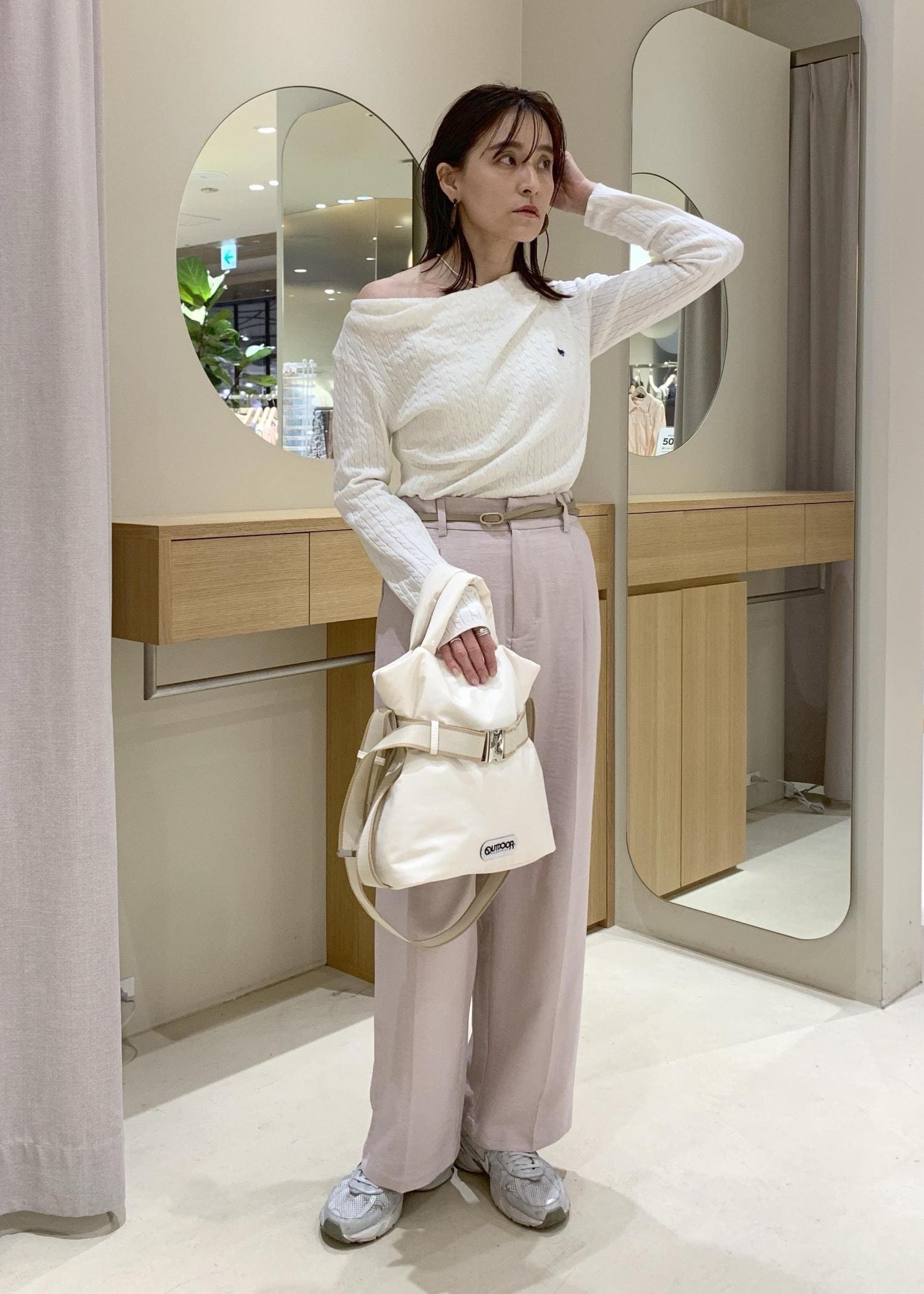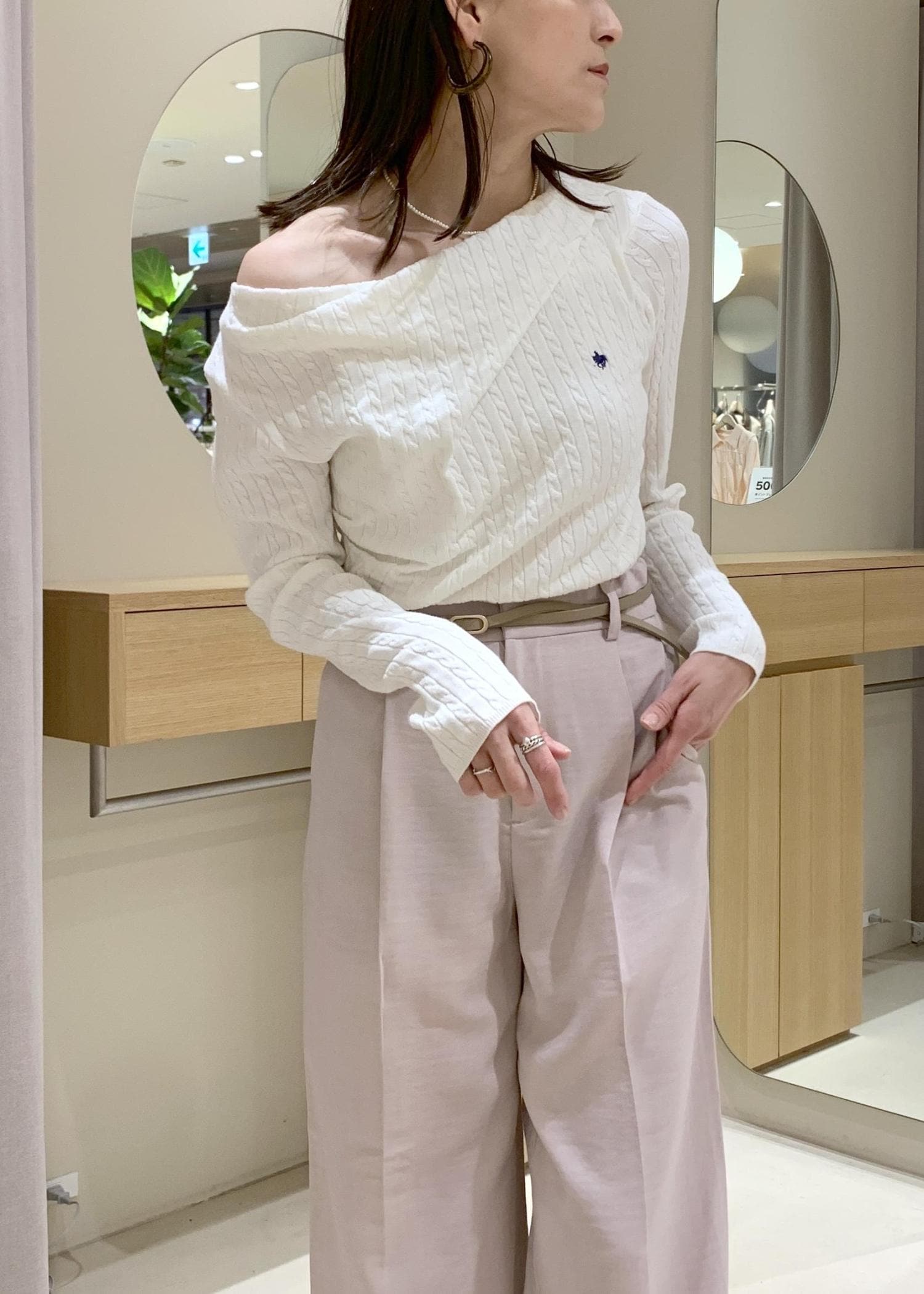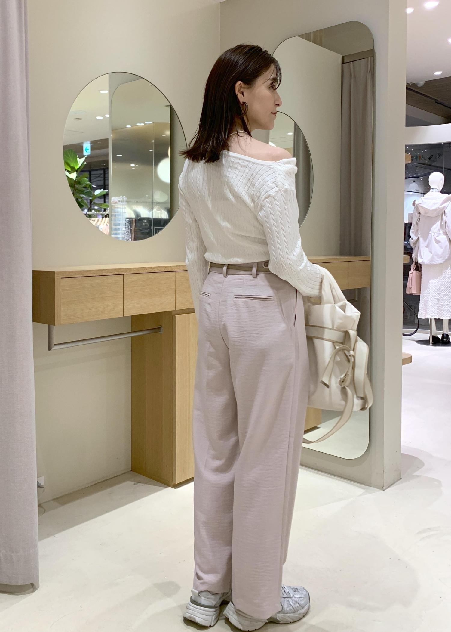 たまにはオフショルダー風に着て、抜け感をだすと女性らしくなりますよ♪