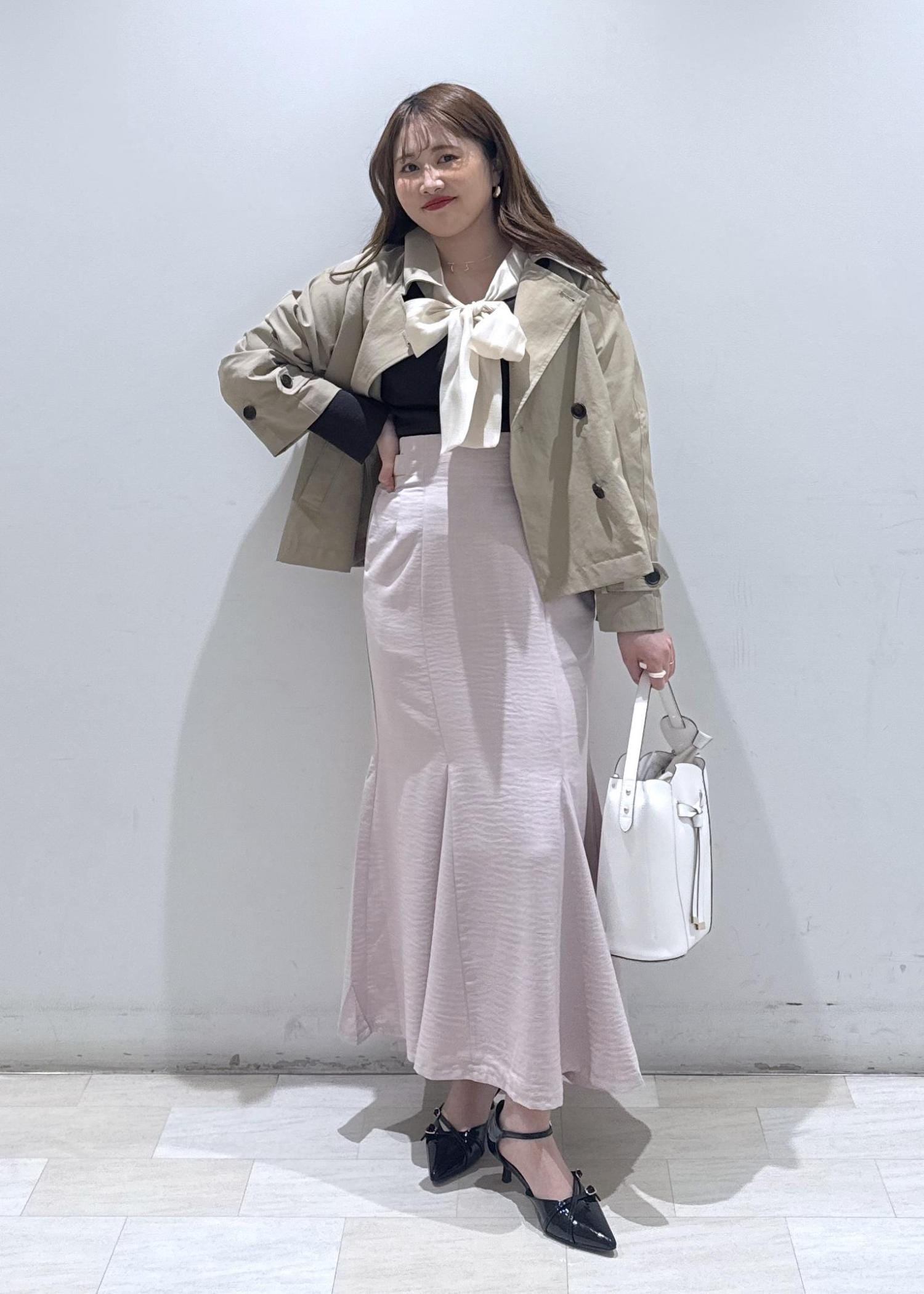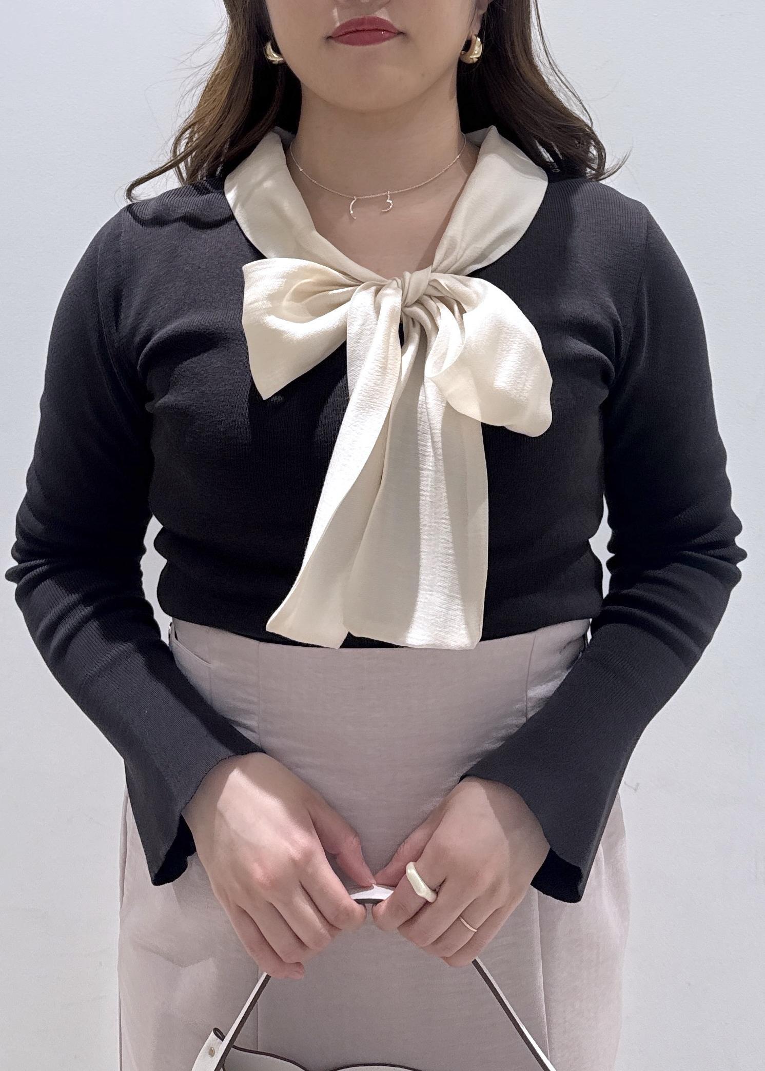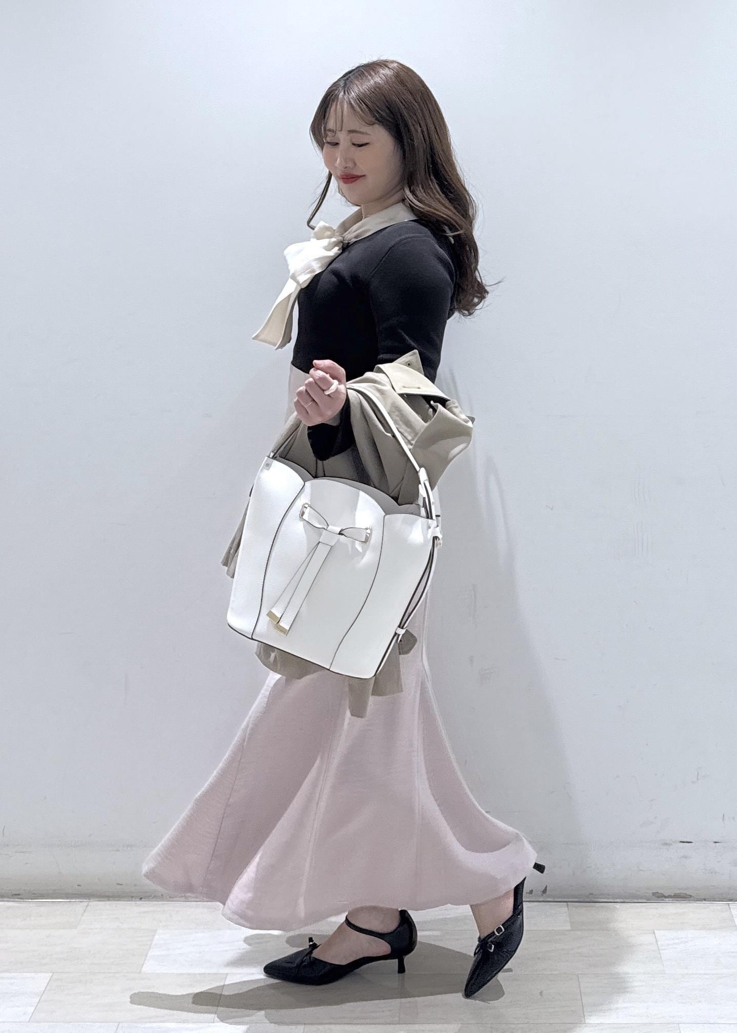 今回は新作で入荷しました、ボウタイ付きのリボンニットのトップスに、スカートと合わせて綺麗めなコーディネートにしてみました♪