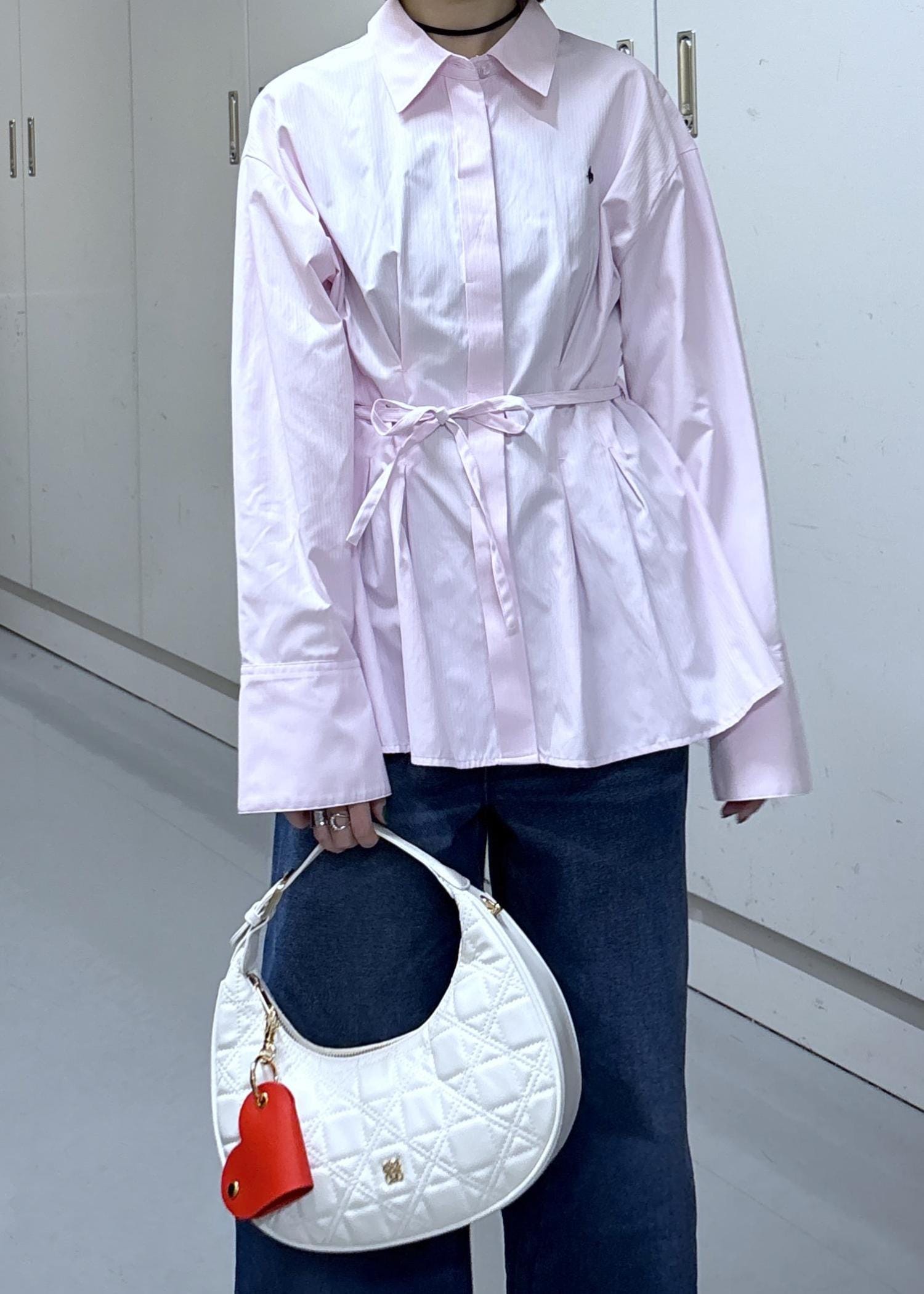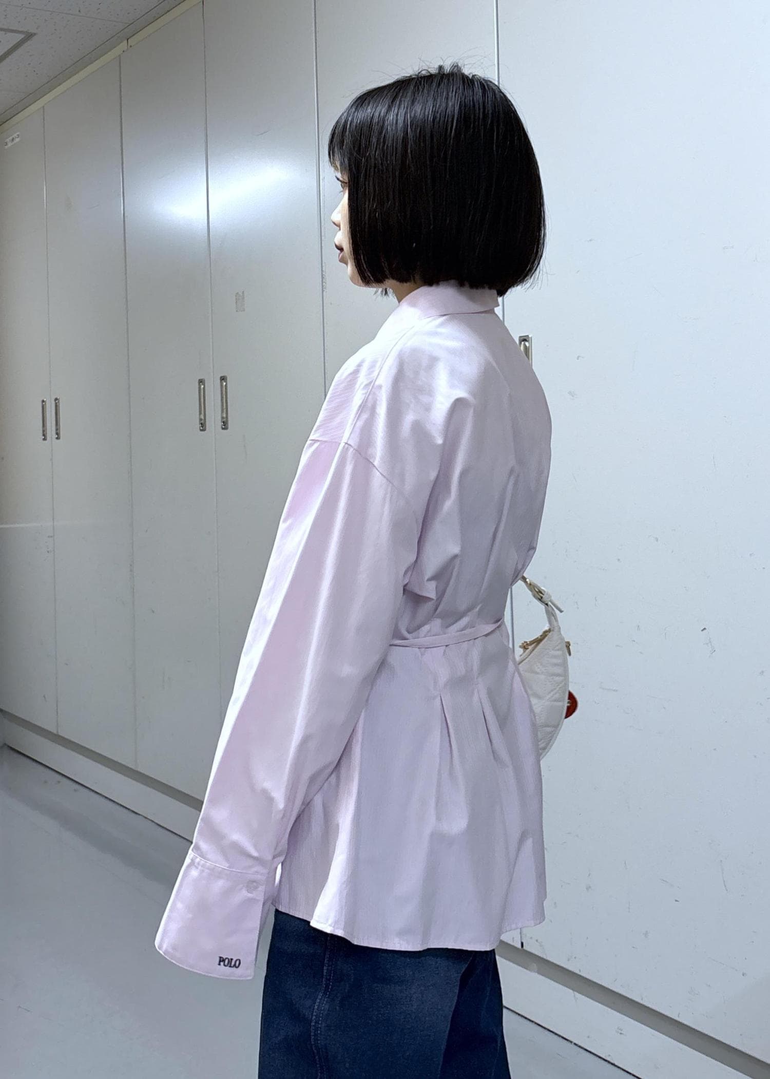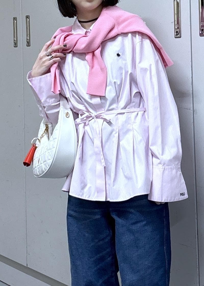 着用しているピンクは、濃すぎず合わせやすい挑戦しやすいカラーで、よく見るとストライプなのもオシャレ!