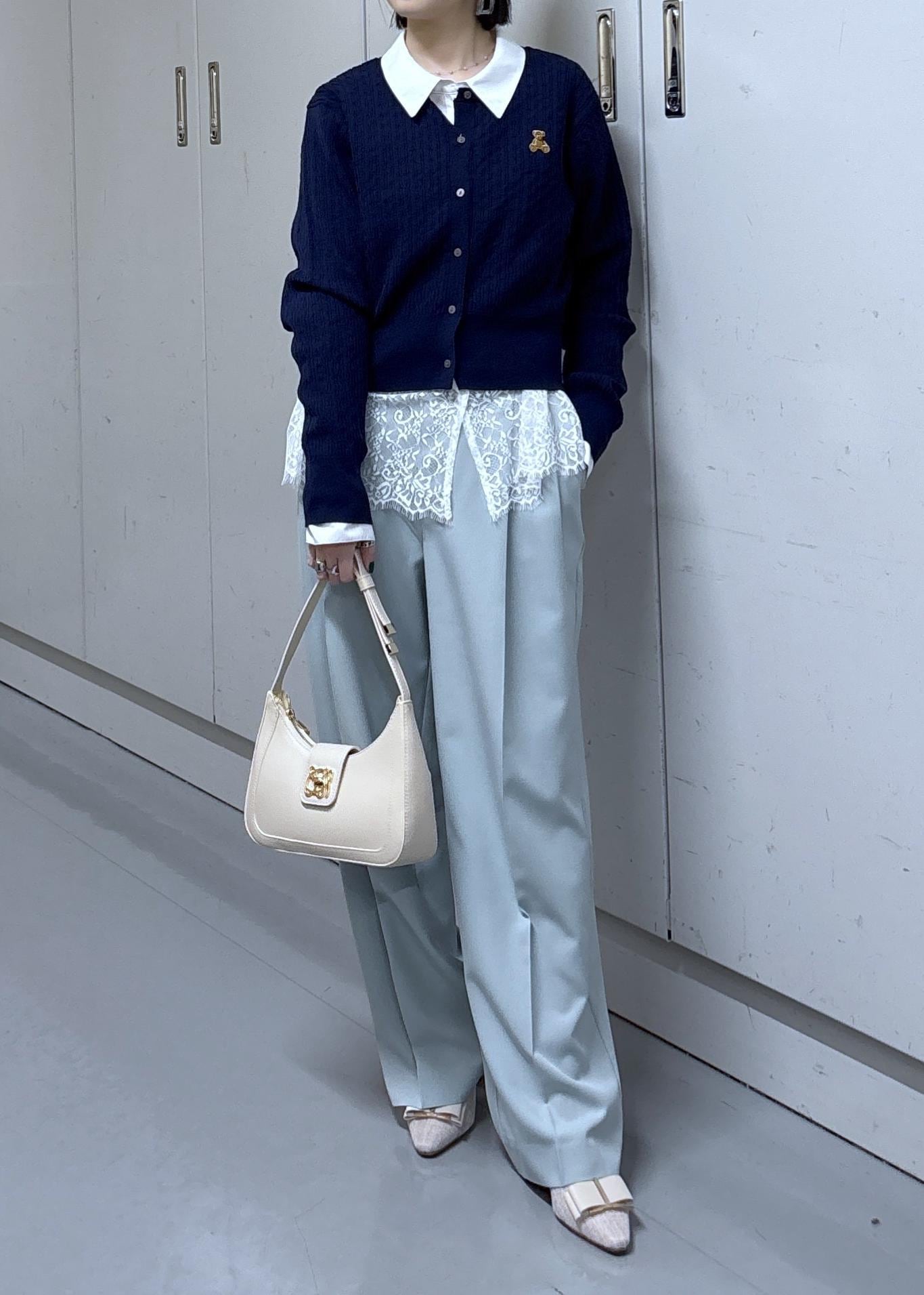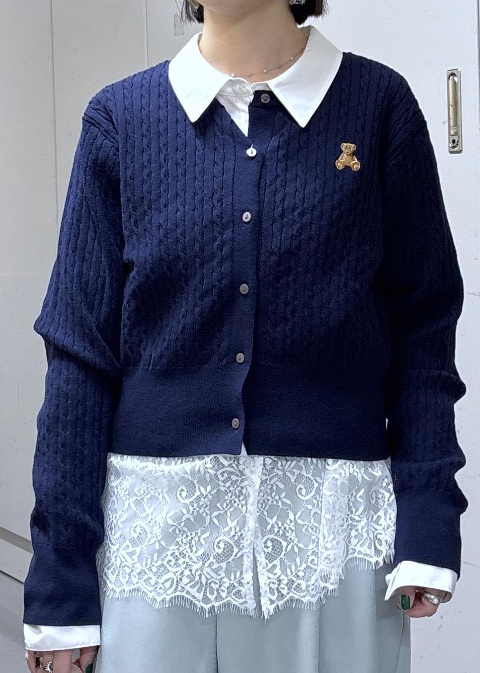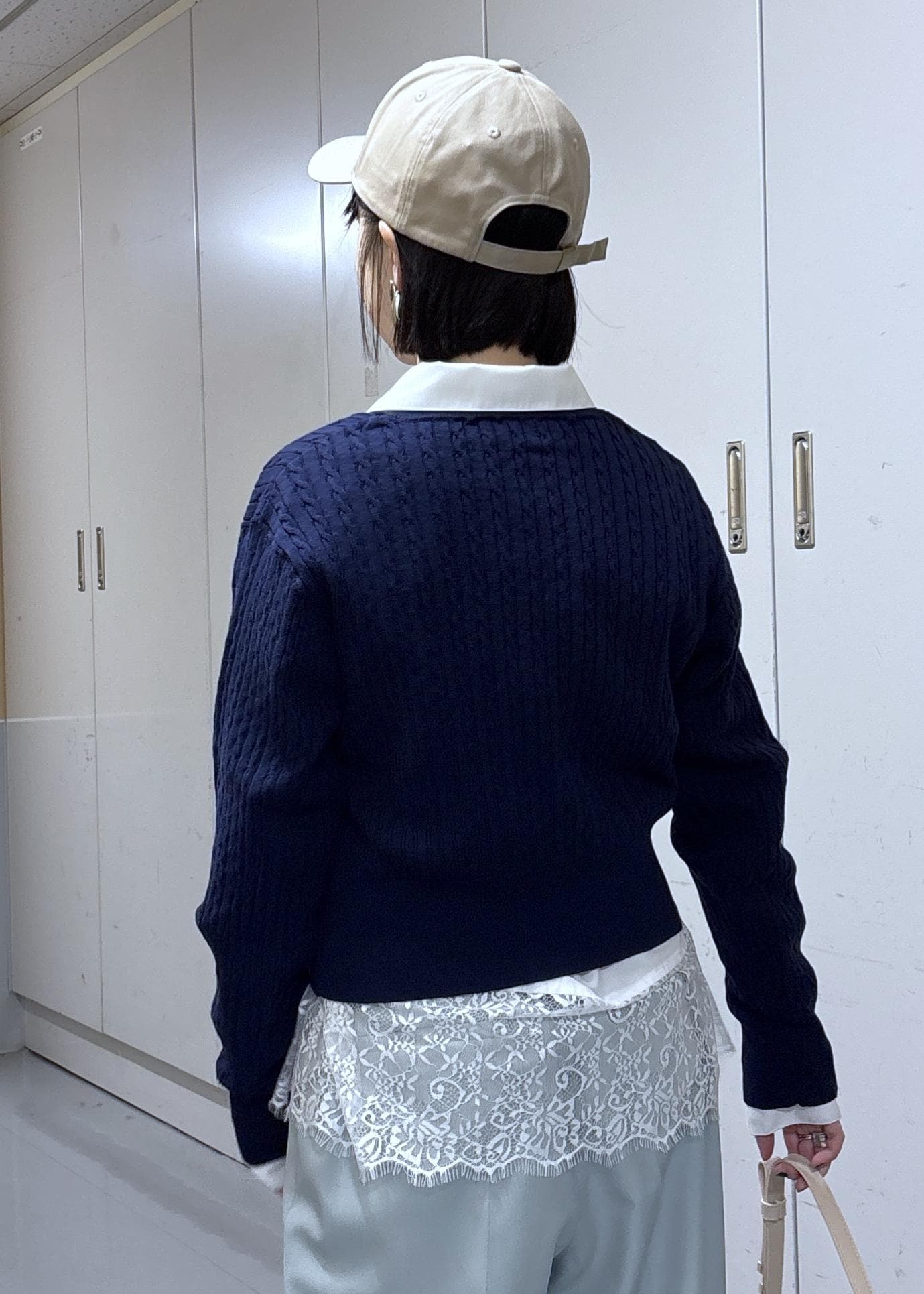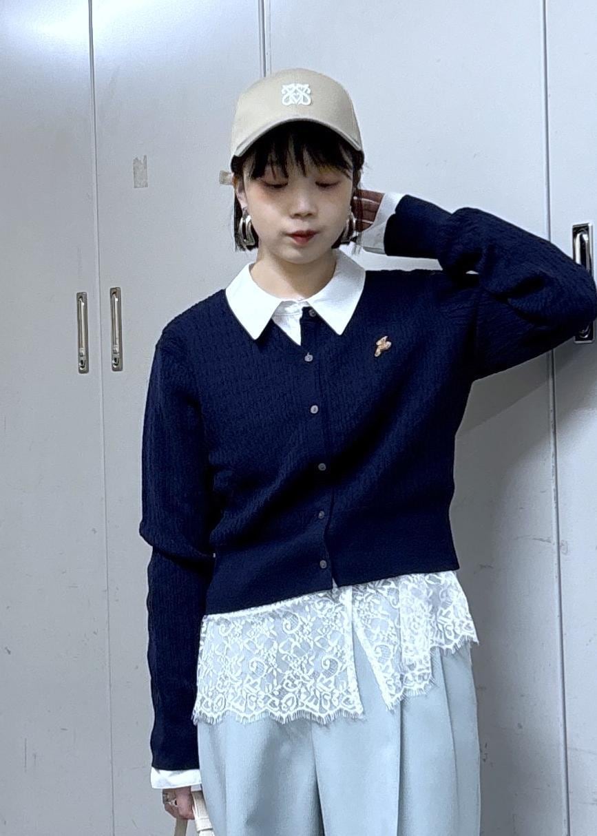 POLO別注カーディガンはコンパクトな丈感なので、裾だけレースのシャツとのレイヤードが映えます♬.*゚