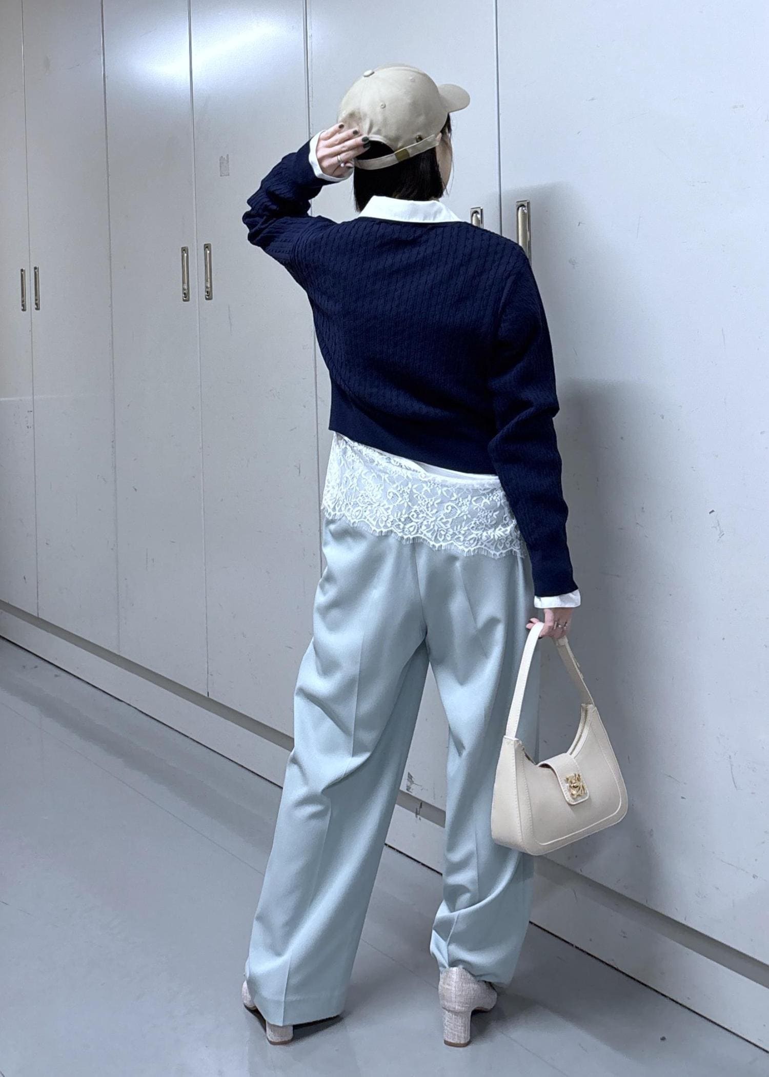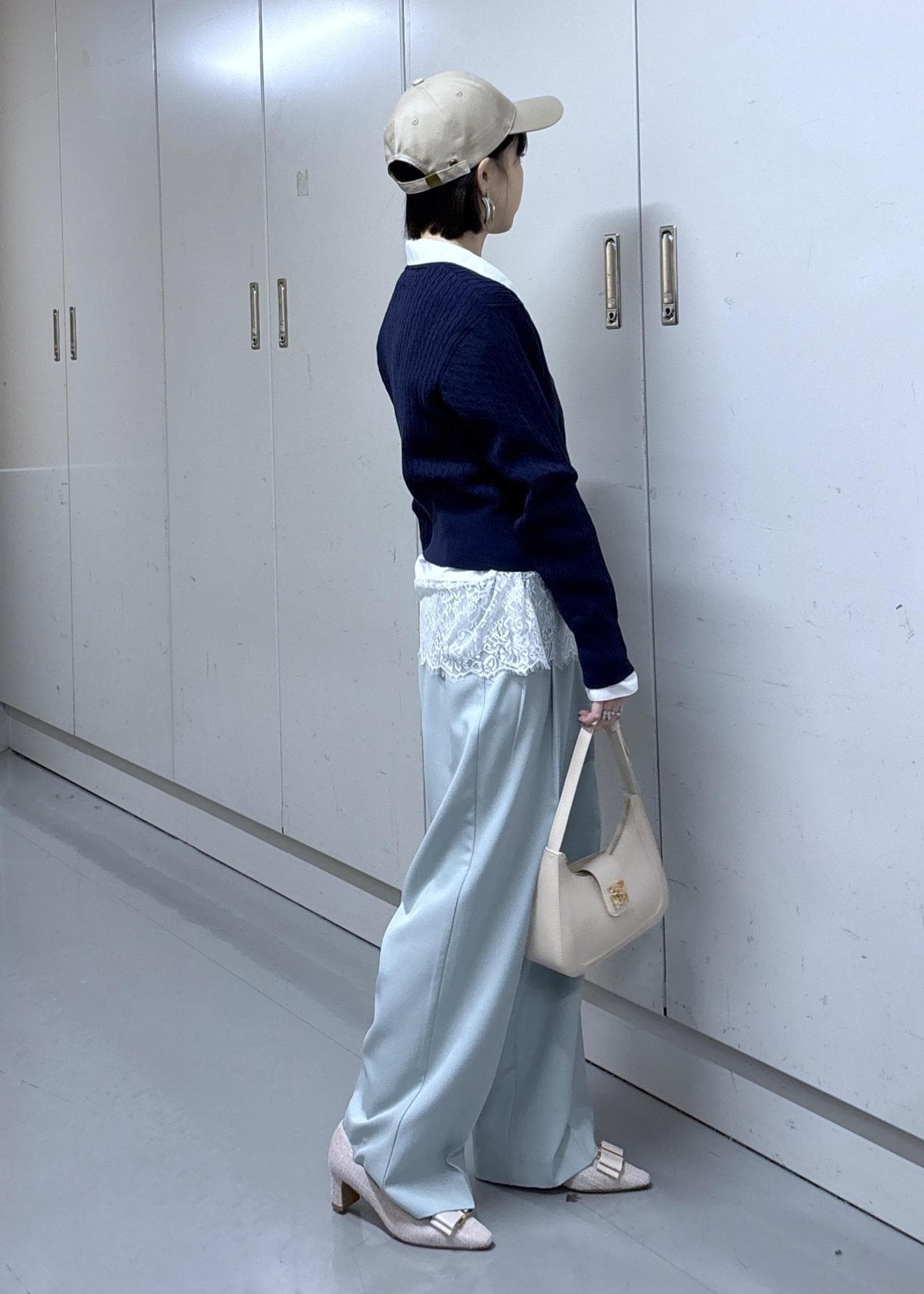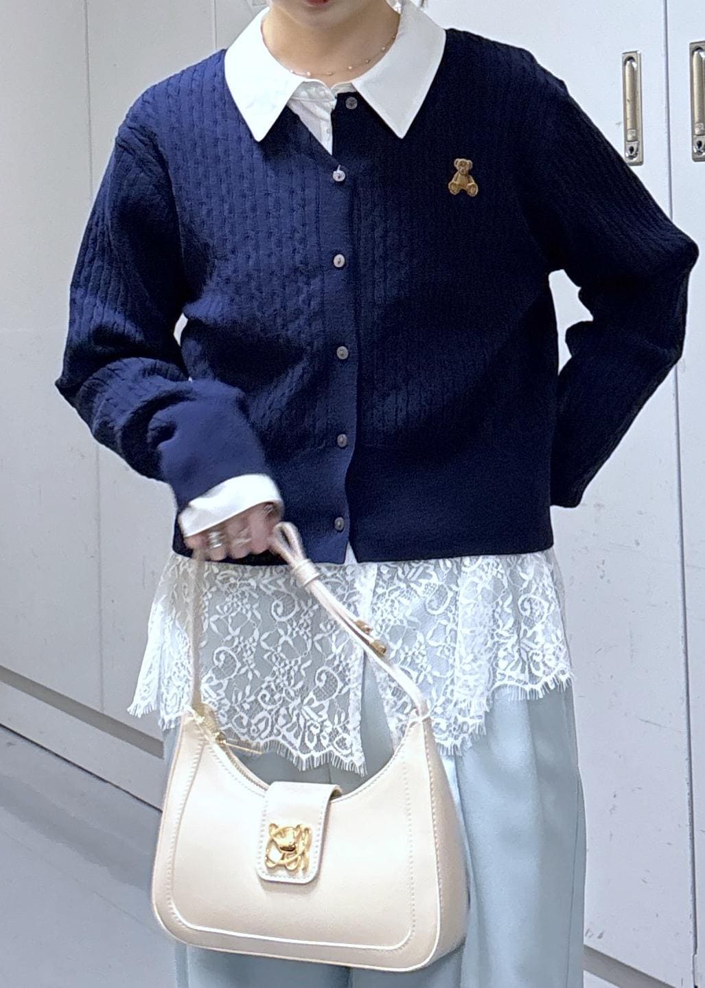POLO別注カーディガンはコンパクトな丈感なので、裾だけレースのシャツとのレイヤードが映えます♬.*゚