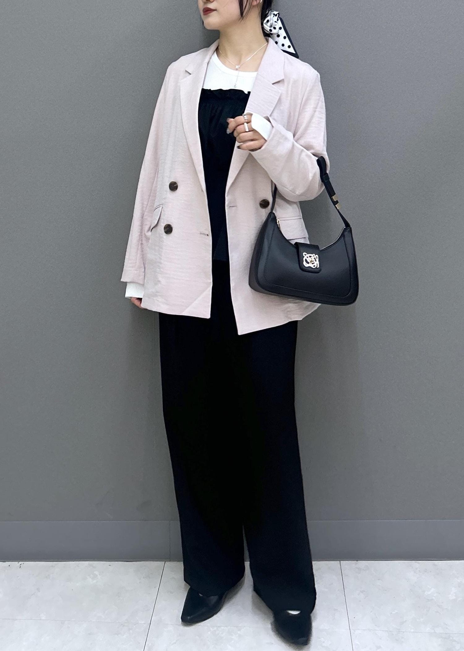 シンプルなスタイリングにはドット柄のスカーフが映えます♡
