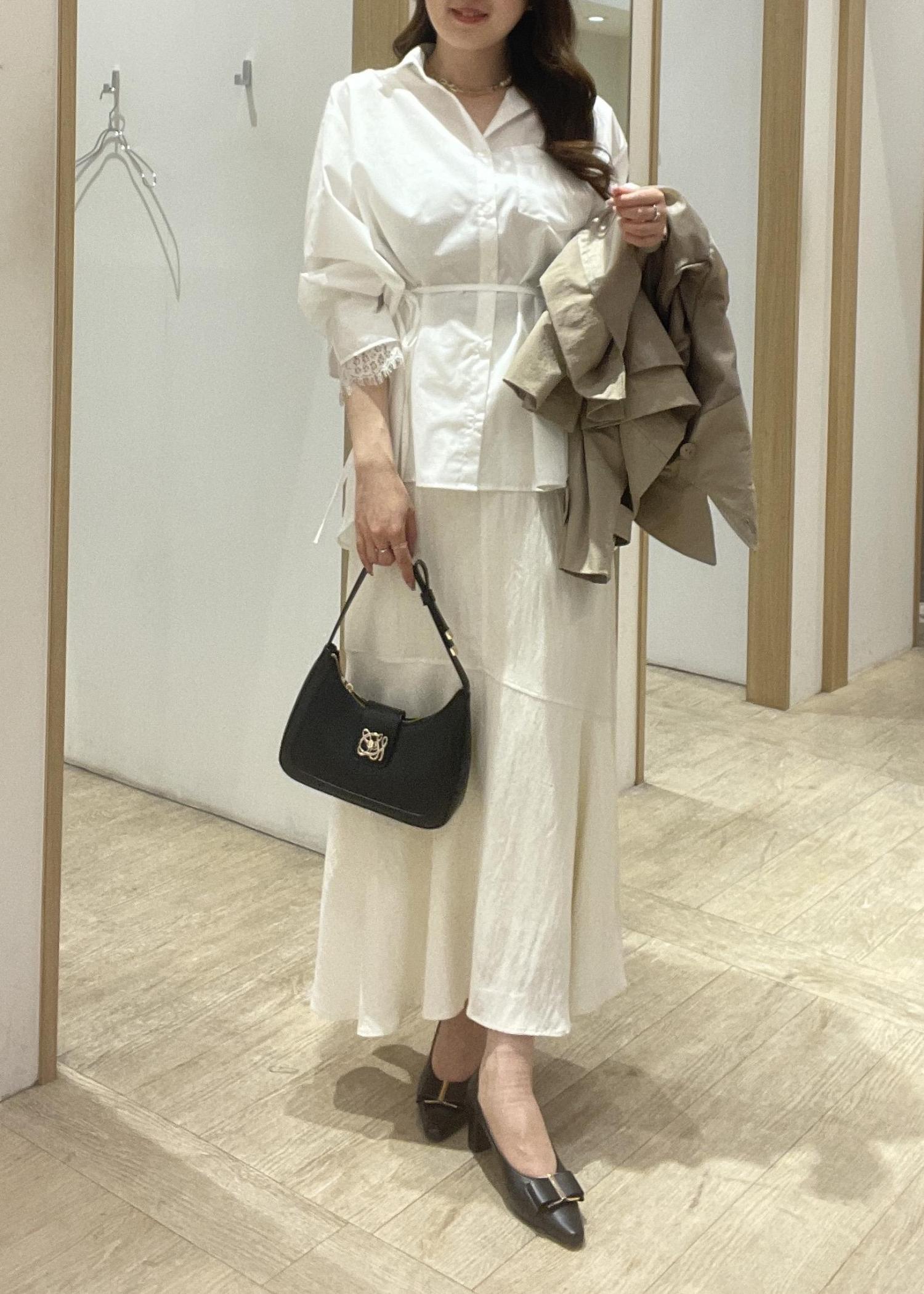 シャツとスカートはホワイトで合わせて春らしく!