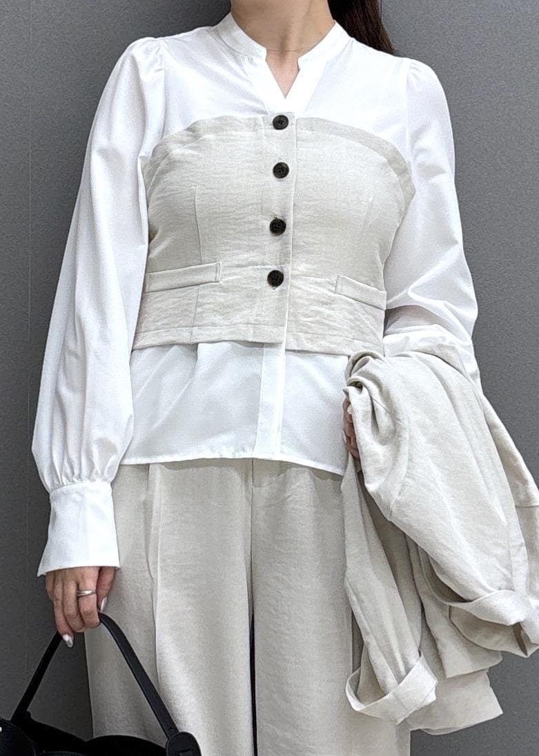 VIS美easy前開きビスチェドッキングシャツ/イージーケア・接触冷感・セットアップ対応キナリ / F¥5,929レビュー骨格ストレートで上半身の厚みが気になる体型ですが、首まわりが詰まっていないのでスッキリ着痩せして見えました!