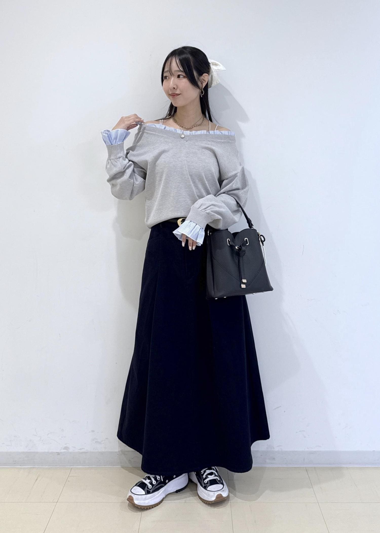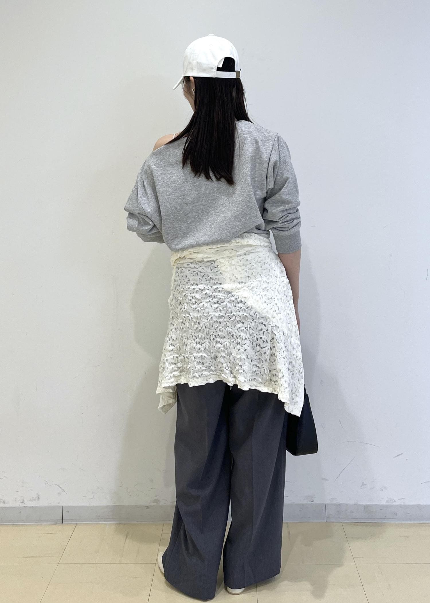 トップスの色に合わせてボトムもグレーで統一させ、